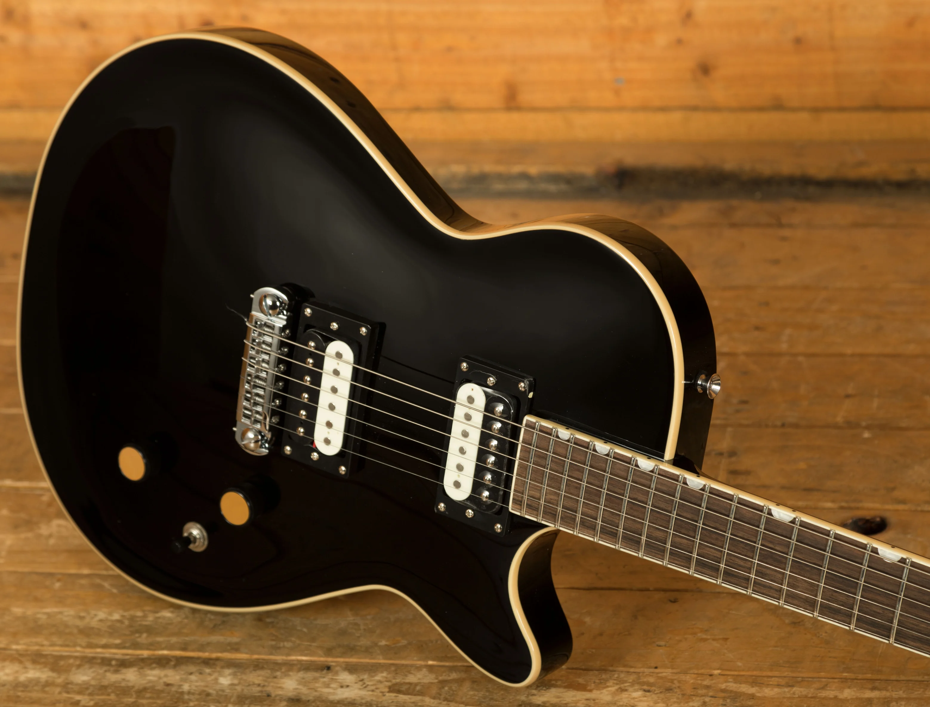 The mahogany neck features a fast "C" profile with tapered shoulders, making it easy to play for a wide range of guitarists, including beginners and those with smaller hands. Its 24.875" scale length strikes a comfortable balance between string tension and playability, while the 12" radius bound laurel fingerboard with 22 medium jumbo frets allows for smooth bends and accurate intonation. Pearloid Neo Classic Thumbnail inlays give the instrument a professional look, while high-quality fretwork enhances precision and comfort across the neck.