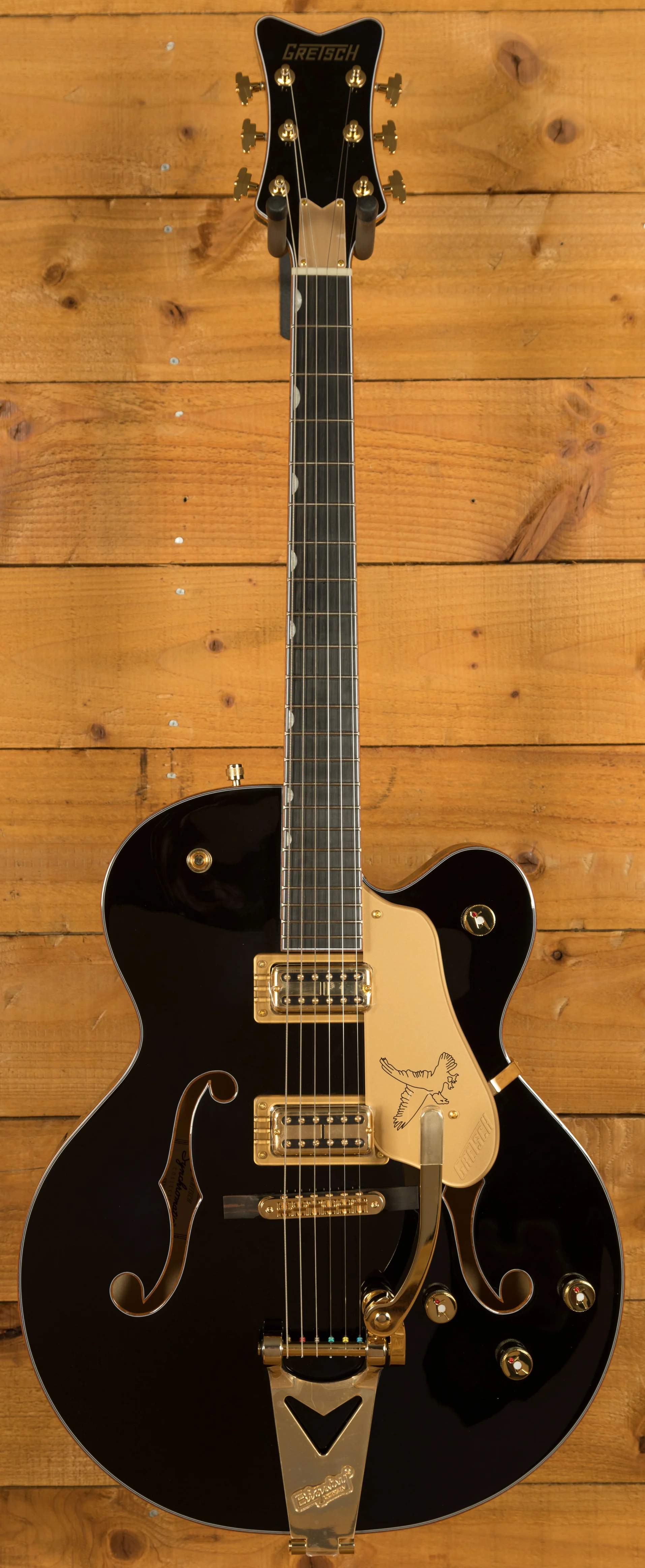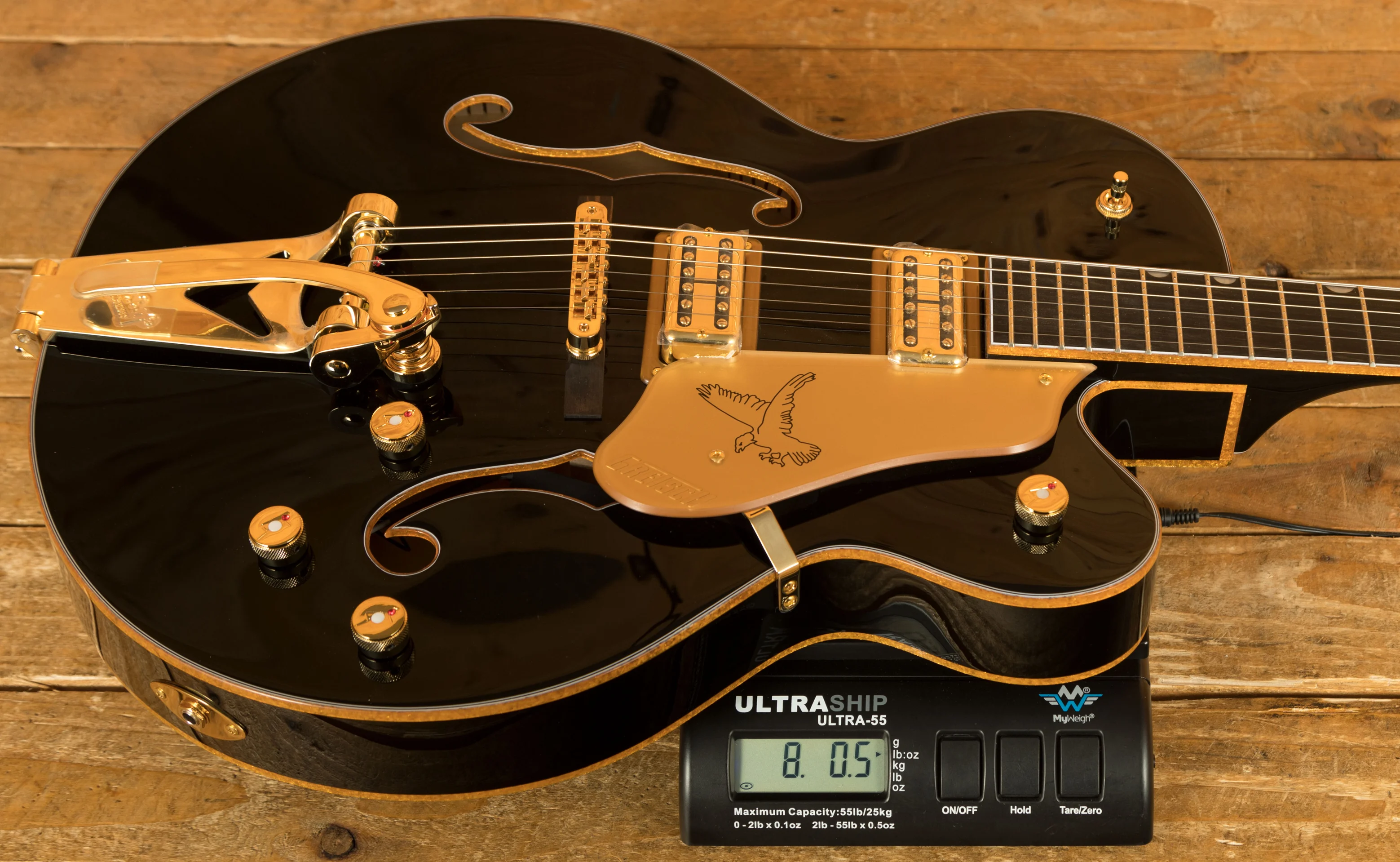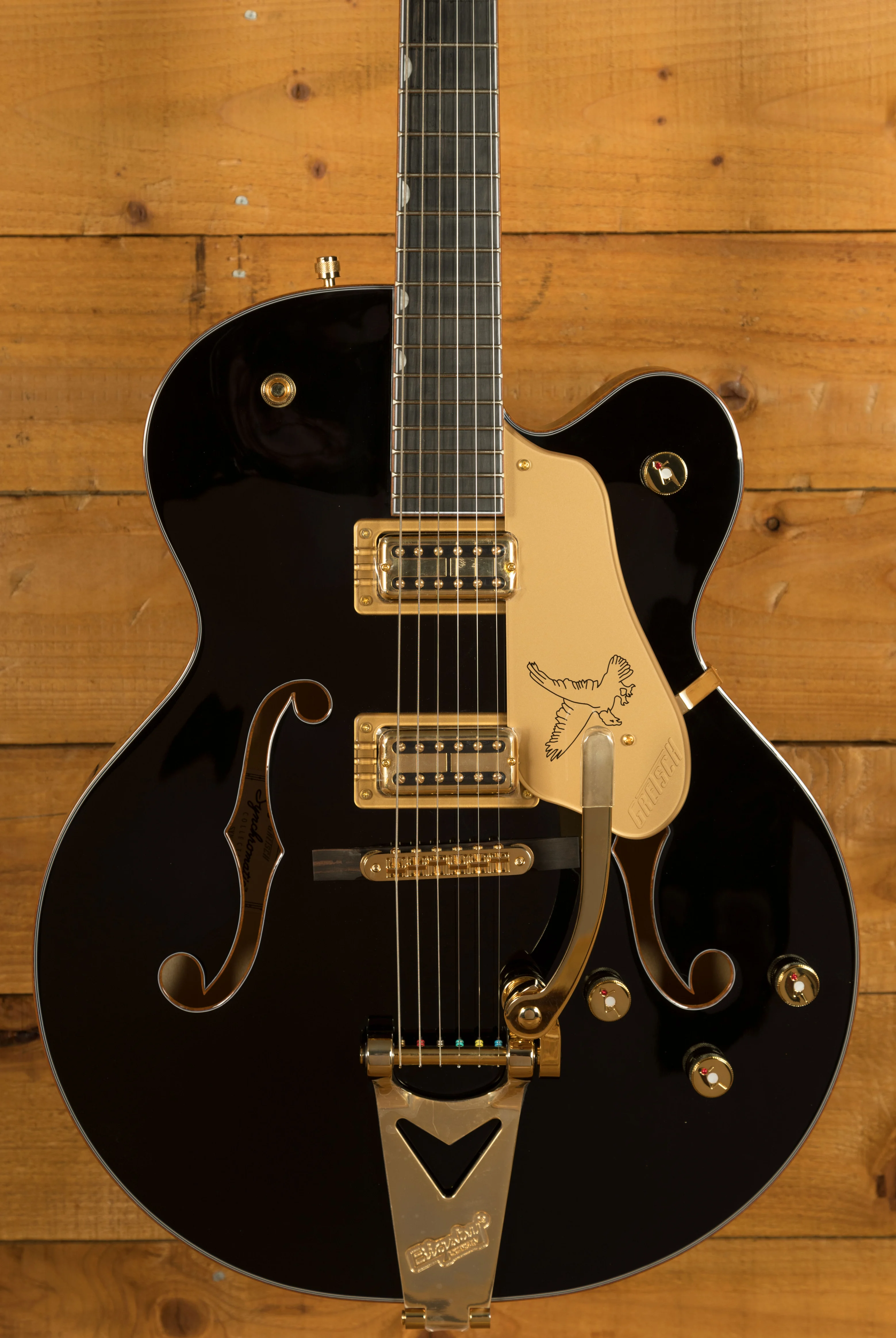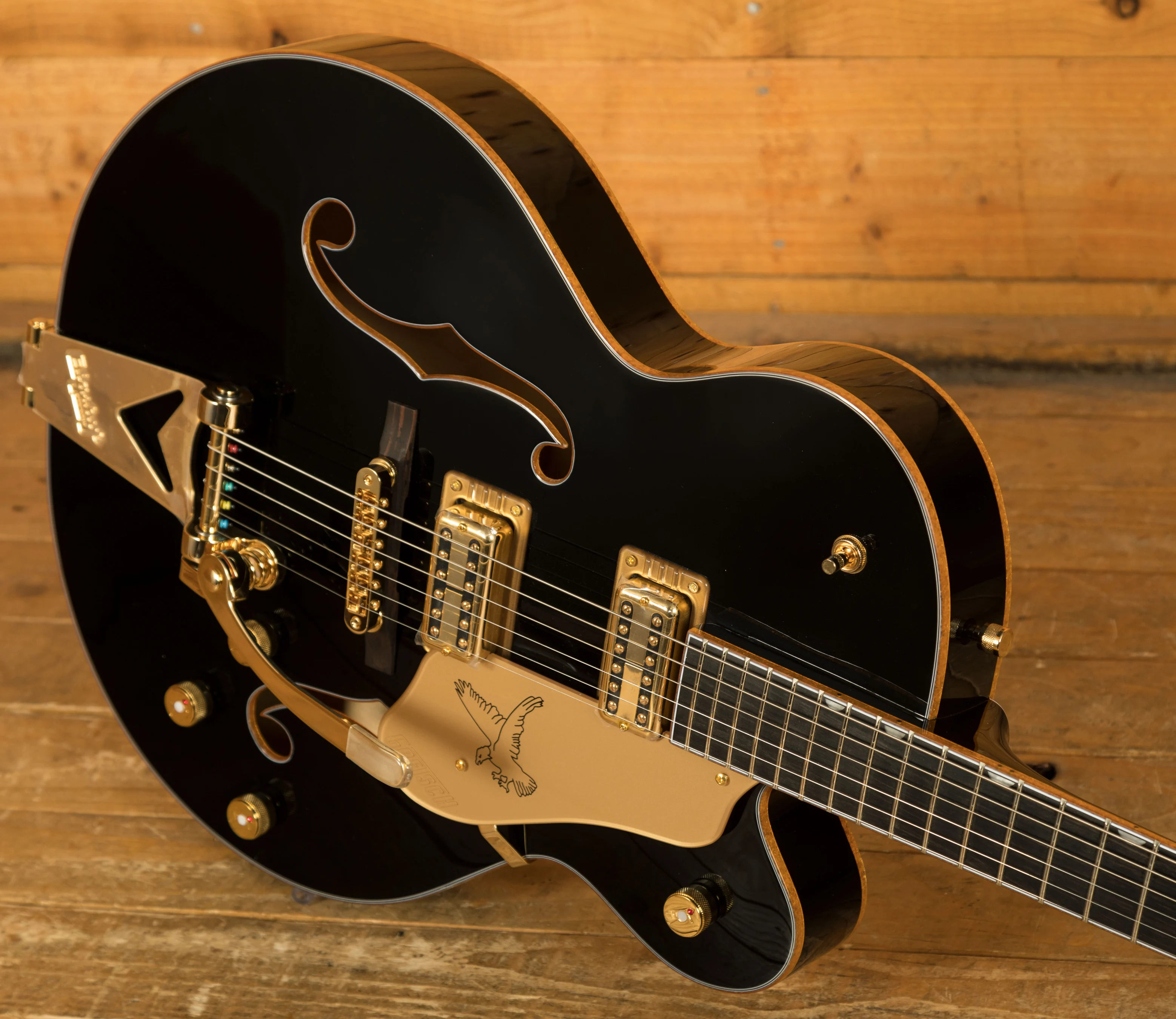 Additional premium features include multi-ply gold sparkle binding on the body, neck, and headstock, enhancing both durability and visual appeal. The Bigsby B60 V-Cutout vibrato tailpiece offers expressive pitch modulation, while the Adjusto-Matic bridge with a secured ebony base ensures tuning stability and precise intonation. To complete the package, the Synchromatic Falcon comes with a deluxe hardshell case, providing reliable protection for transport and storage.