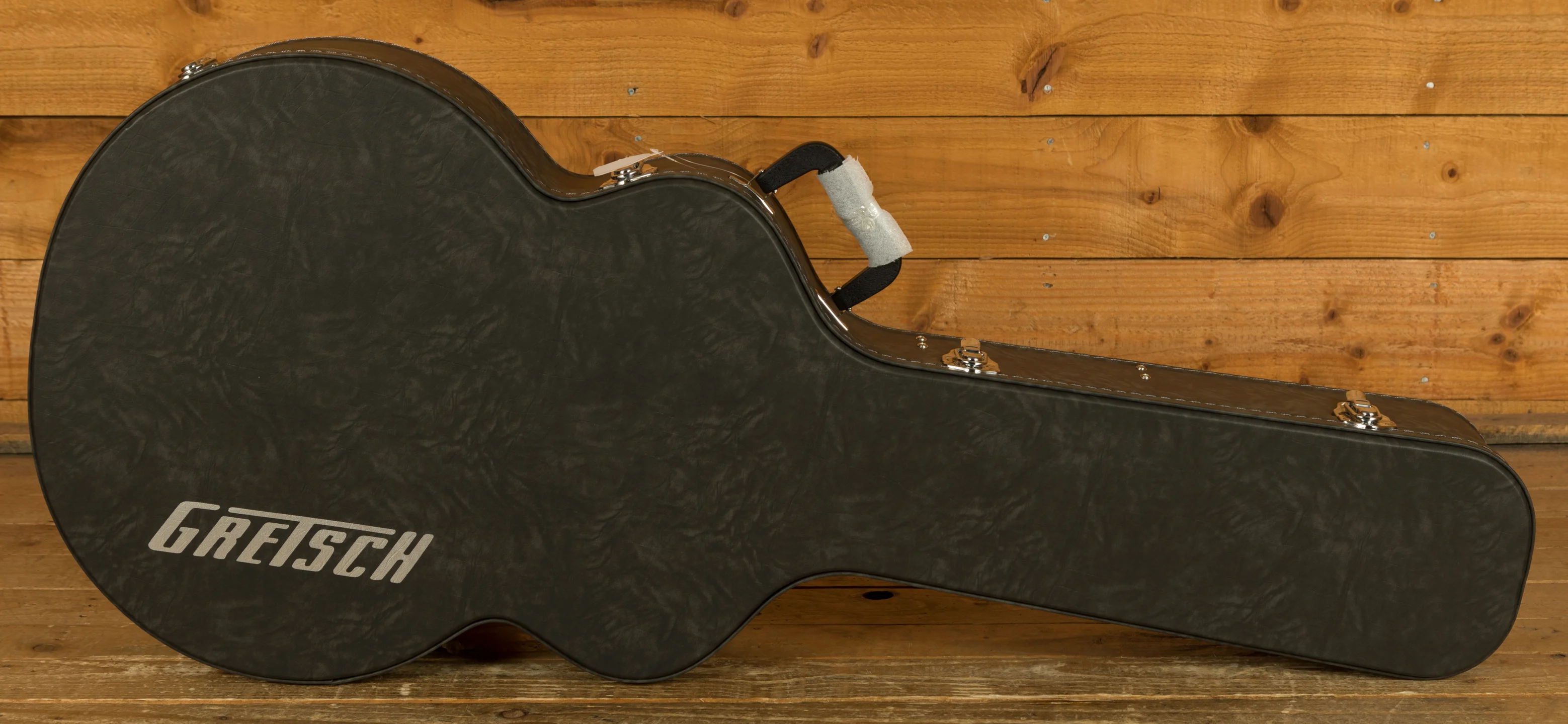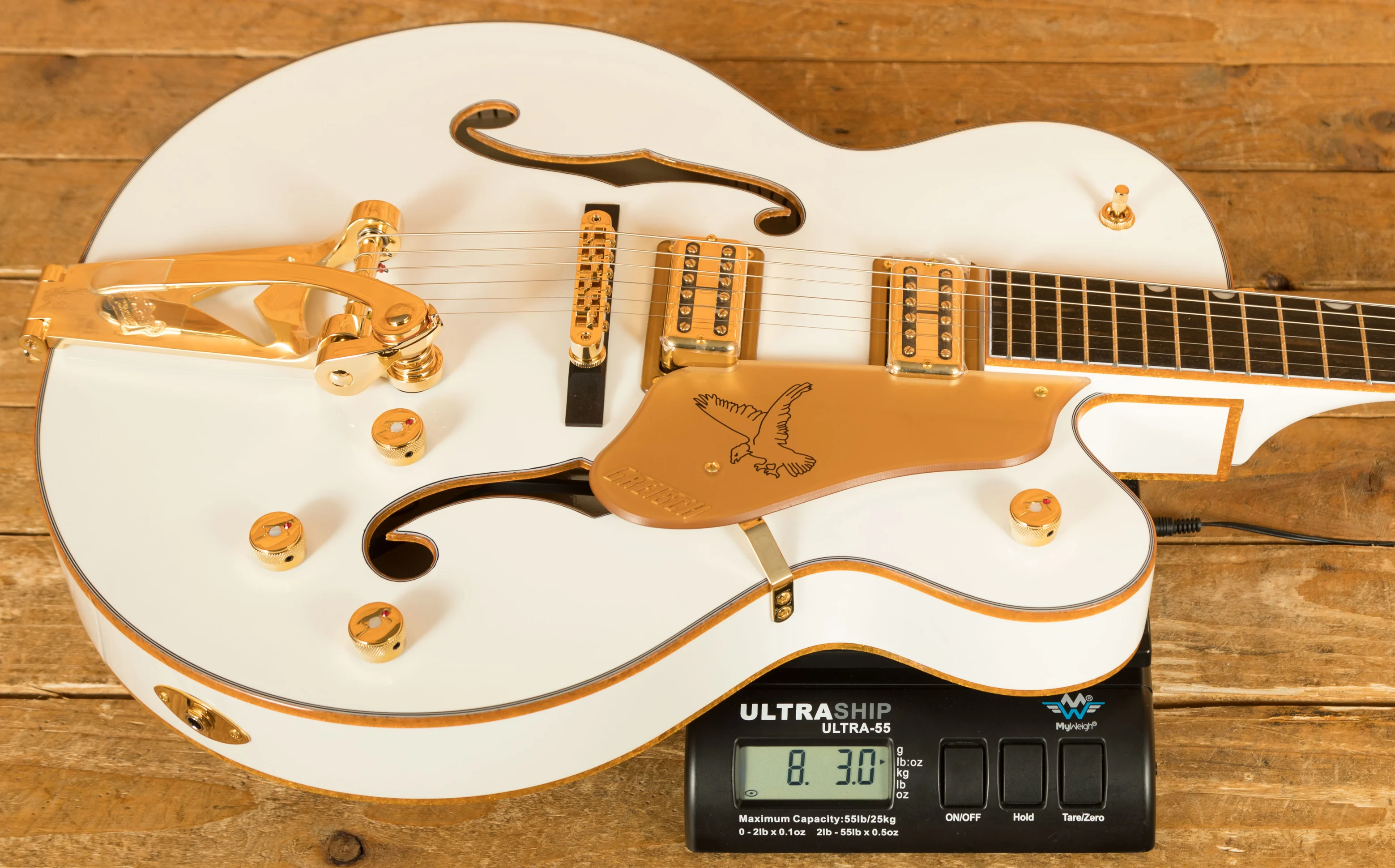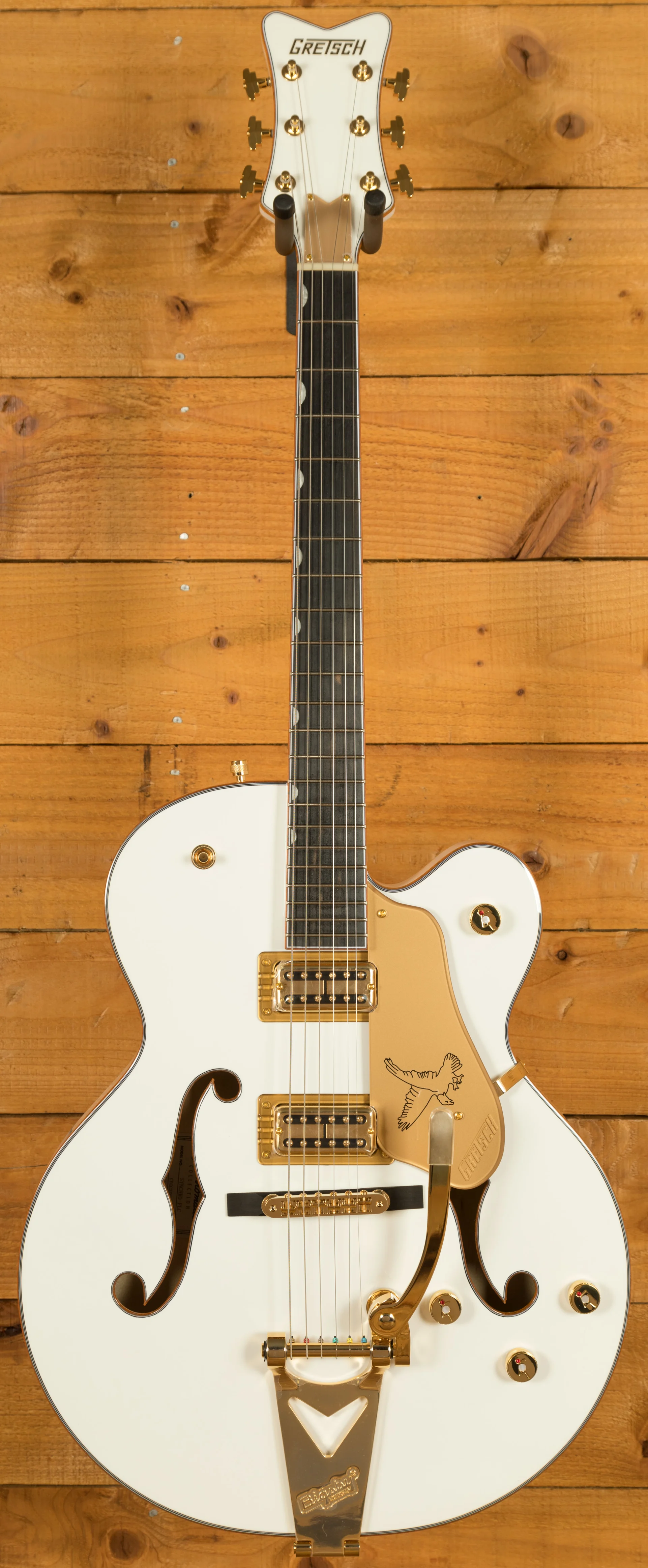 Additional premium features include multi-ply gold sparkle binding on the body, neck, and headstock, enhancing both durability and visual appeal. The Bigsby B60 V-Cutout vibrato tailpiece offers expressive pitch modulation, while the Adjusto-Matic bridge with a secured ebony base ensures tuning stability and precise intonation. To complete the package, the Synchromatic Falcon comes with a deluxe hardshell case, providing reliable protection for transport and storage.