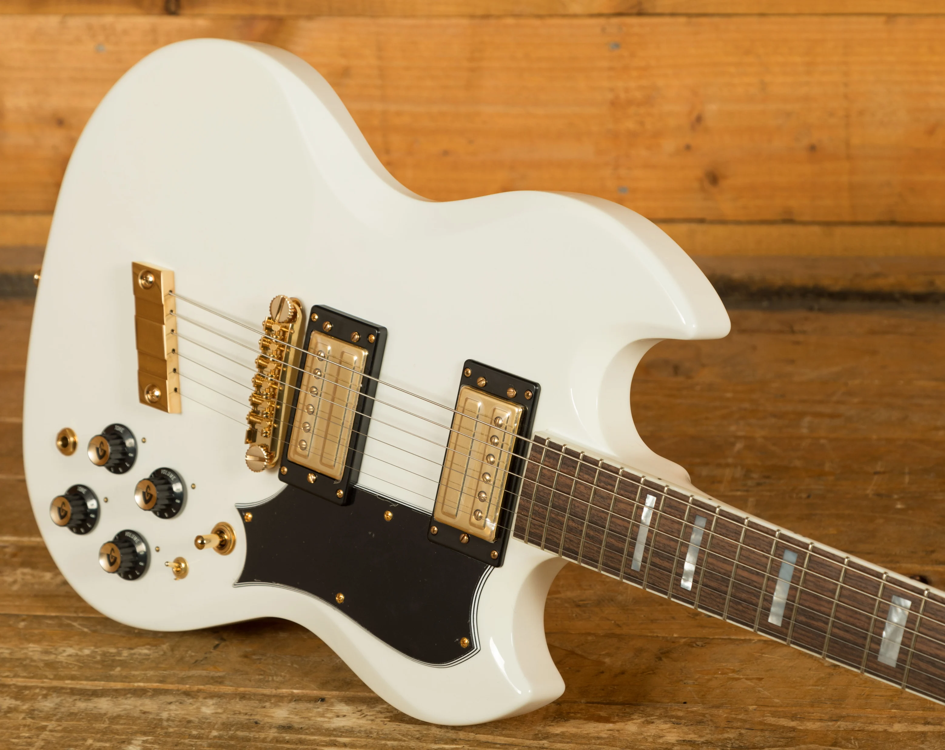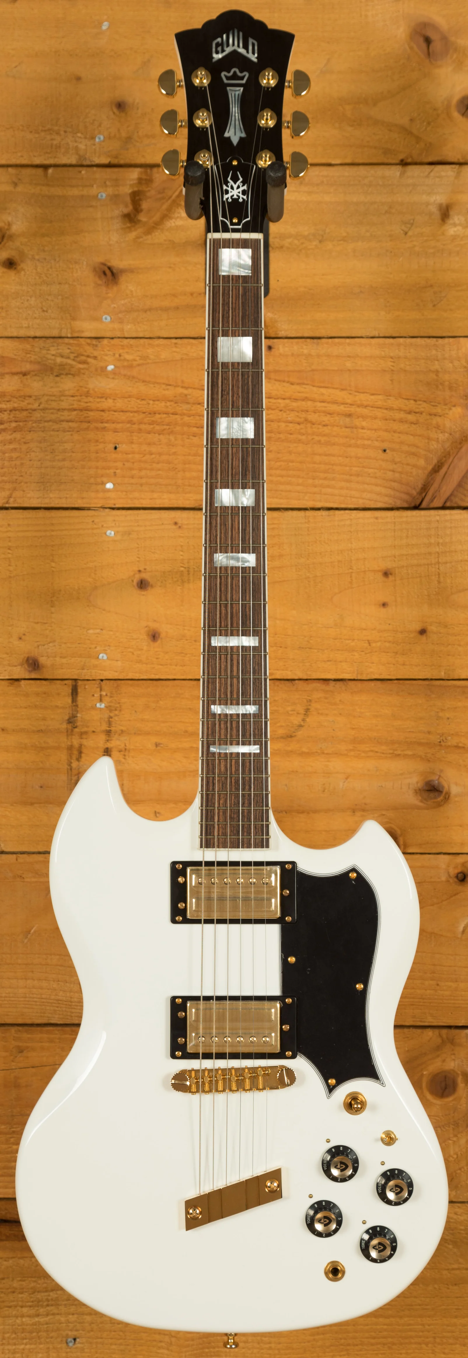 - Finish and Hardware: Finished in White Gloss Nitrocellulose Lacquer with gold hardware, the USA model has the authentic look and feel compared to the Vintage White Gloss Polyurethane finish on the Indonesian version. It also comes with a Guild Vintage Muller bridge instead of the Tune-O-Matic found on the standard model.