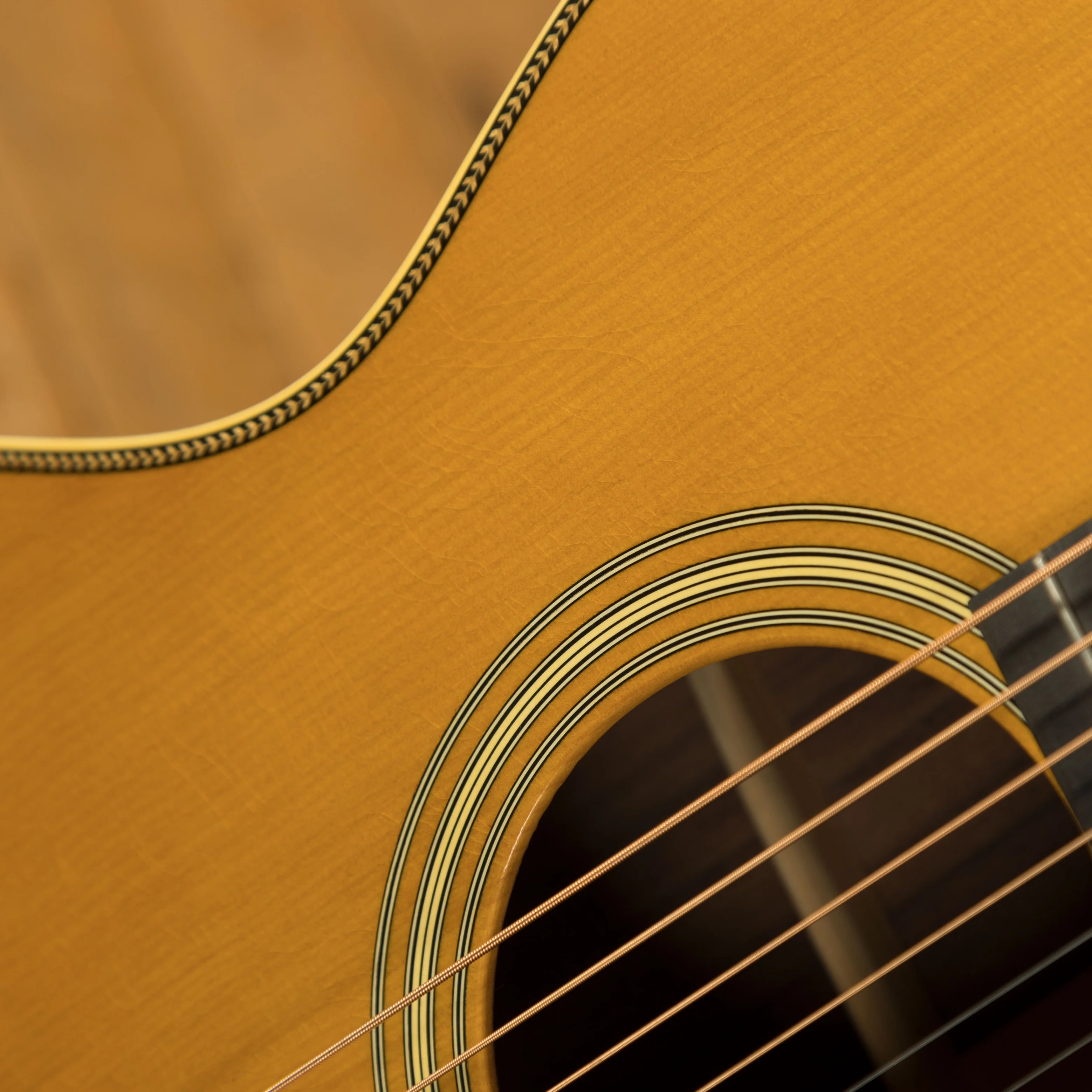 The genuine Mahogany neck is an absolute dream to play, with a Modified "V" Shape with a Standard Taper, 24.9" Scale Length, 1 3/4" Nut Width and Abalone Authentic '37 Diamond & Square Long Pattern inlays on an Ebony board. It is super comfortable and delivers a secure and comfortable playing platform.
