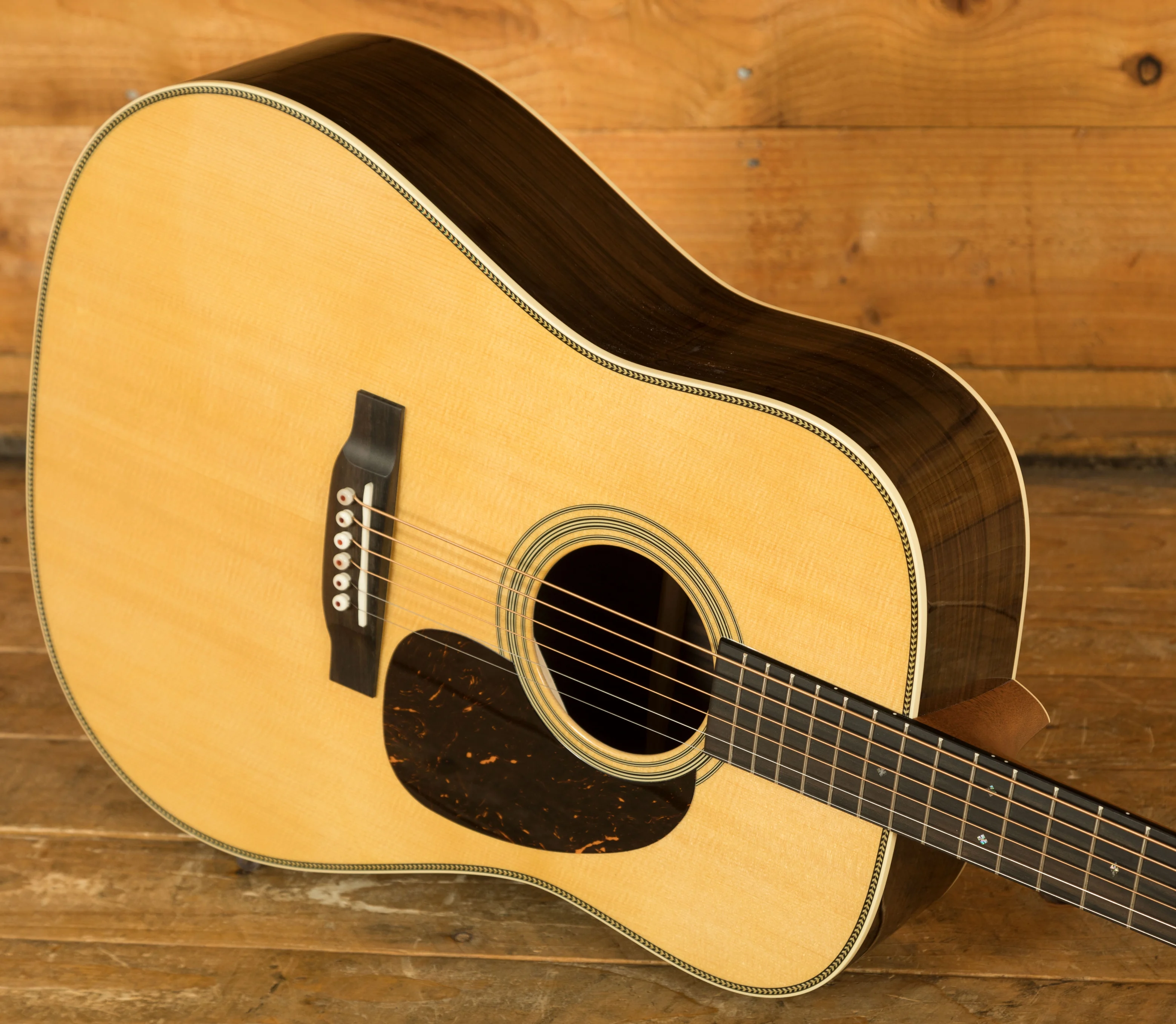 Built with a solid spruce top and solid East Indian rosewood back and sides, the HD-28 delivers the bold, balanced tone that has made it a staple in acoustic music for decades. The scalloped bracing enhances bass response and clarity, while the Dreadnought body ensures powerful projection. This combination makes the HD-28 ideal for flatpicking, strumming, and fingerstyle playing. The guitar's herringbone top inlay and abalone diamond and square fretboard inlays give it a refined, vintage-inspired appearance.