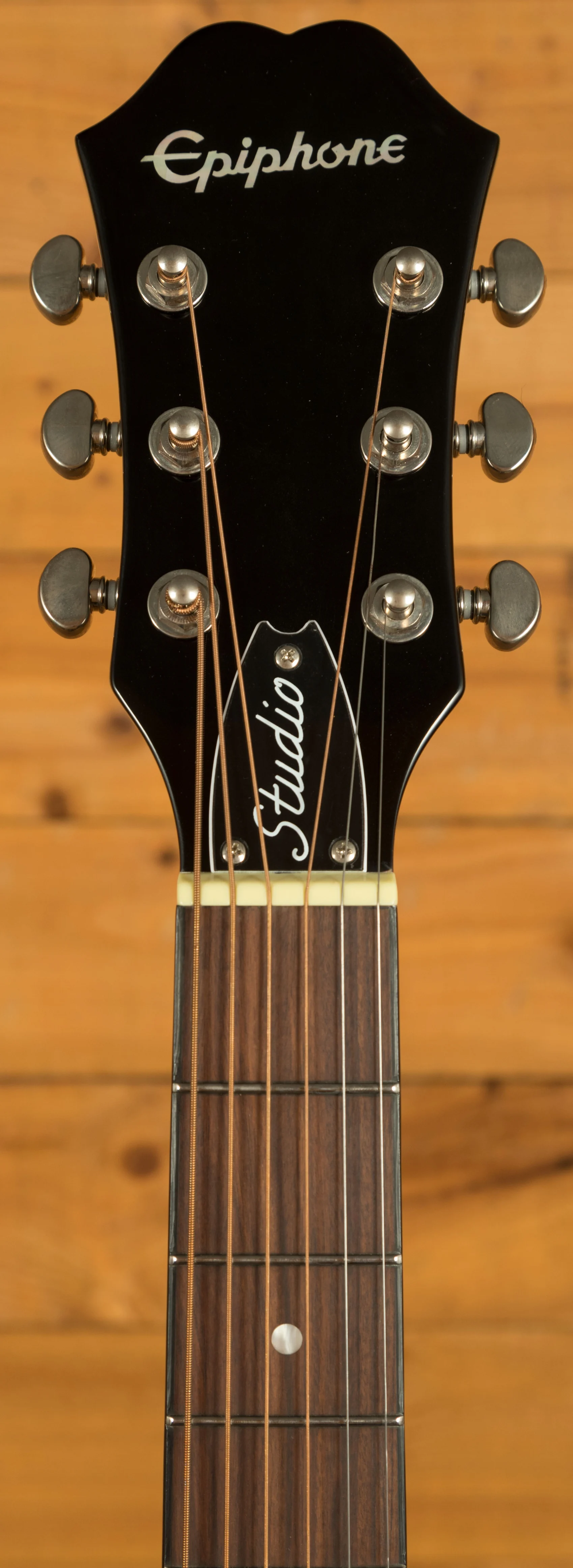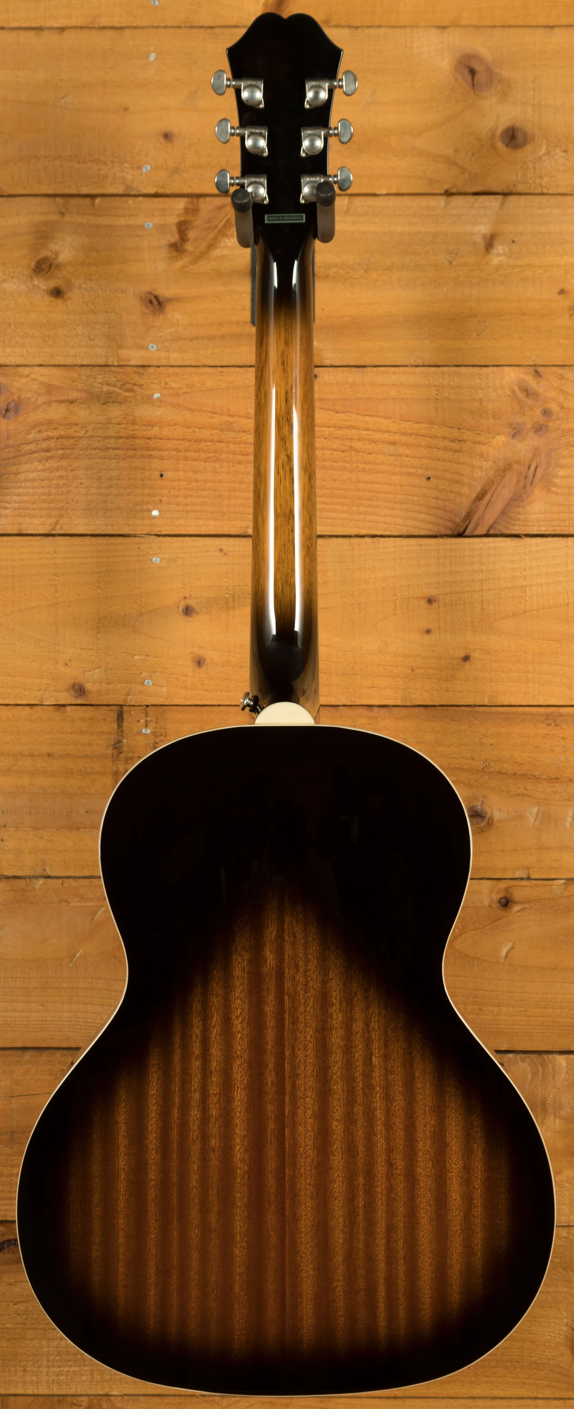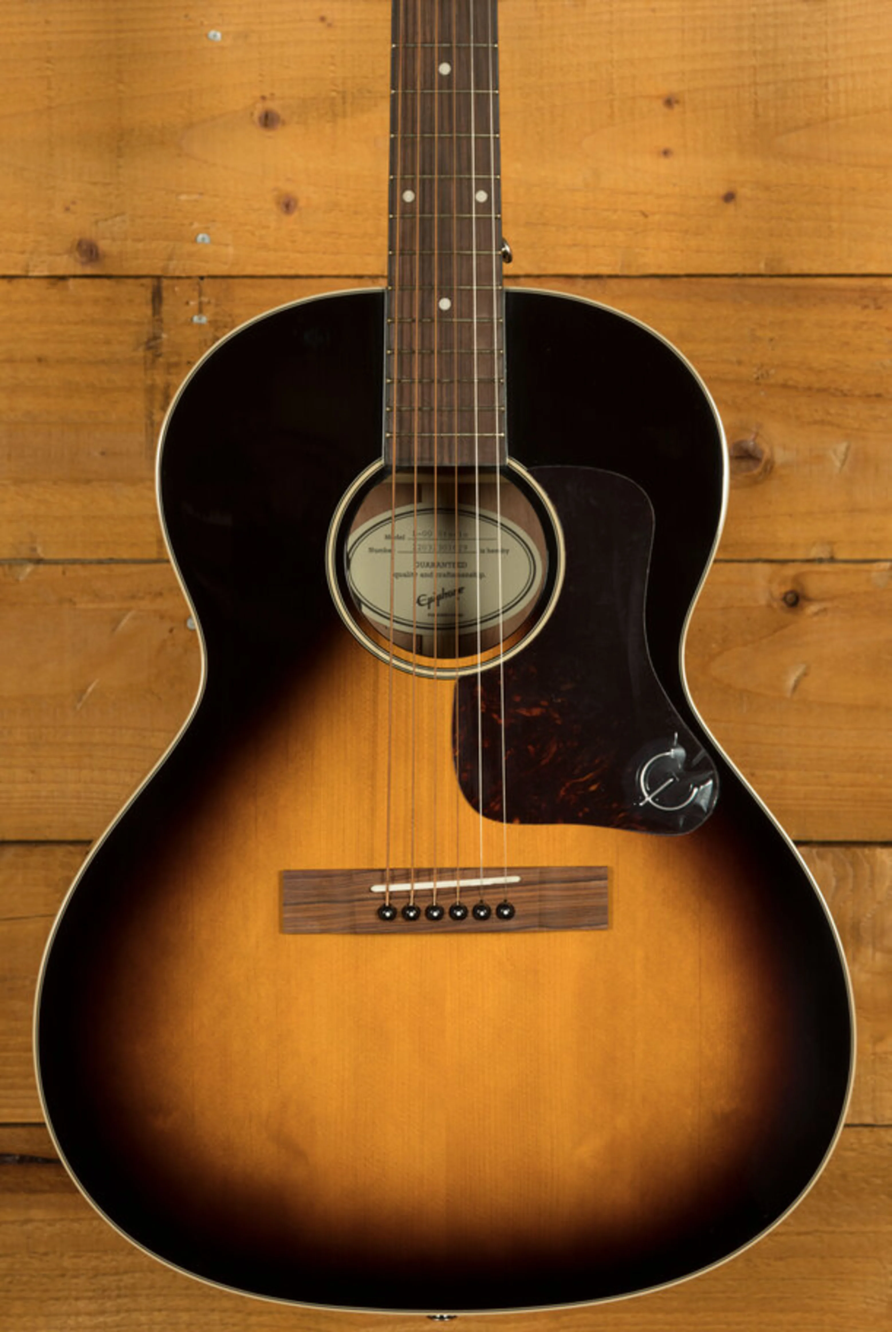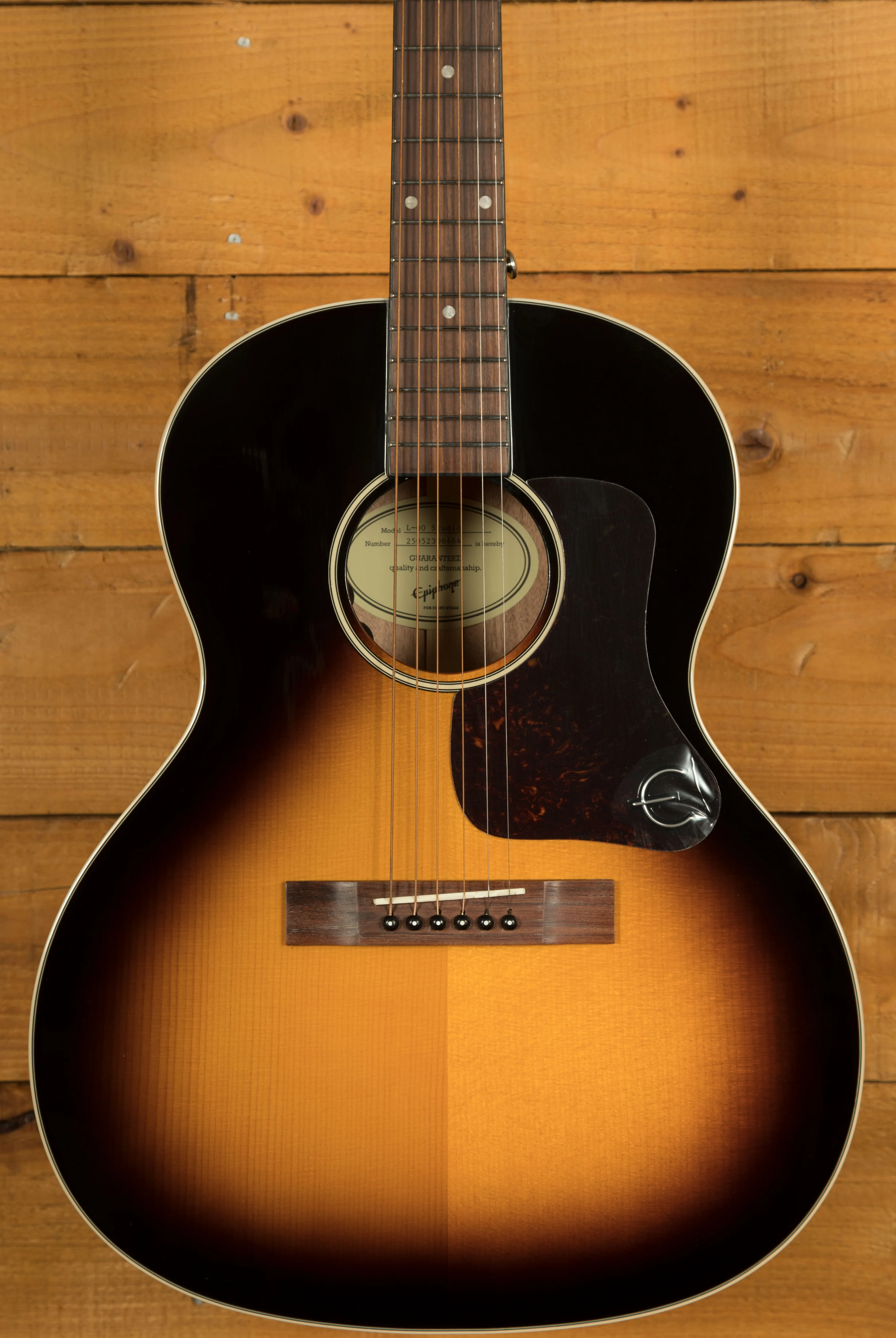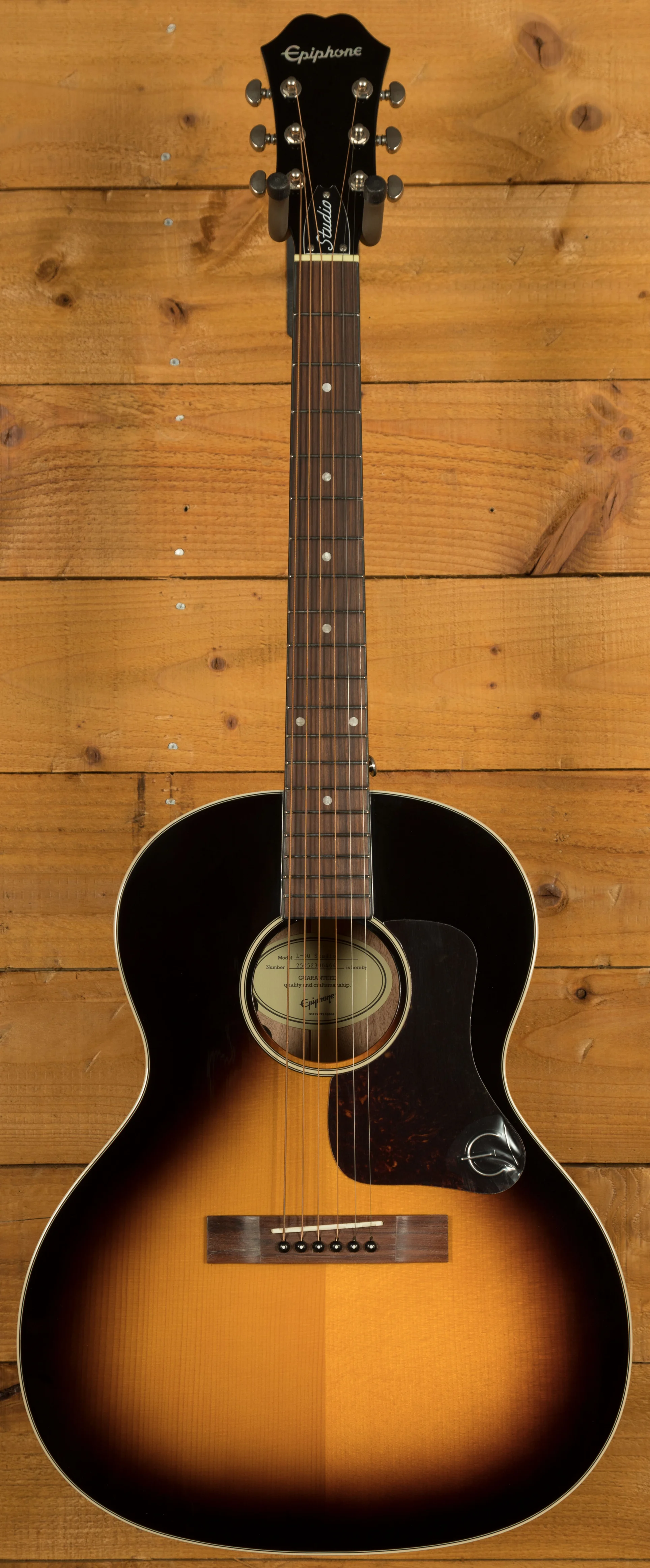 The Epiphone L-00 Studio Acoustic/Electric is a compact and versatile guitar designed for players who value comfort, playability, and a balanced tone. Its solid spruce top provides clear projection and dynamic range, while the mahogany back and sides add warmth and depth to the sound. With a shorter 24.75" scale length and SlimTaper D profile neck, this model is comfortable to play for extended periods, making it well-suited for both beginners and experienced musicians. The 12" fingerboard radius and medium jumbo frets further enhance playability, offering smooth chord transitions and accurate note articulation.