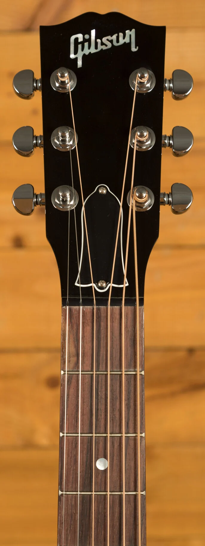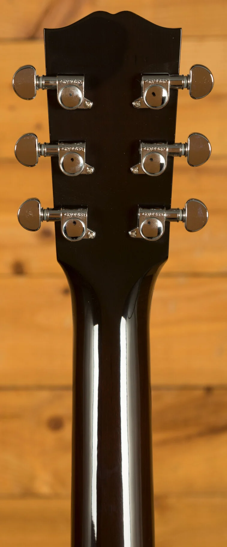 The slim taper mahogany neck offers a comfortable playing experience, while the rosewood fingerboard with a 12-inch radius provides a smooth surface for fretting. The 24.75-inch scale length is a standard Gibson scale, and the 19 standard frets are easily accessible. Mother-of-pearl dot inlays mark the fret positions on the rosewood fingerboard. A black nut and Tusq saddle contribute to the guitar's clear tone.