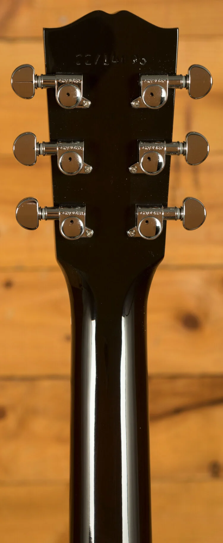The slim taper mahogany neck offers a comfortable playing experience, while the rosewood fingerboard with a 12-inch radius provides a smooth surface for fretting. The 24.75-inch scale length is a standard Gibson scale, and the 19 standard frets are easily accessible. Mother-of-pearl dot inlays mark the fret positions on the rosewood fingerboard. A black nut and Tusq saddle contribute to the guitar's clear tone.