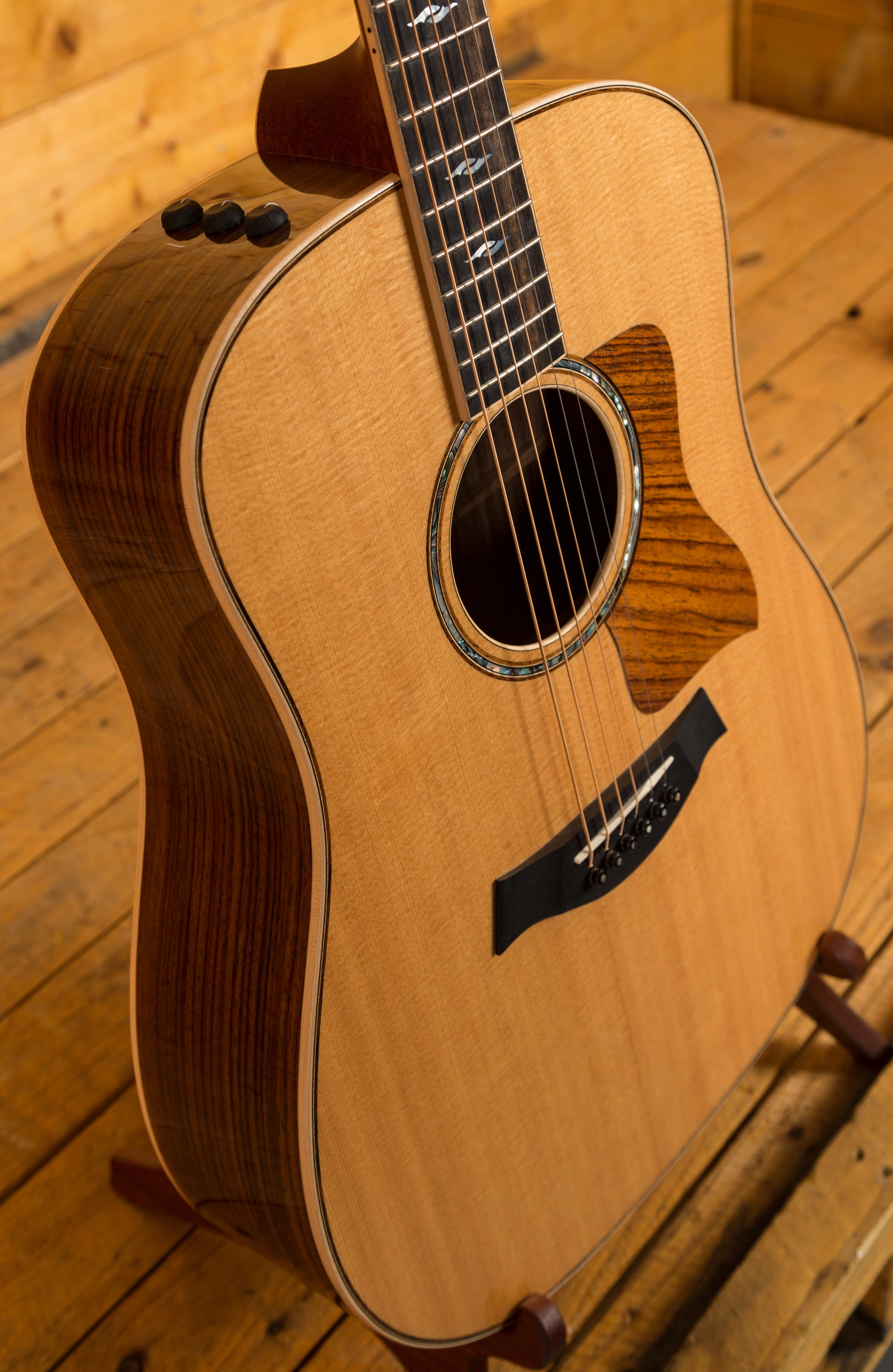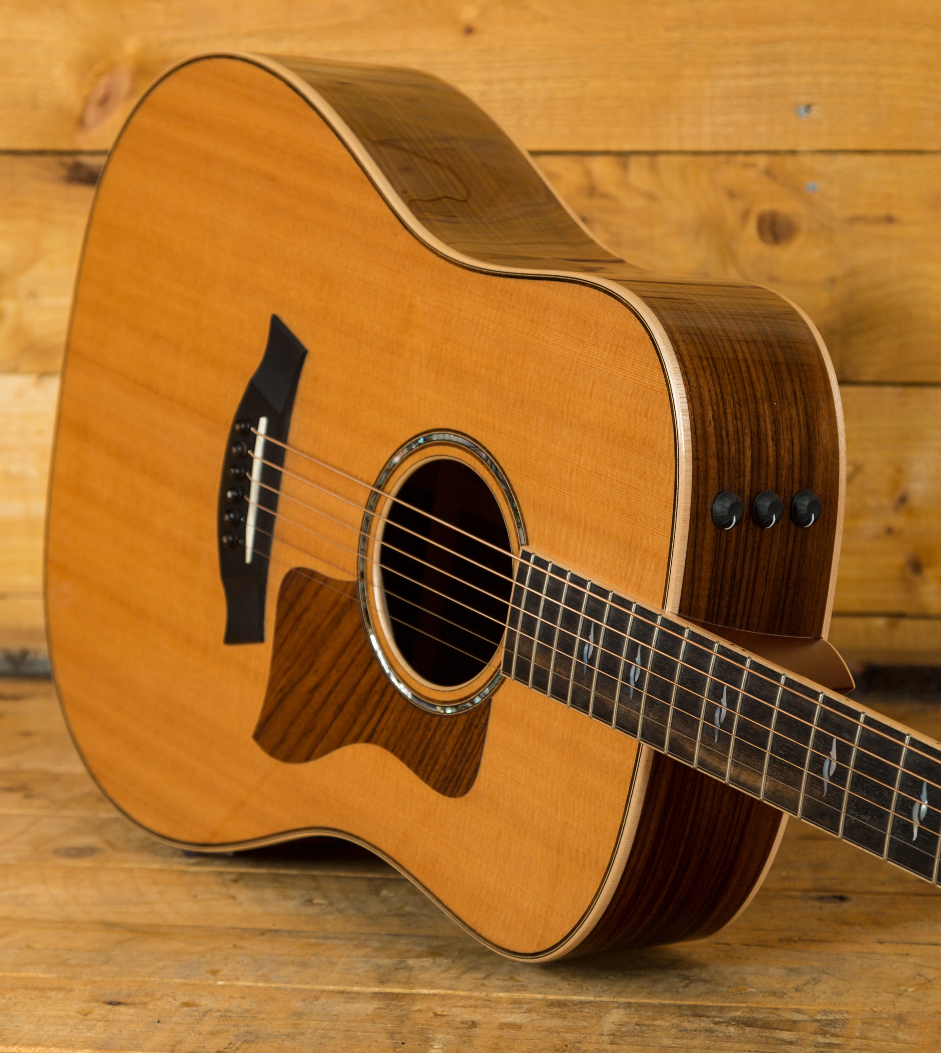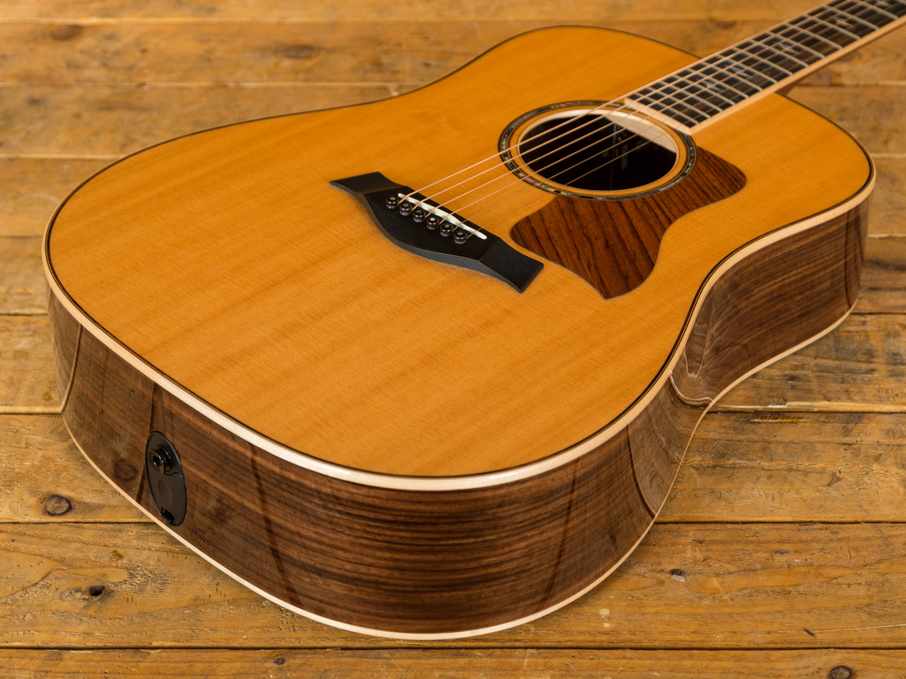 The rosewood/spruce 810e brings Taylor's latest tone-enhancing refinements to the traditional steel-string Dreadnought, blending driving low-end power with a vibrant upper register for a turbo-charged flatpicking machine. Bluegrassers will love the strong, crisp top-end punch in any picking circle, with robust projection across the entire tonal spectrum. Premium appointments include maple binding and back strip, rosewood top edge trim, rosewood pickguard, mother-of-pearl Element fretboard inlay, and smoky ebony fretboard. With Taylor's onboard Expression System 2 pickup, the dynamics of the player will translate loud and clear.
