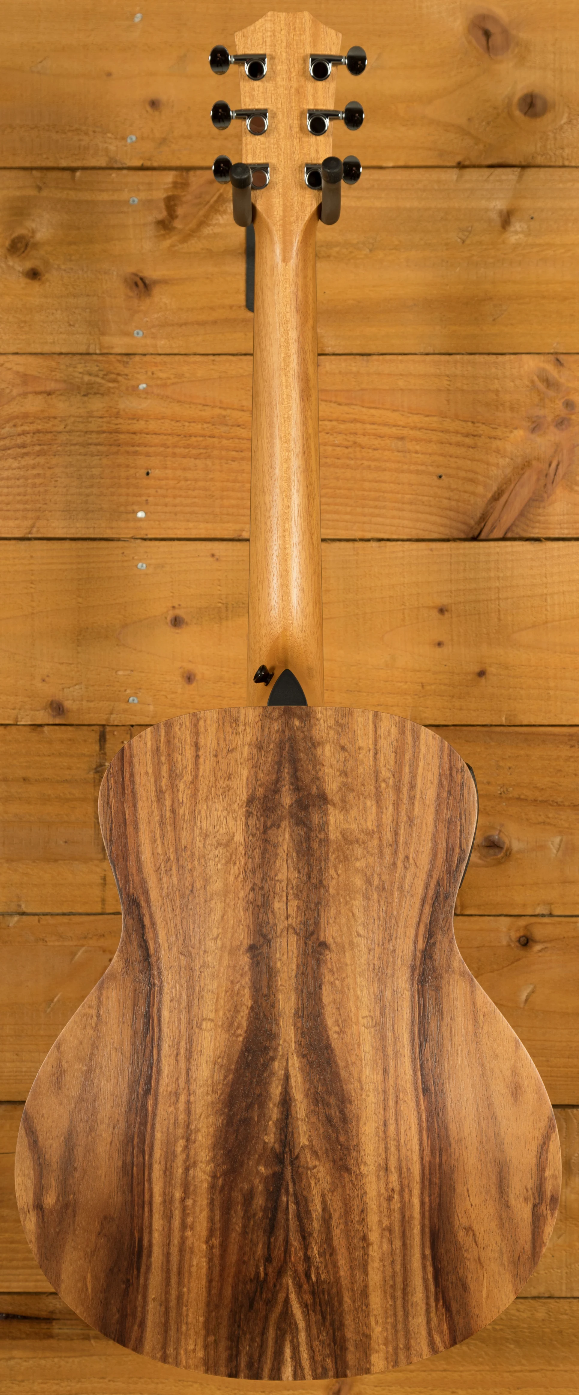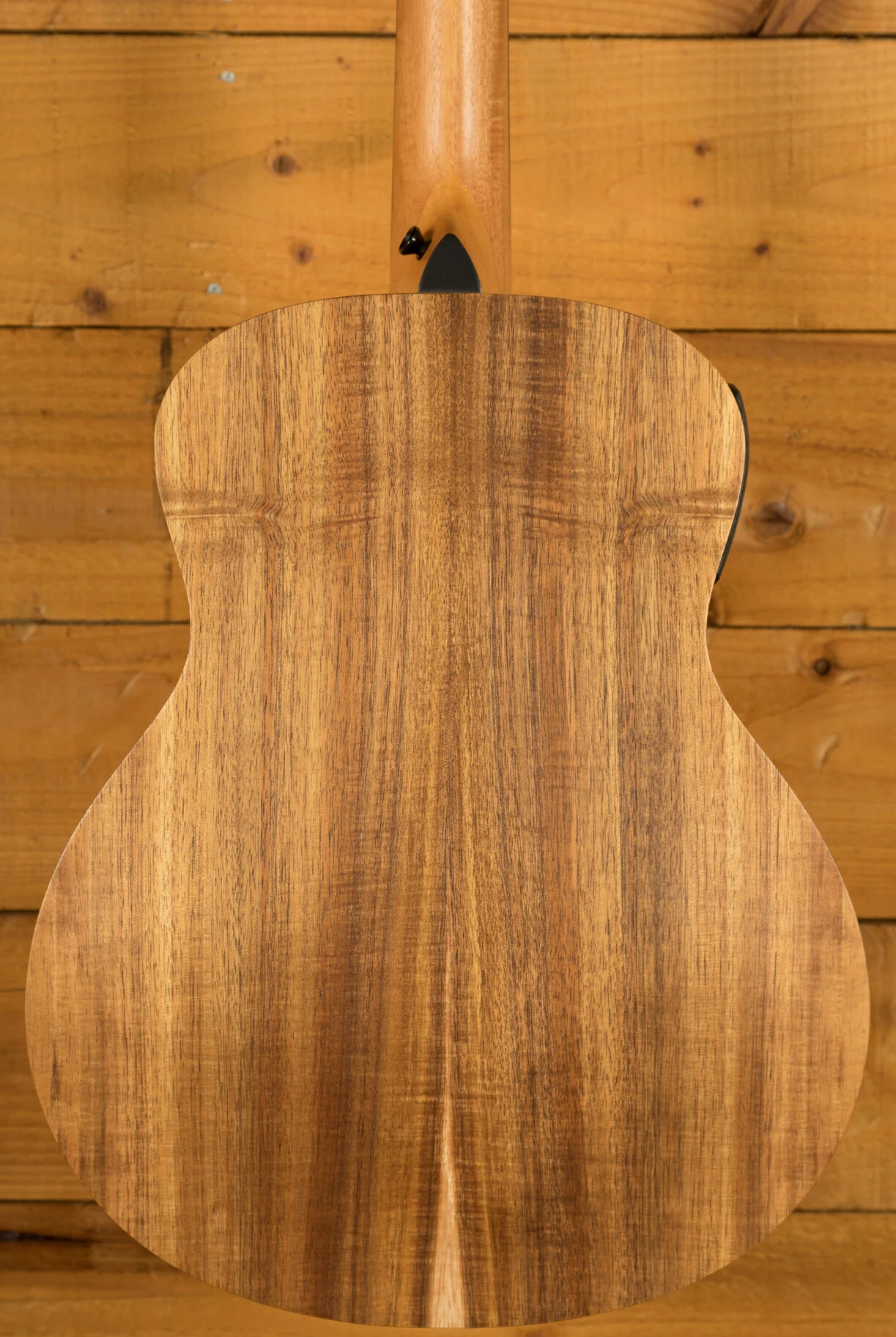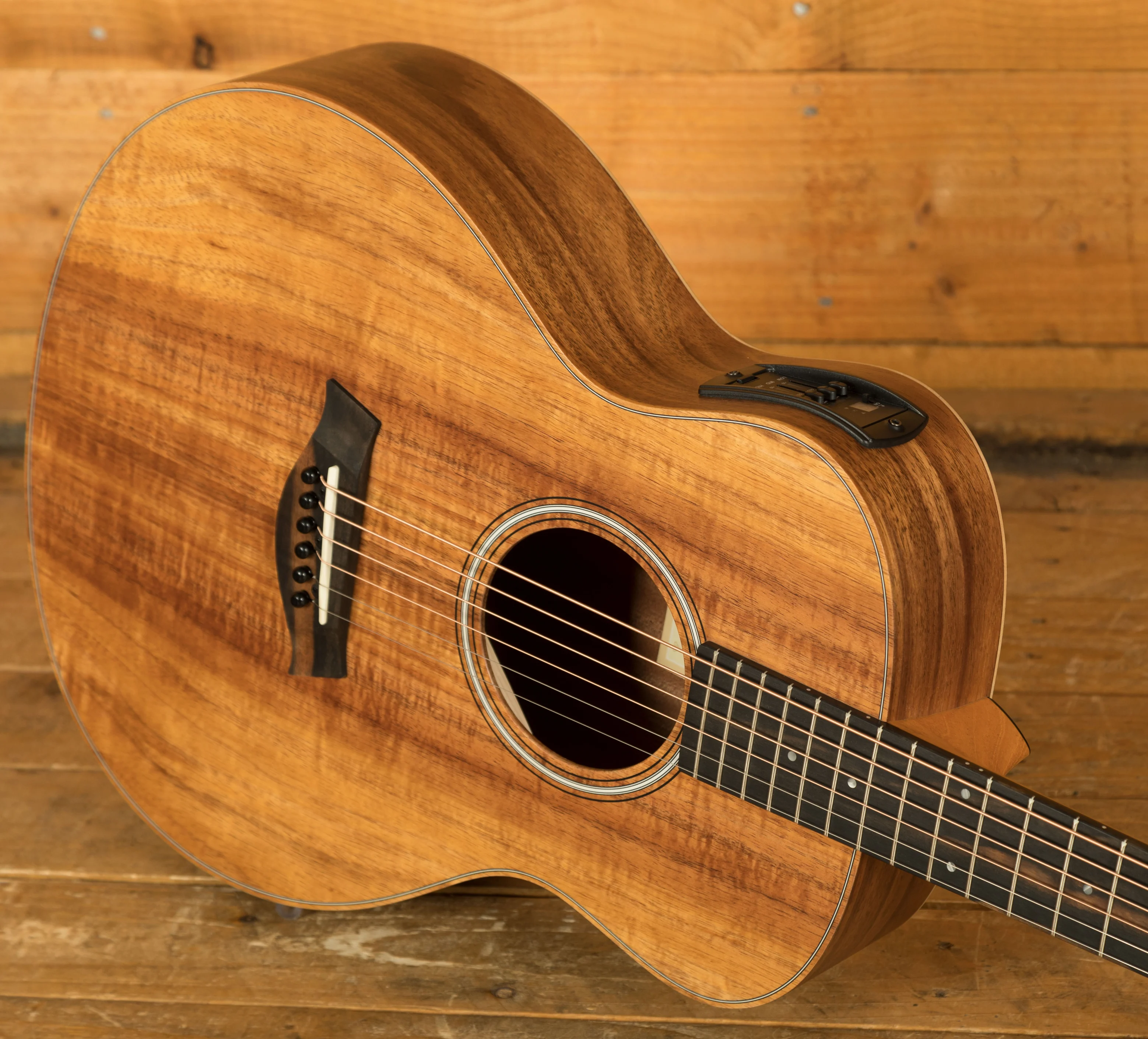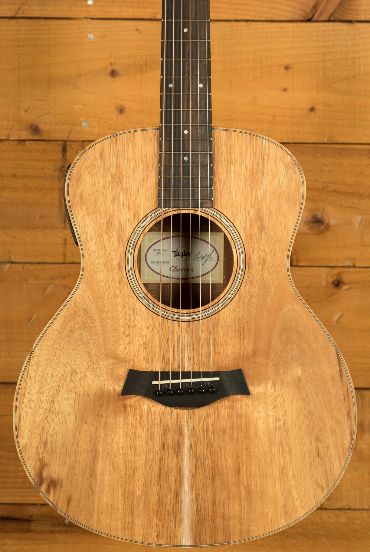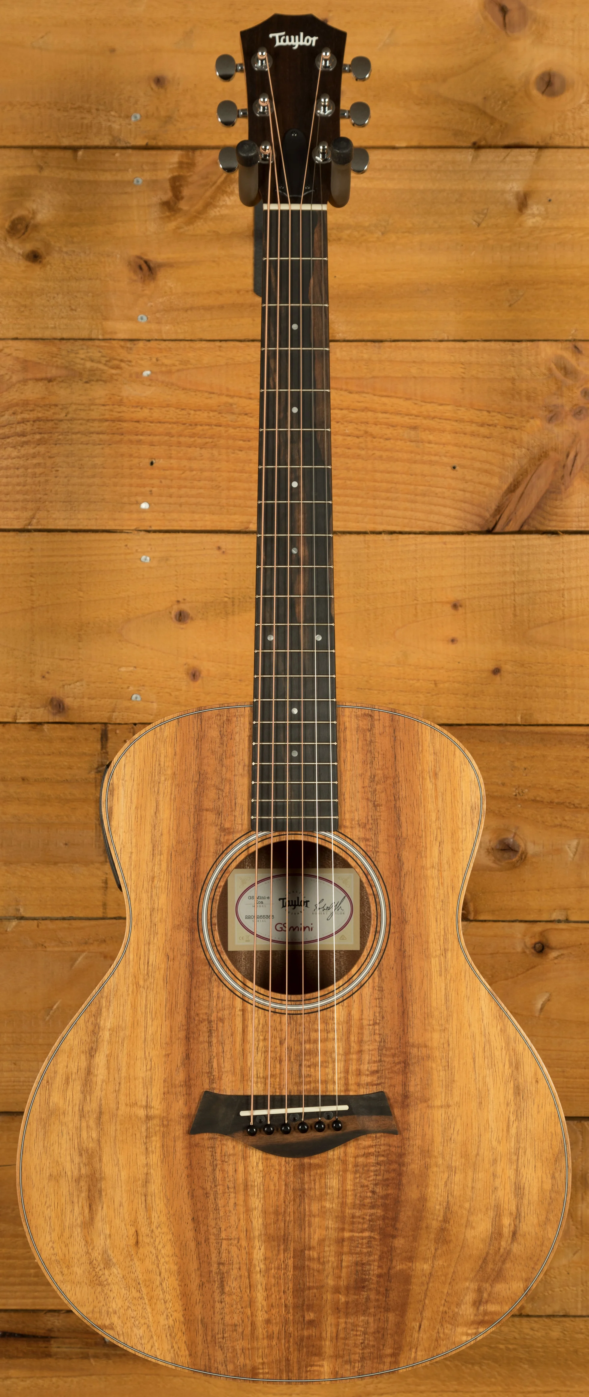 The GS Mini-e Koa brings the vibrant sound and organic beauty of Hawaiian koa to Taylor's ultra-popular reduced-scale acoustic guitar. The GS Mini's compact proportions make it a great choice for players who take their music on the road, and with a solid koa top, this model serves up a rich, bold sound that punches well above its weight for a smaller guitar. The built-in ES-B pickup offers clear, natural amplified tone and includes a digital tuner with an easy-to-read LED display. The GS Mini-e Koa ships with a structured gig bag.