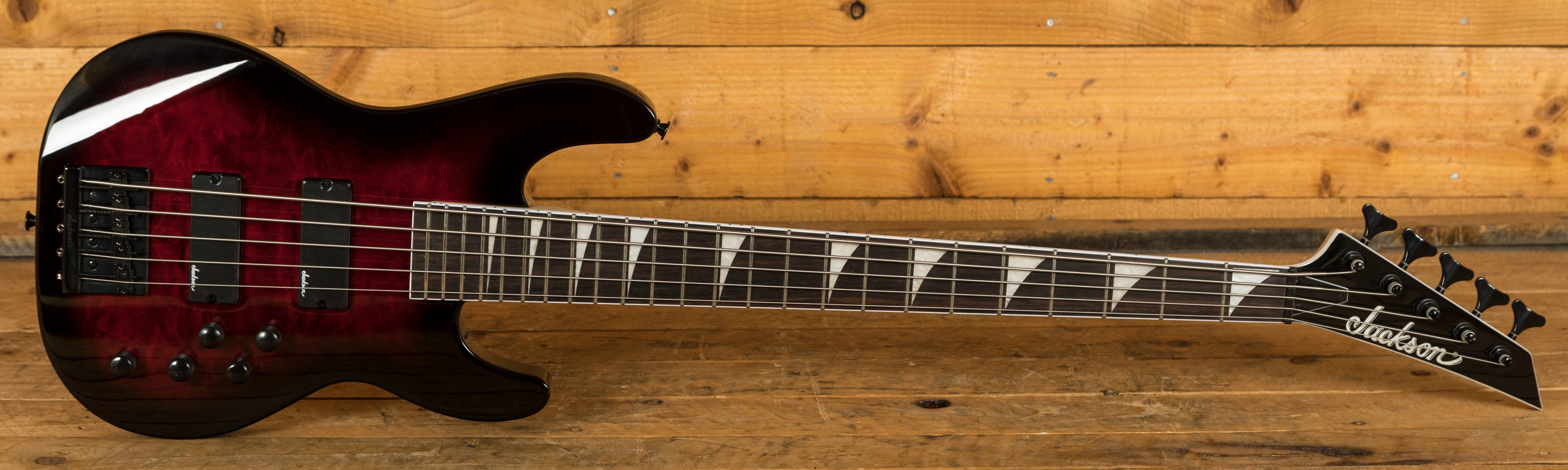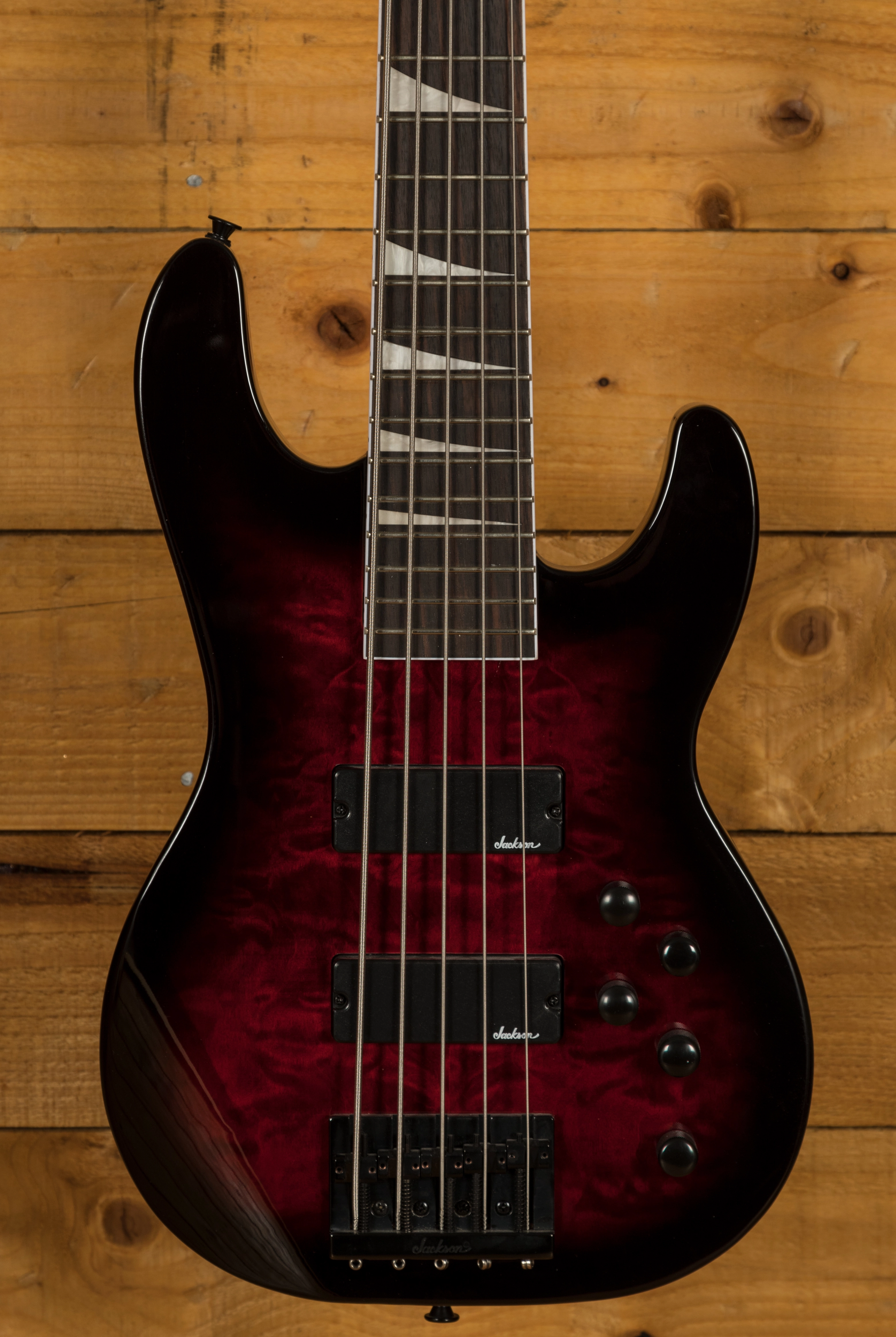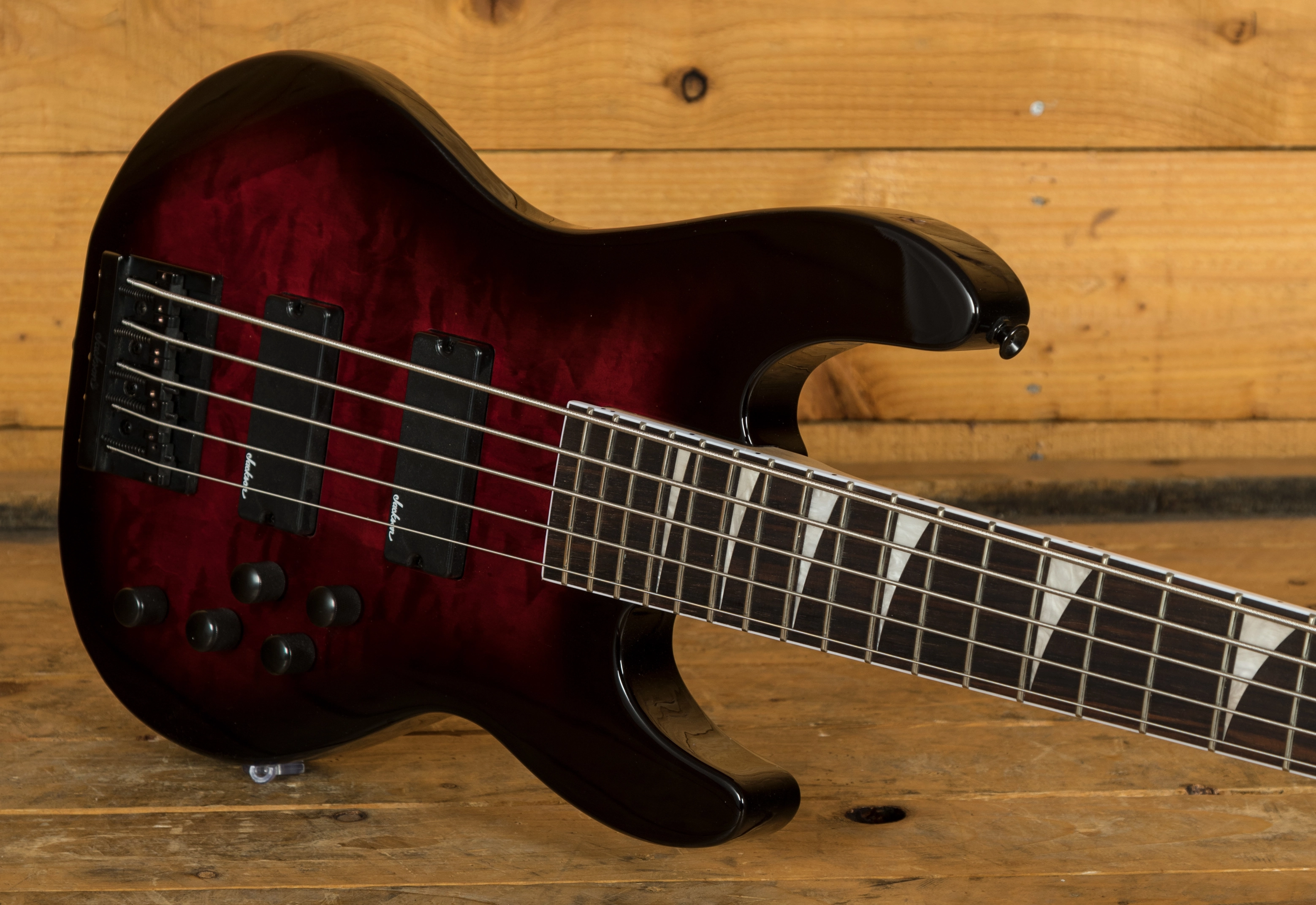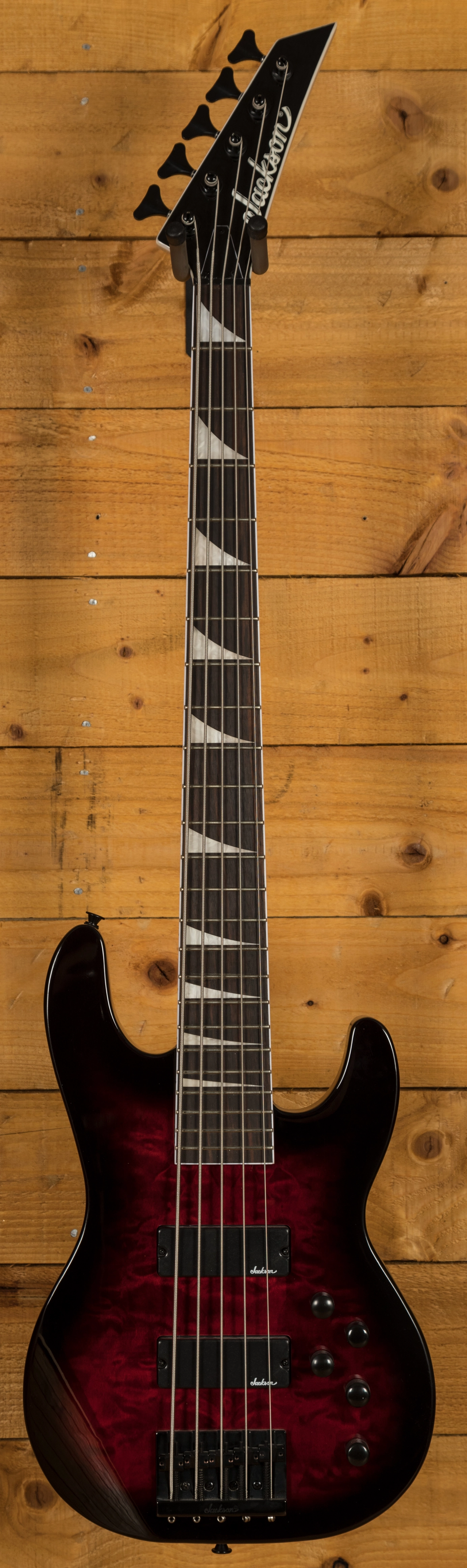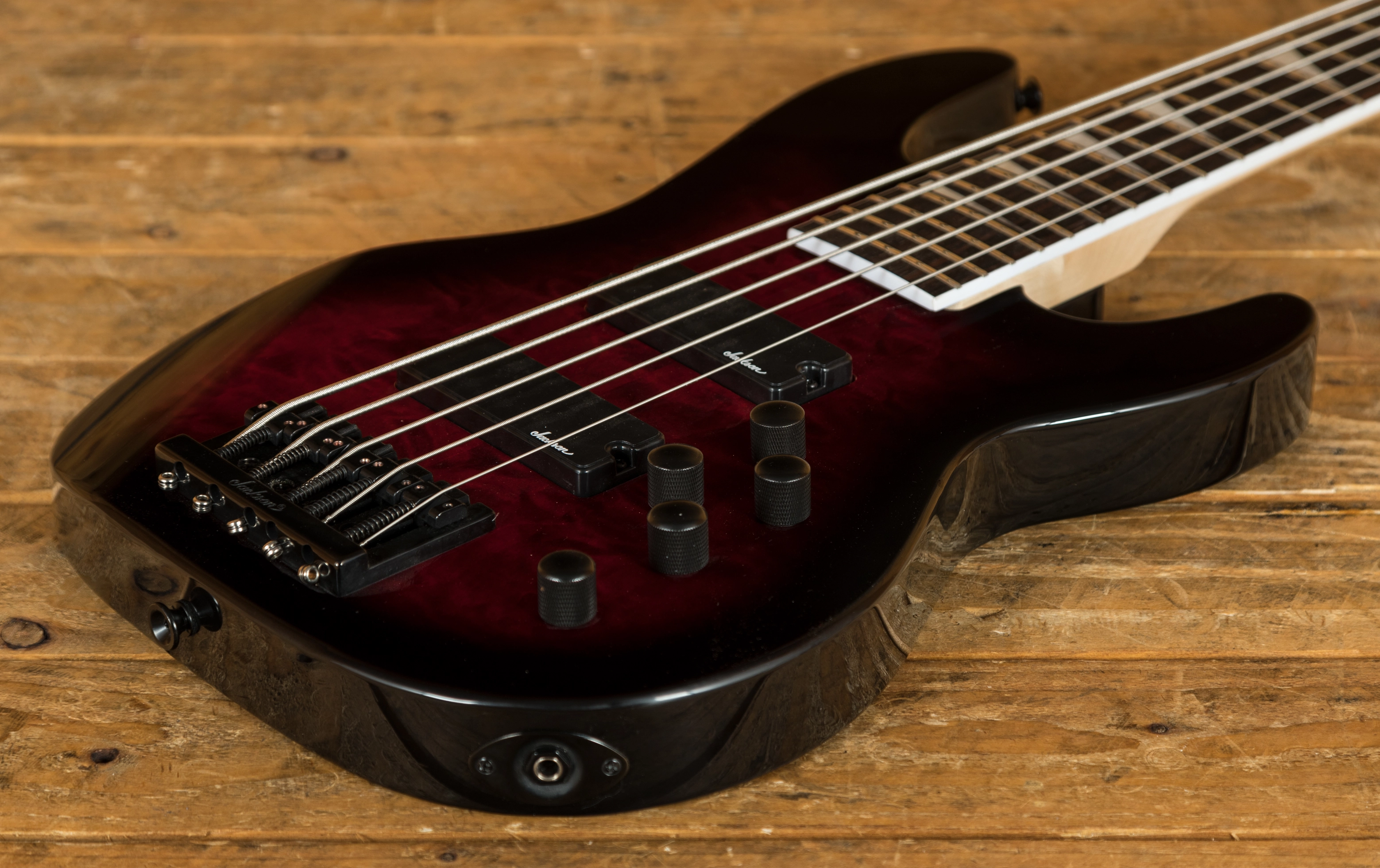Jackson dual high-output humbucking bass pickups power a monstrous low-end growl, while a high mass bridge provides rock-solid stability. Also equipped with an active 3-band EQ and a pair of volume control knobs to tweak tone.