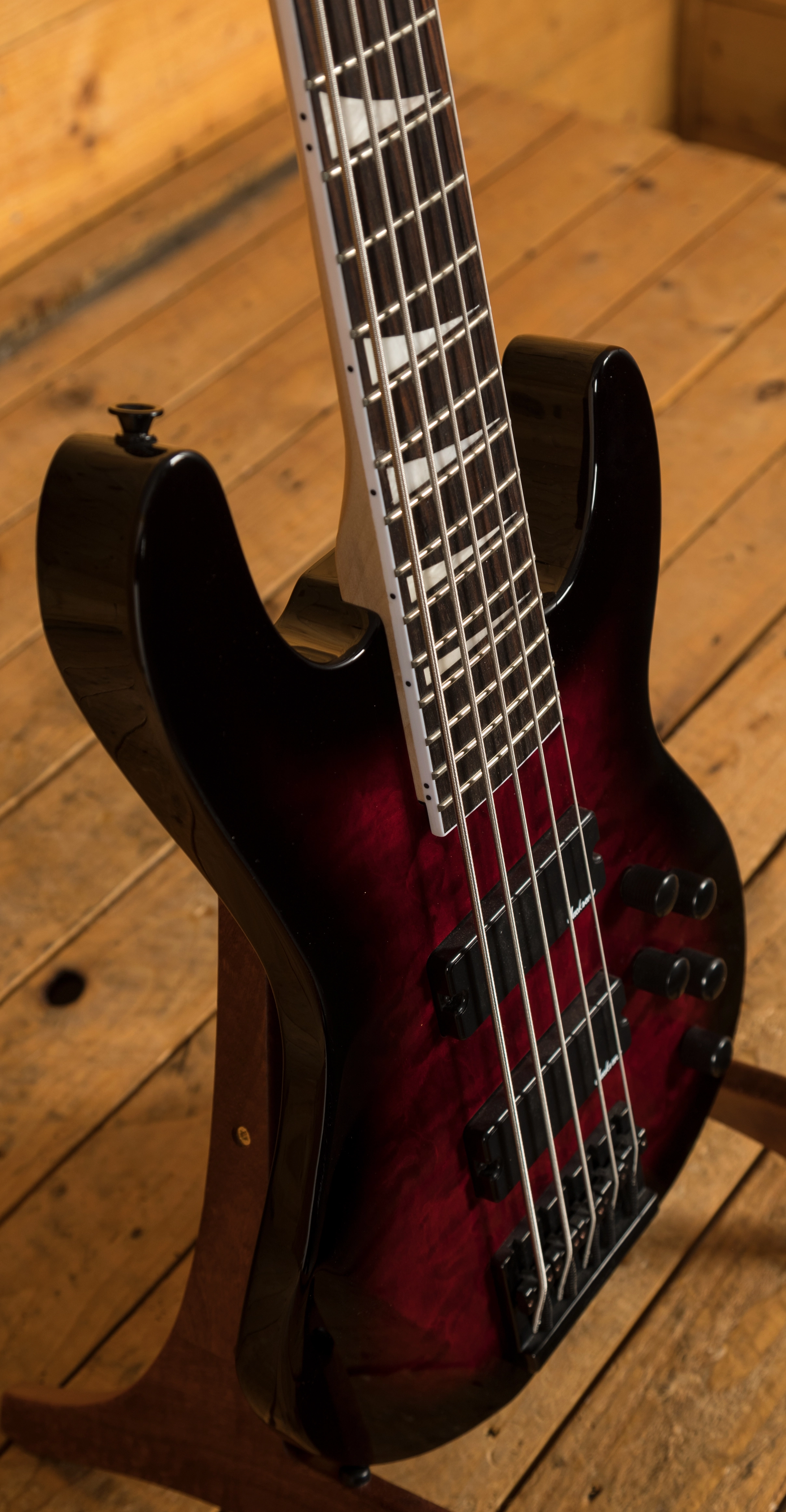 The five-string Concert Bass JS3VQ is a 35"- scale model featuring a lightweight and resonant poplar body with an elegant quilt maple top, fully bound bolt-on maple neck with graphite reinforcement and scarf joint, and a 12"-16" compound radius rosewood fingerboard with 24 jumbo frets and classic sharkfin inlays.