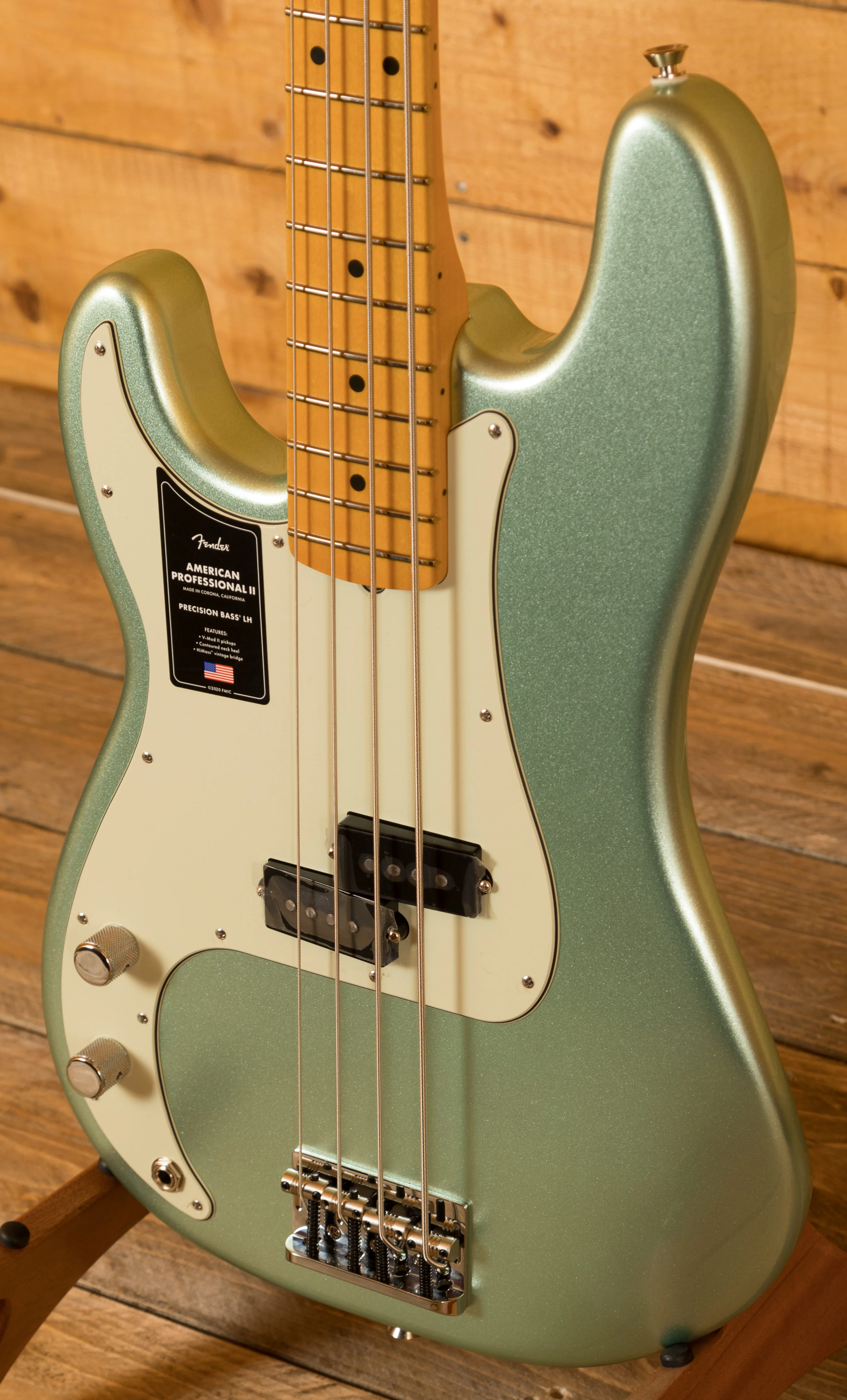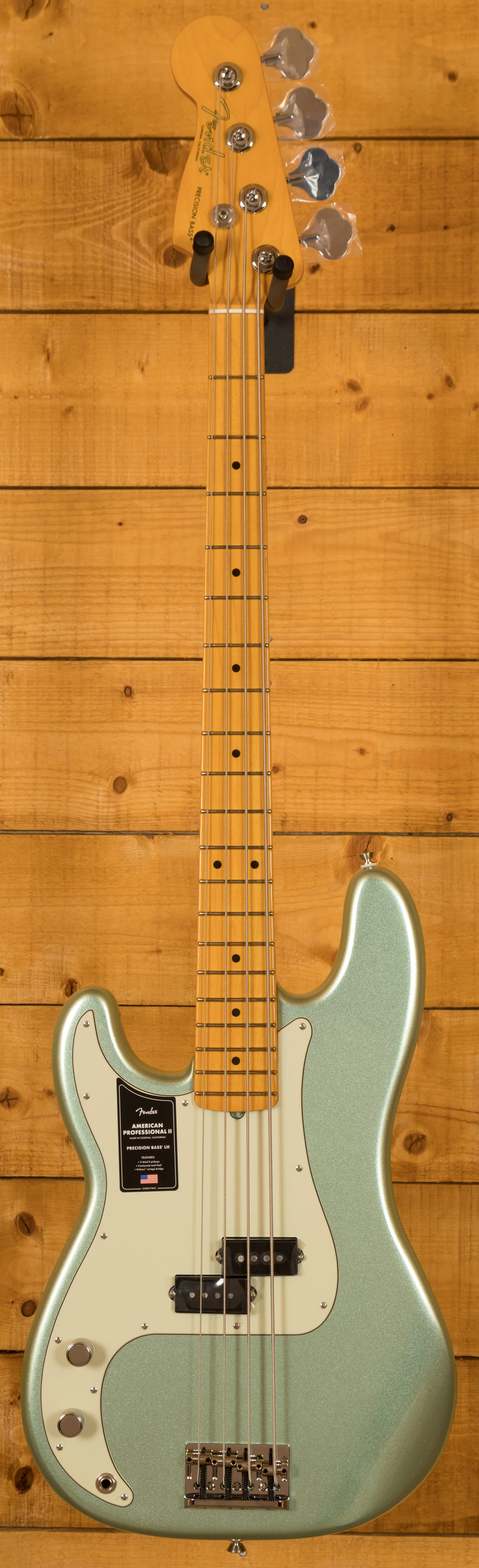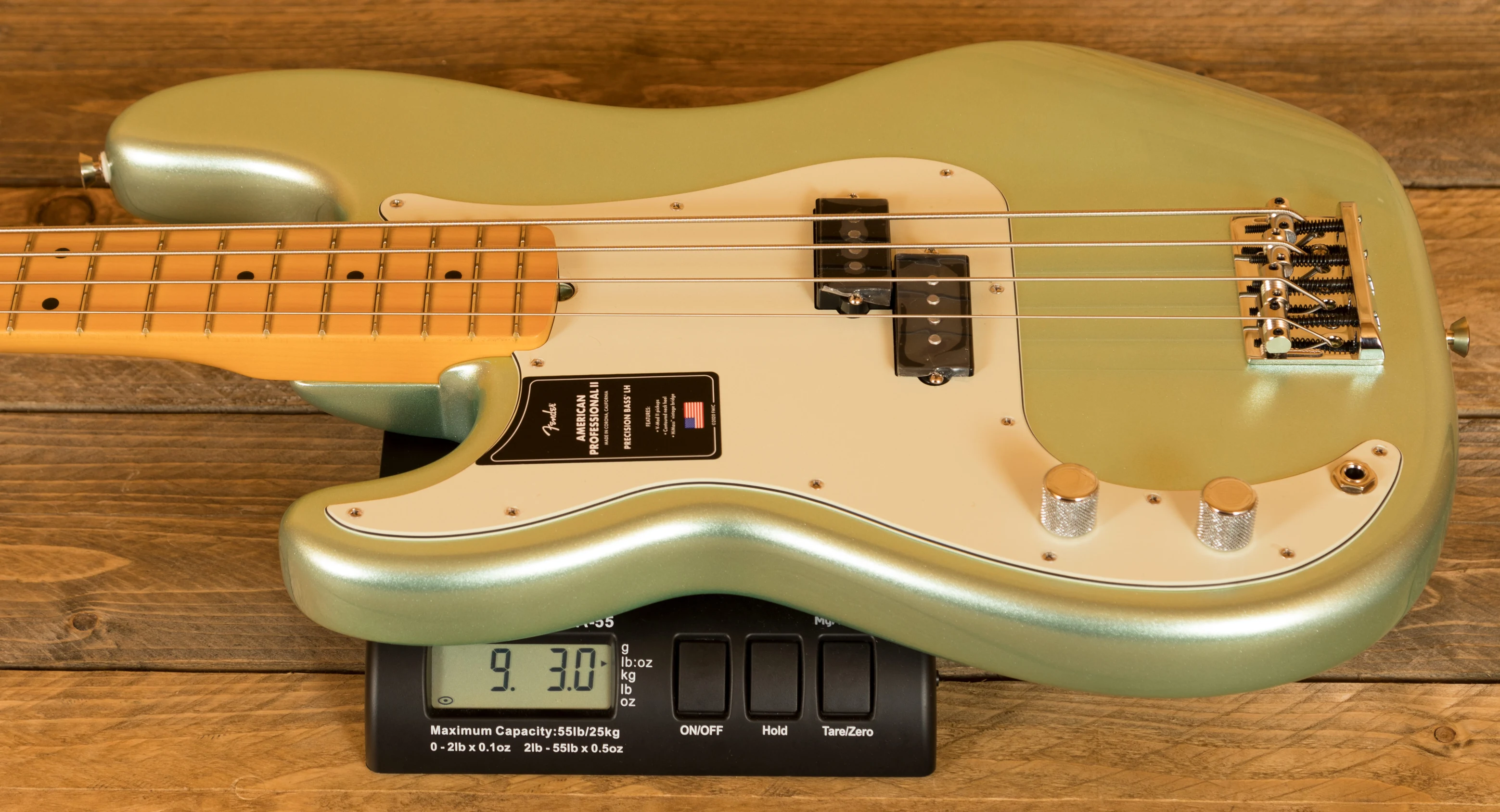 The Alder body is typically comfortable, as all Precision Bass's are, finished in the brilliant Mystic Surf Green option, it looks real slick. The Maple neck and fingerboard feature a '63 profile, designed for speed and comfort; This bass is super easy to navigate, allowing for great access to the upper register. 20 frets, a 9.5" radius and 34" scale length make this Precision Bass feel familiar and supremely comfortable. The Professional II range brings a new contoured neck heel , soft rolled fingerboard edges and a super natural finish for improved feel and comfort