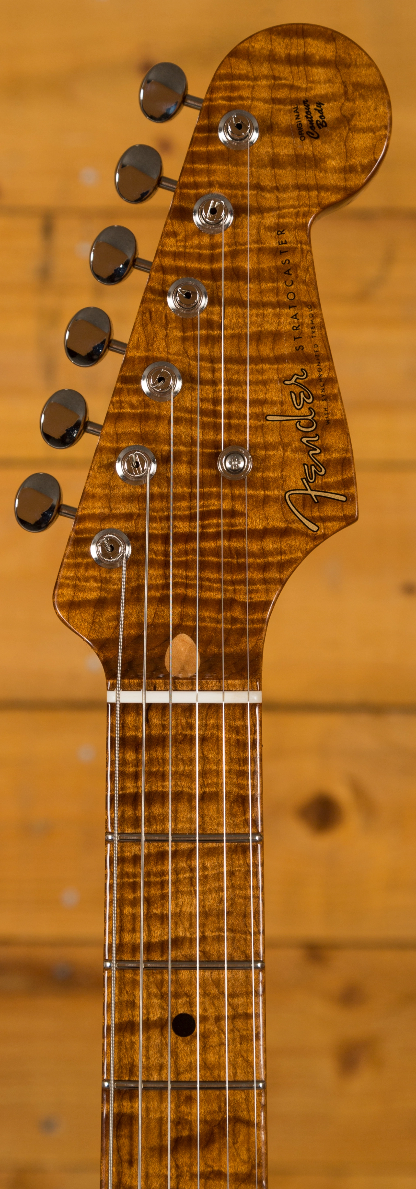 The 4A Roasted Flame Maple neck is real comfortable and looks incredible. With a 57 soft V profile, 7.25"-9.5" compound radius and 6105 frets it's super resonant and feels incredible underhand. The Flame Maple fingerboard is a treat to play, perfectly balanced and with flawless playability right up the neck, it's a real player's piece.