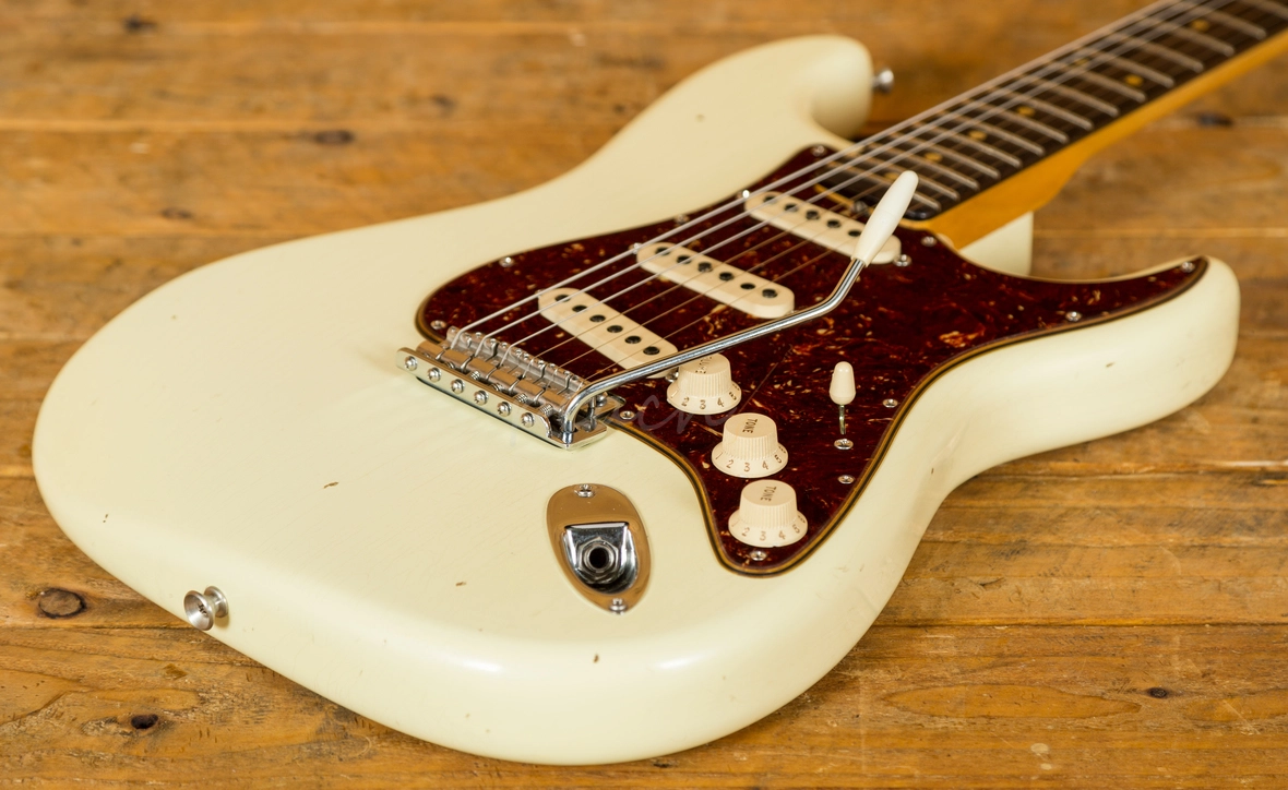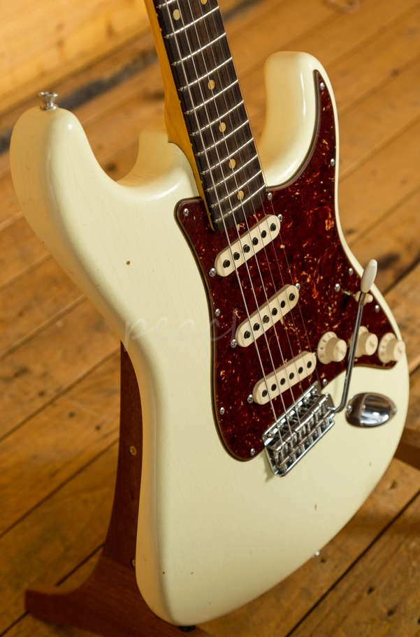A traditional Alder body is finished in a majestic Vintage White Journeyman finish. The Journeyman is a very lightly aged nitro finish; this gives the look and feel of a vintage guitar that has been lovingly cared for over the years. This finish will wear beautifully with time and develop its own character even further. It also allows the natural resonance of the body to sing and sustain much more effectively compared with other finishes.