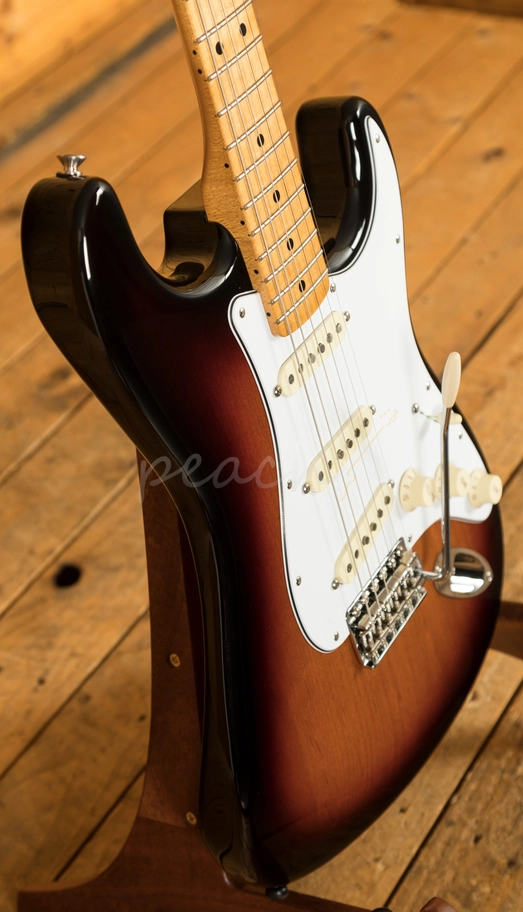 The traditional Alder Strat body features a rich 3-Tone Sunburst, it really captures the vibe of the late '60s. The C shape maple neck has a 9.5" radius, 25.5" scale length and a crisp Maple fingerboard. It's a great neck and perfect for tearing through Jimi's greatest tracks. With a custom Hendrix neckplate and Hendrix signature on the headstock, it's a real collector's piece. The classic reverse headstock mirrors Hendrix's preferred option of flipping a right handed guitar rather than playing a left handed model, this alters the relative length of the strings and adds a little more snap to the treble side.