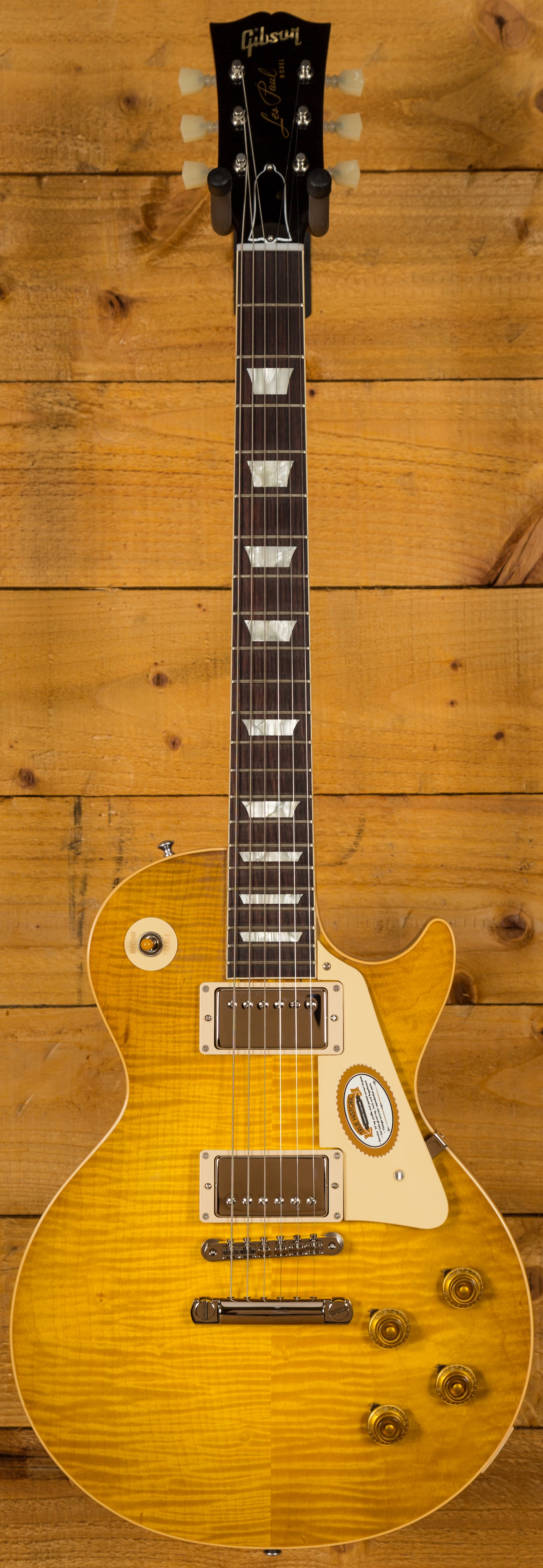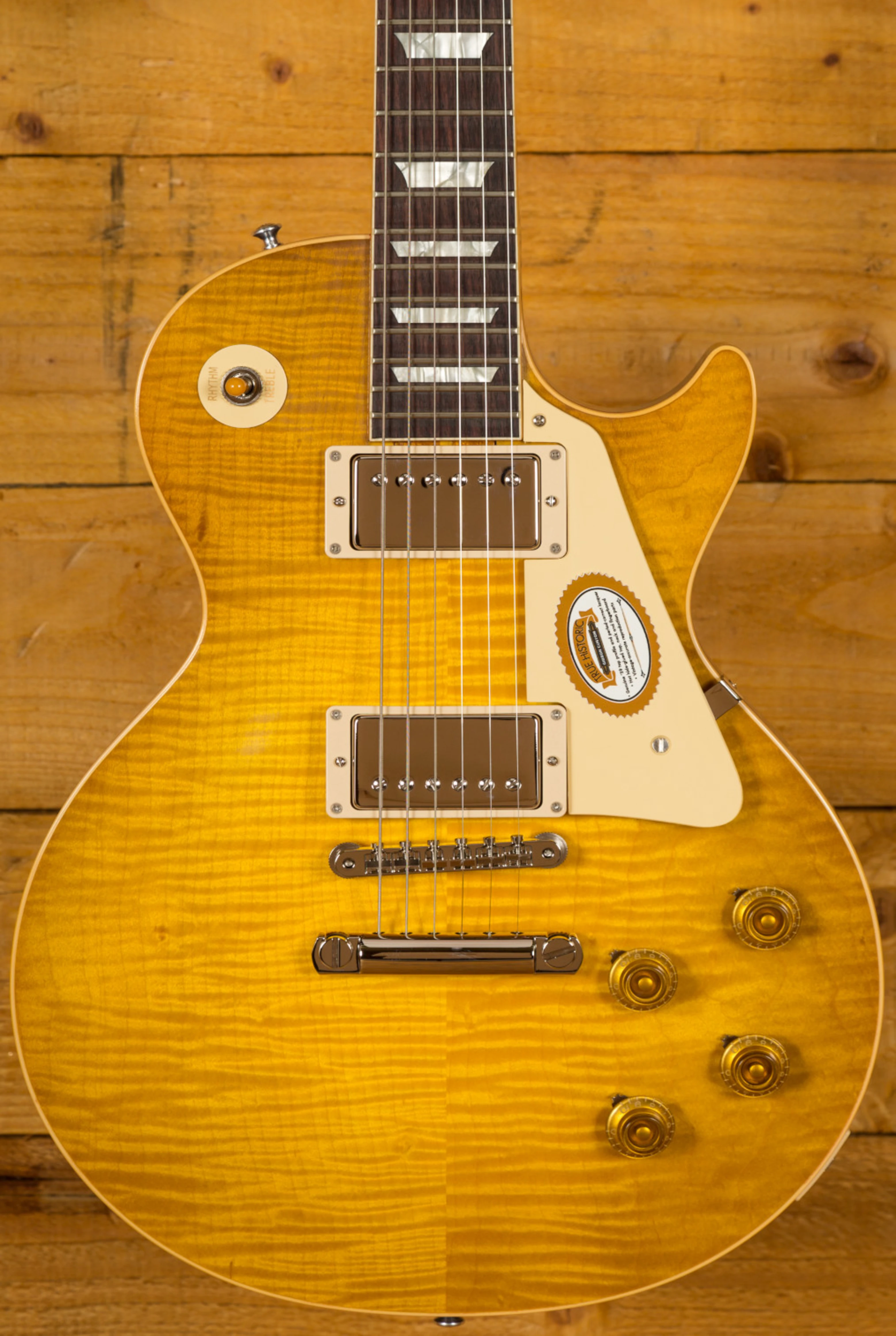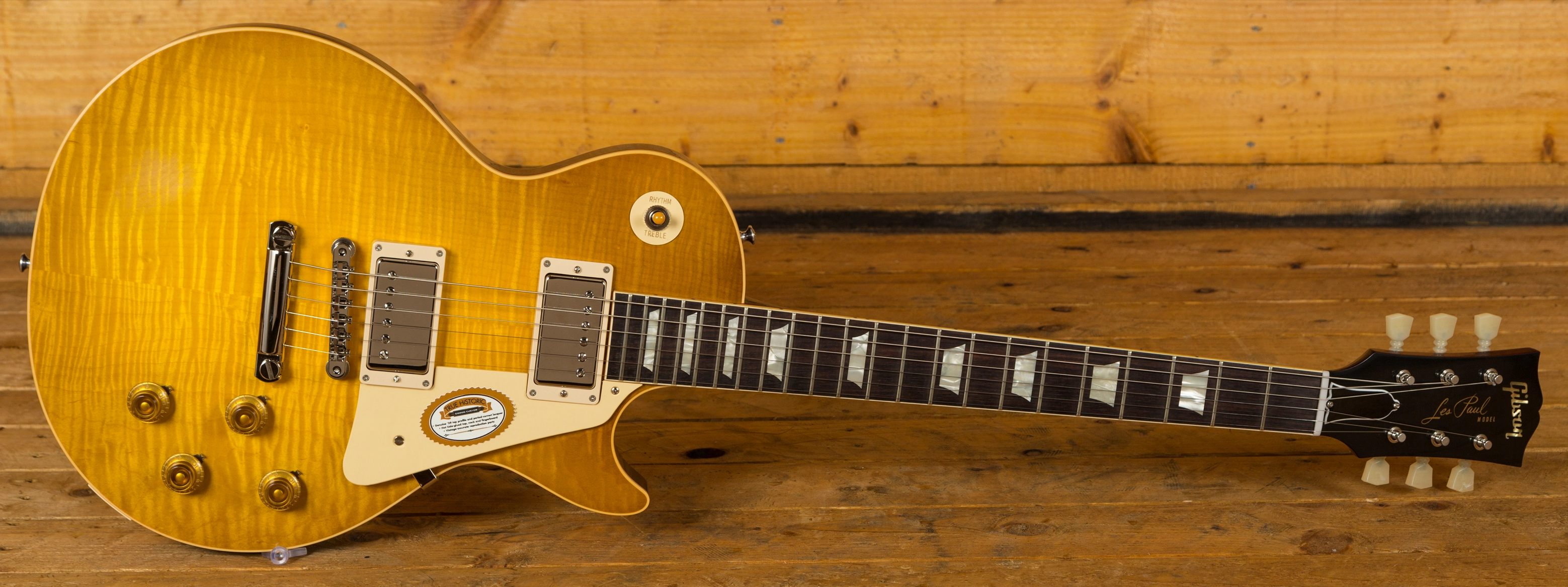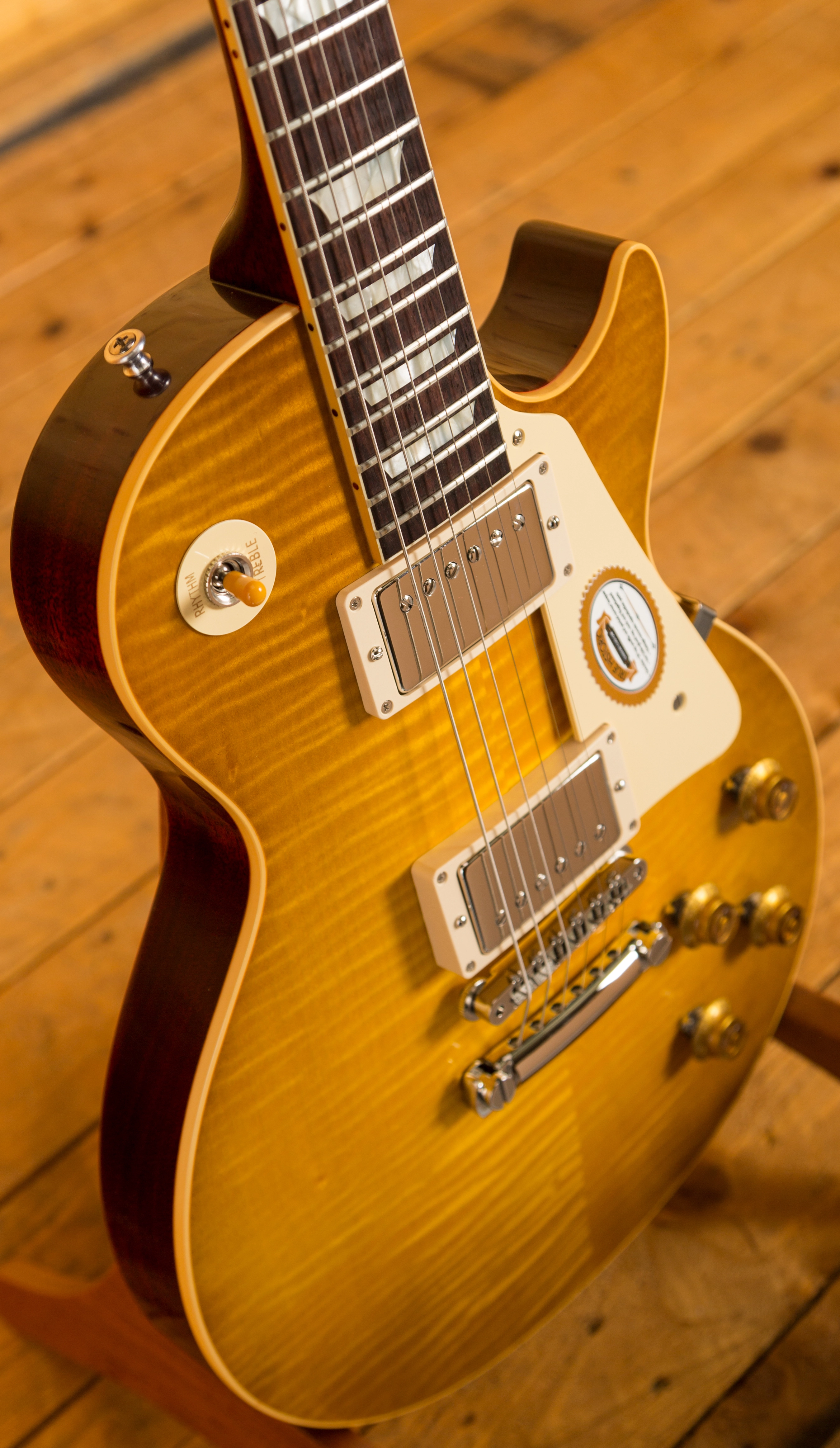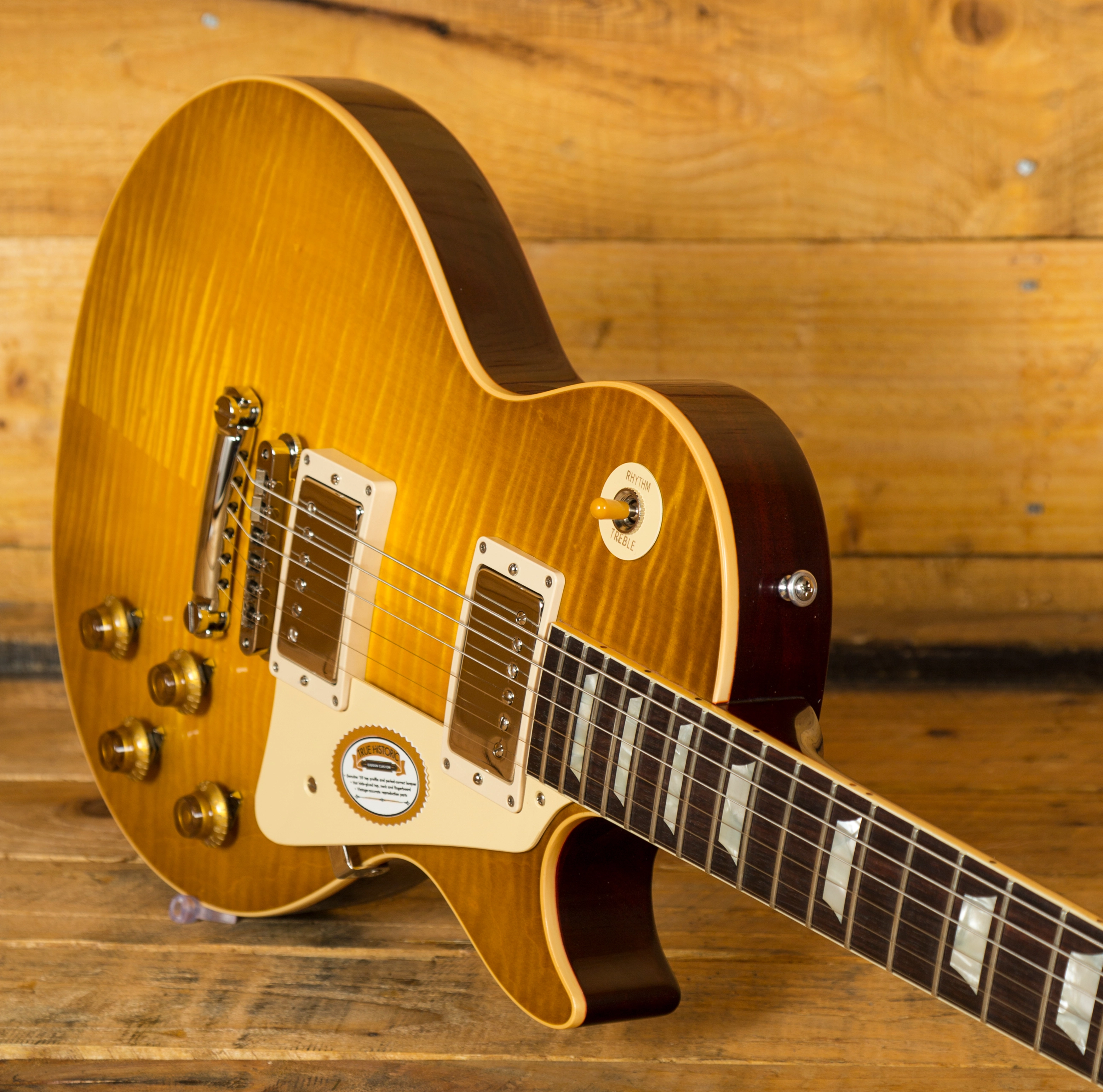 Inspired by the '60 Les Paul Standard, the True Historic '60 features a double-carved and hand-sanded Maple top. Atop a crisp Mahogany body, it is rich, resonant and authentically vintage. This time tested tonewood combo has been around since the very start and with results like this it is easy to see why. Gibson have used real hide glue to attach the top, a big plus for tone purists as hide glue is known to improve the resonance and sustain of the guitar. Finished in a period correct Vintage Lemon Burst thin layer lacquer it's as if this guitar walked straight out of the '60s.