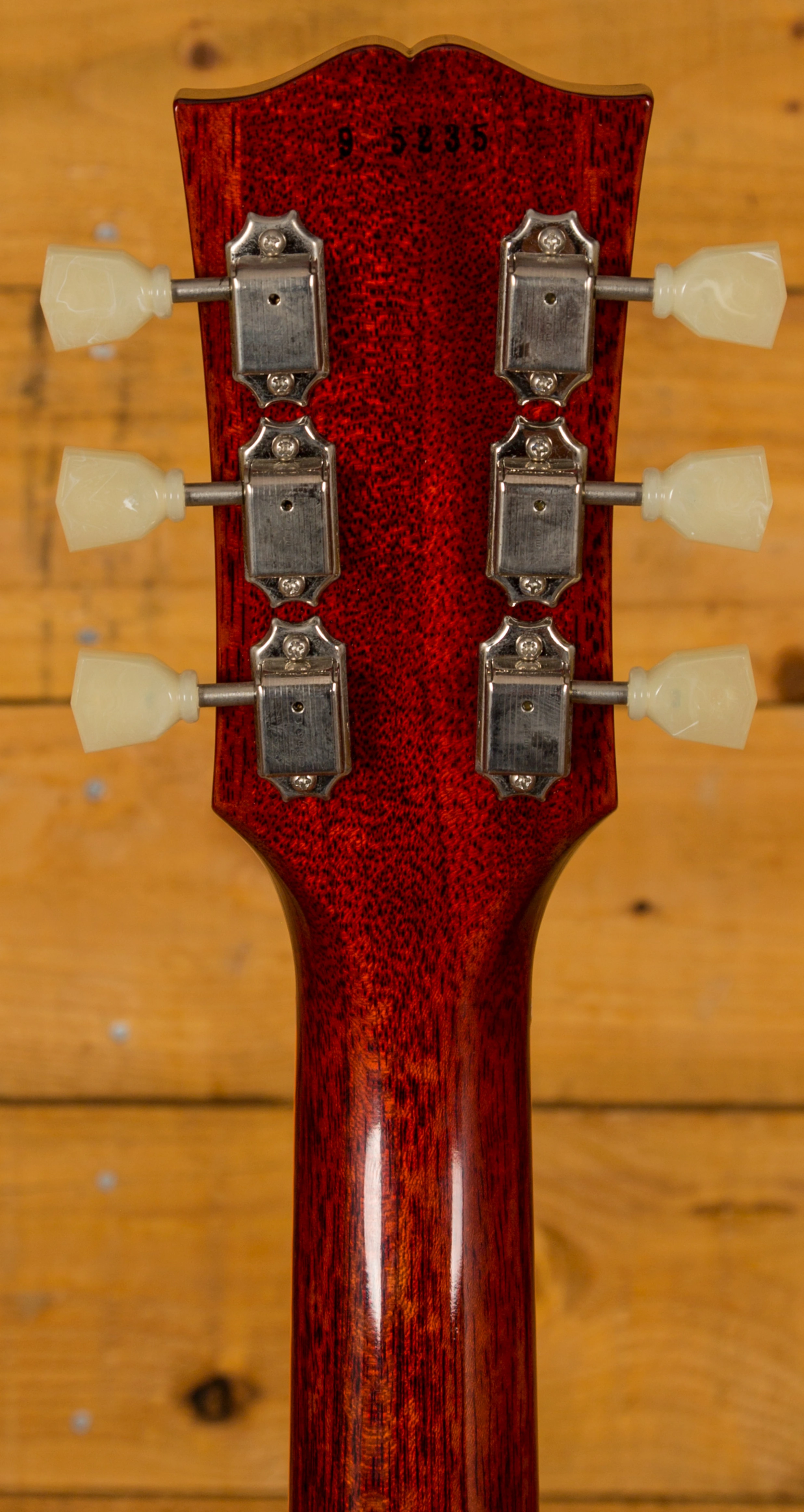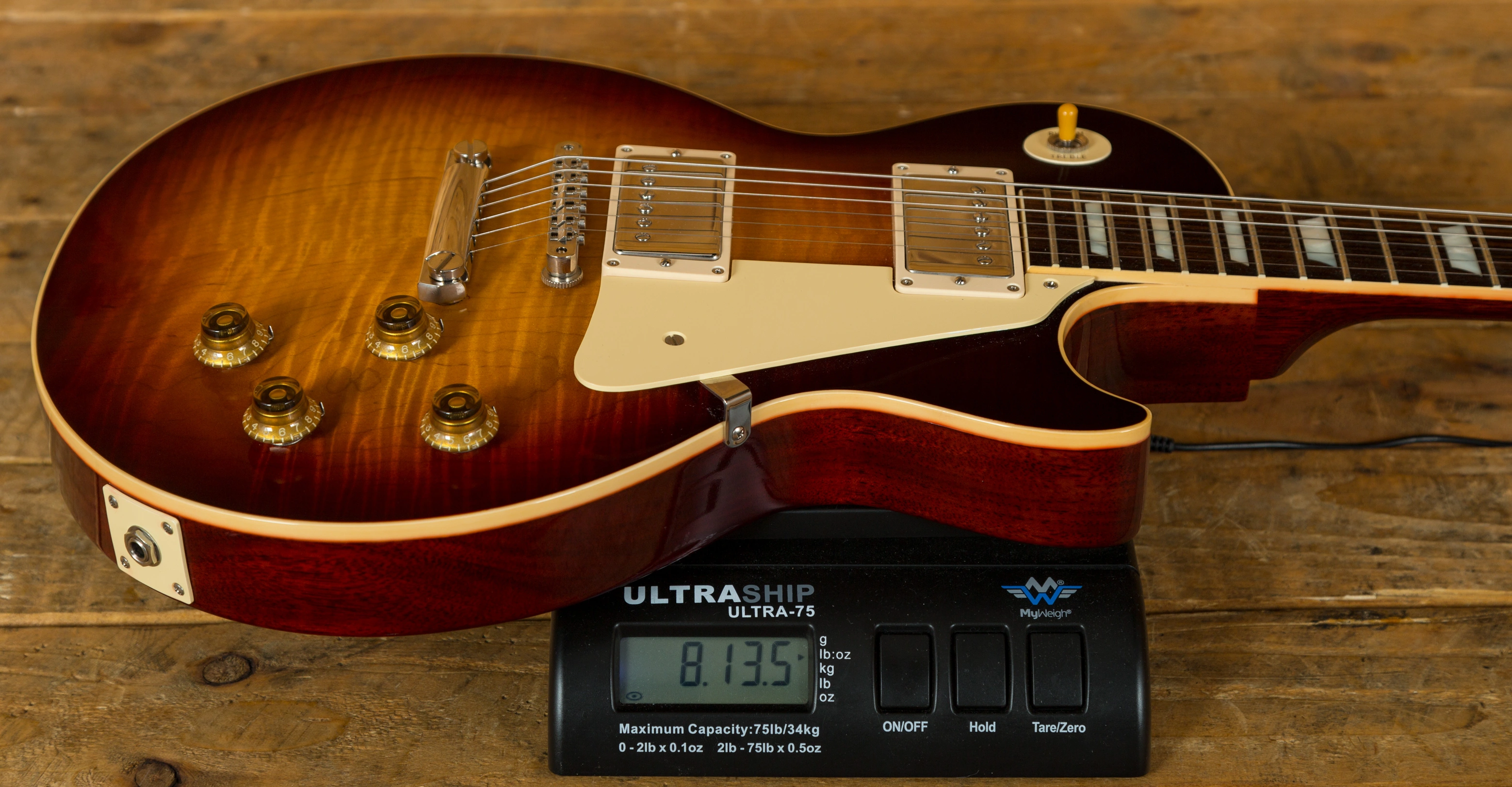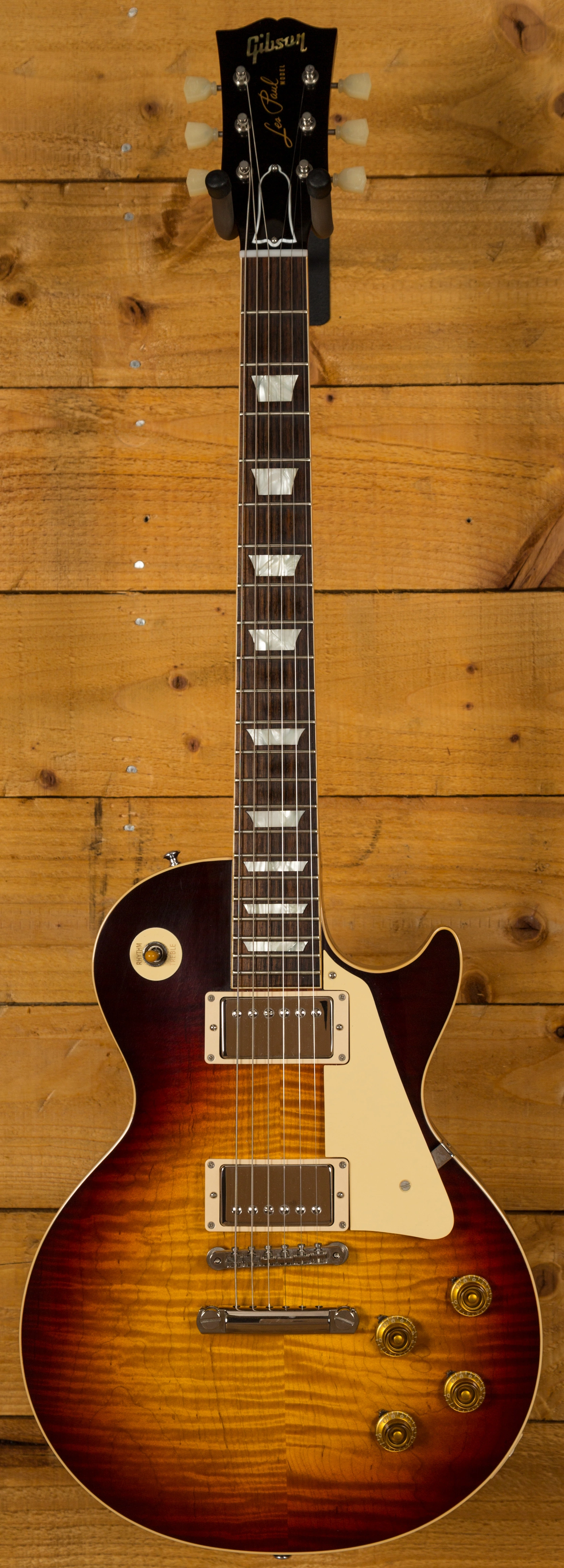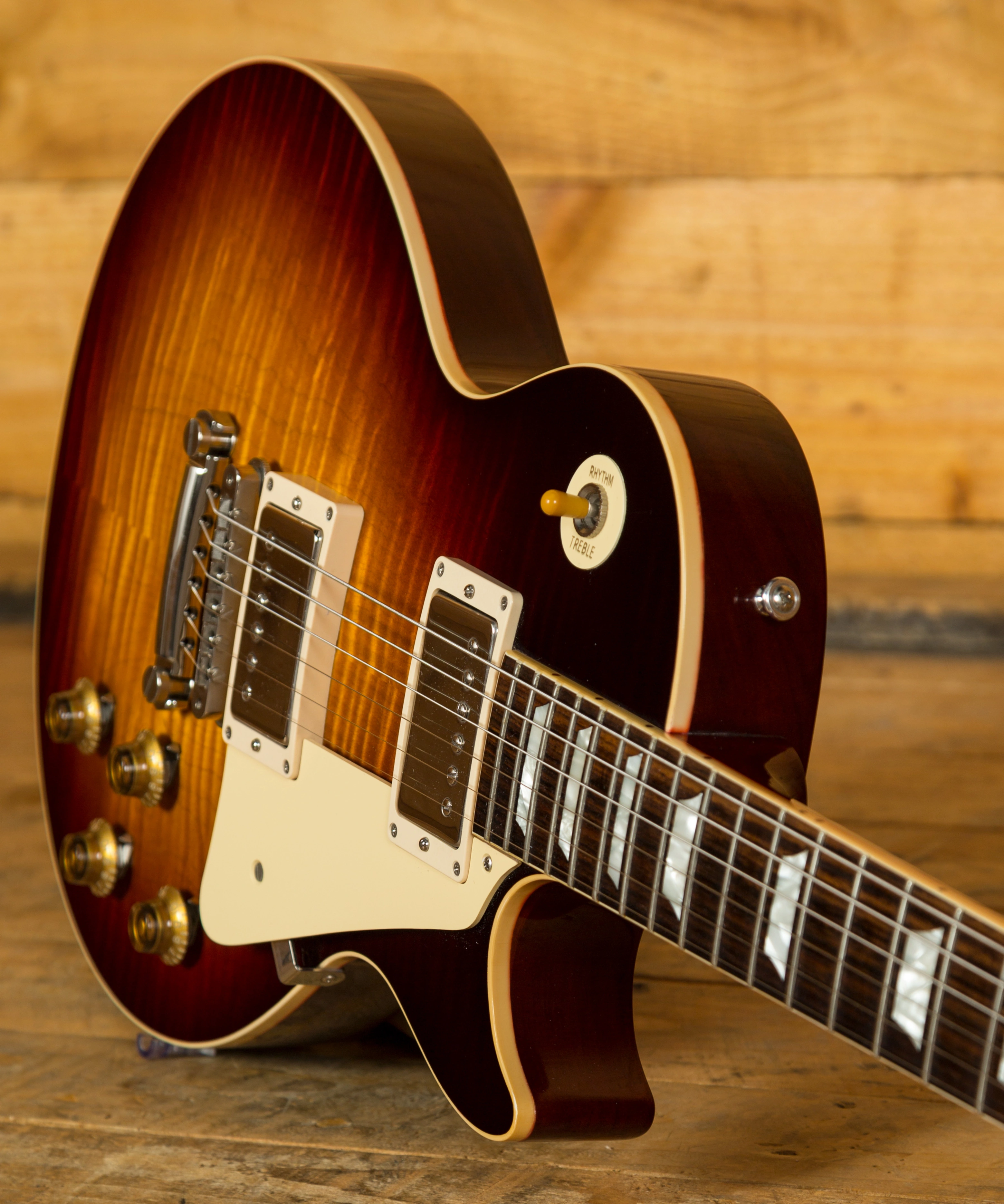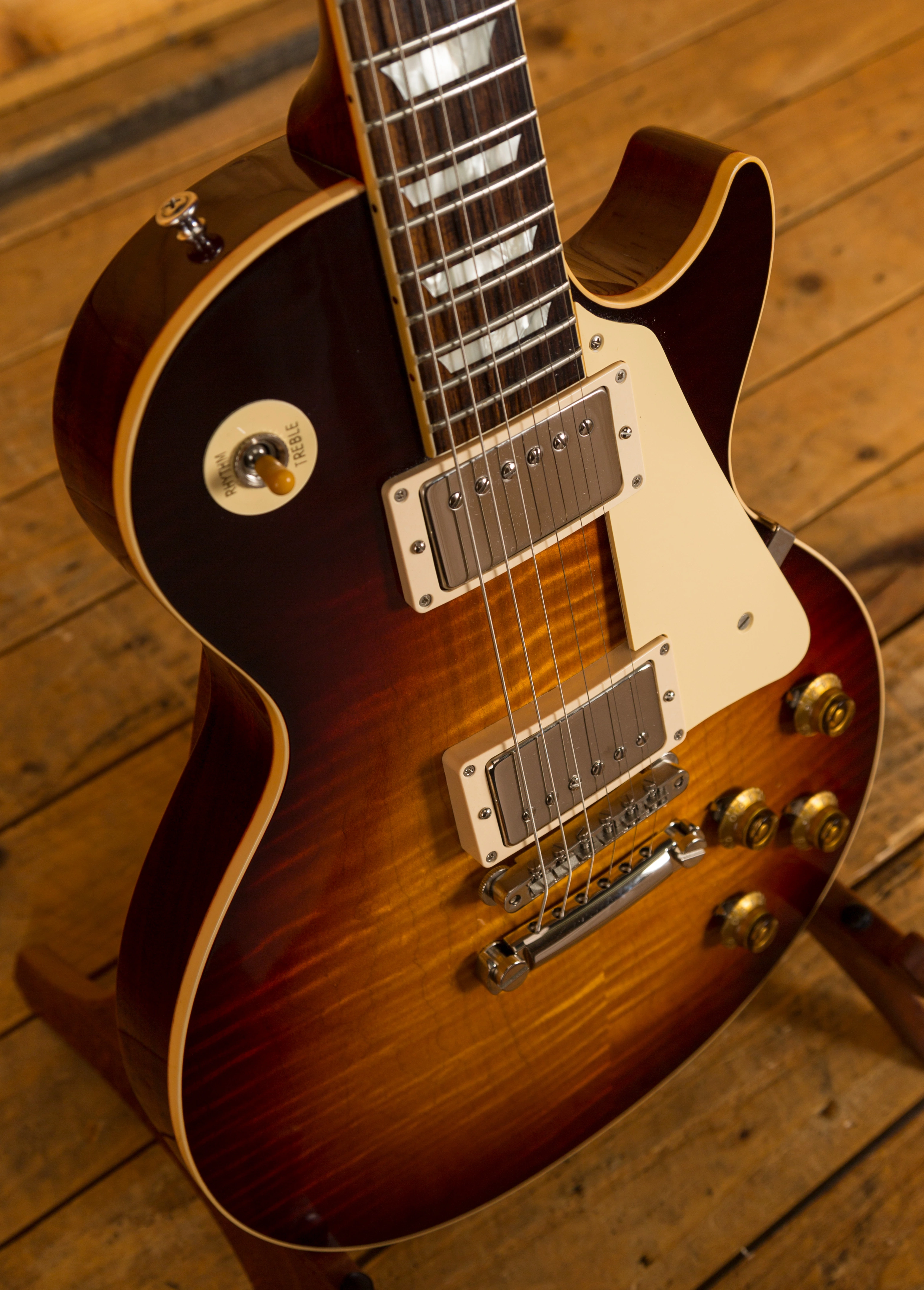 The Mahogany neck is topped with a lush solid Indian Rosewood fingerboard, with classic Gibson Trapezoid inlays this guitar looks every bit the real deal. The neck is set using genuine hot hide glue, this vintage technique is said to increase tonal response when compared with modern synthetic glue, just adding to this guitars tone monster status.