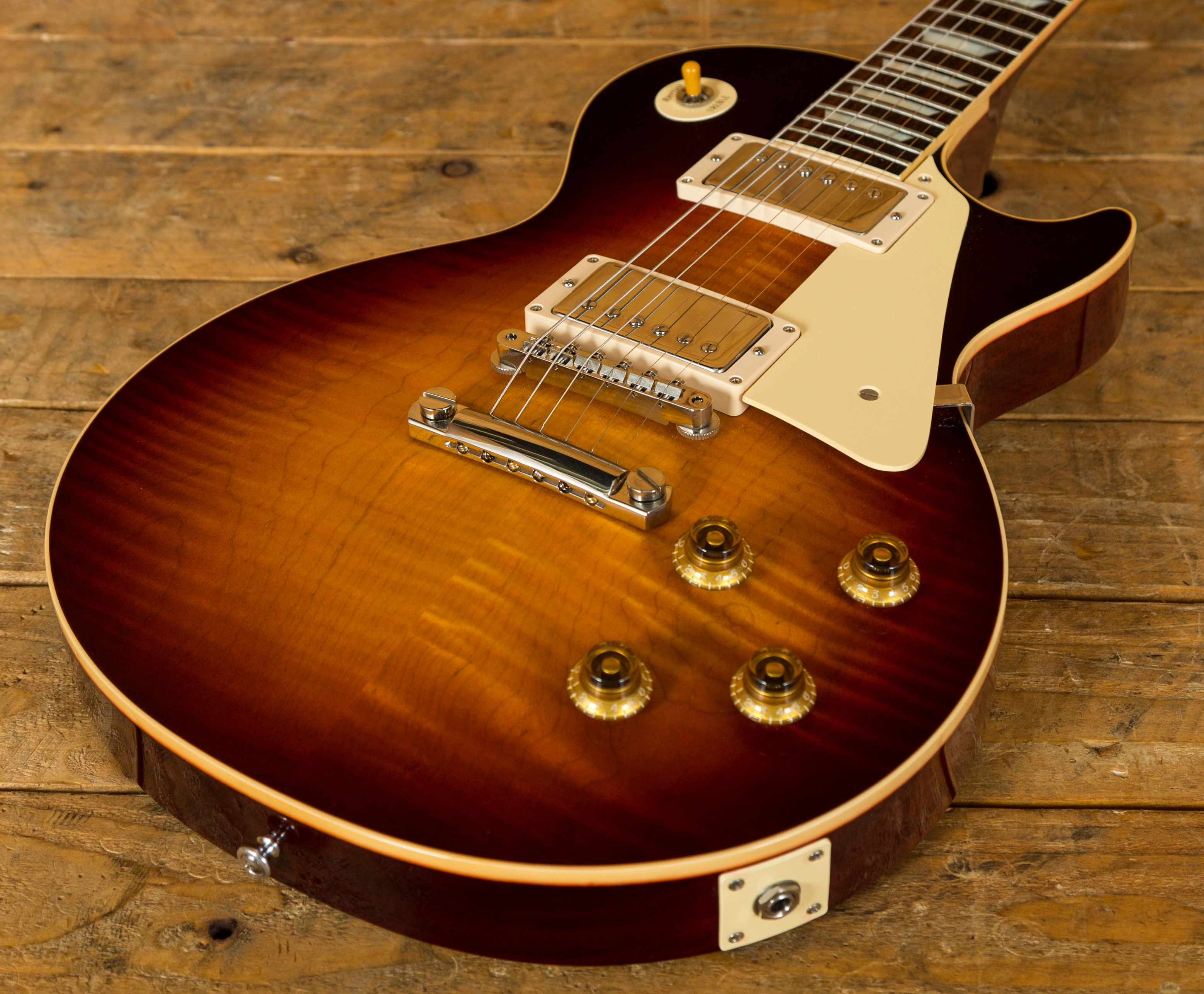 With a traditional solid Mahogany body, this Les Paul benefits from a majestic Figured Maple top for the ultimate tonewood partnership. Rich and super resonant it offers premium tone and timeless aesthetics. In a distinctive Dark Burst finish, the thinner True Historic wet sanded finish is time and labour intensive but does yield the most effective vintage results.