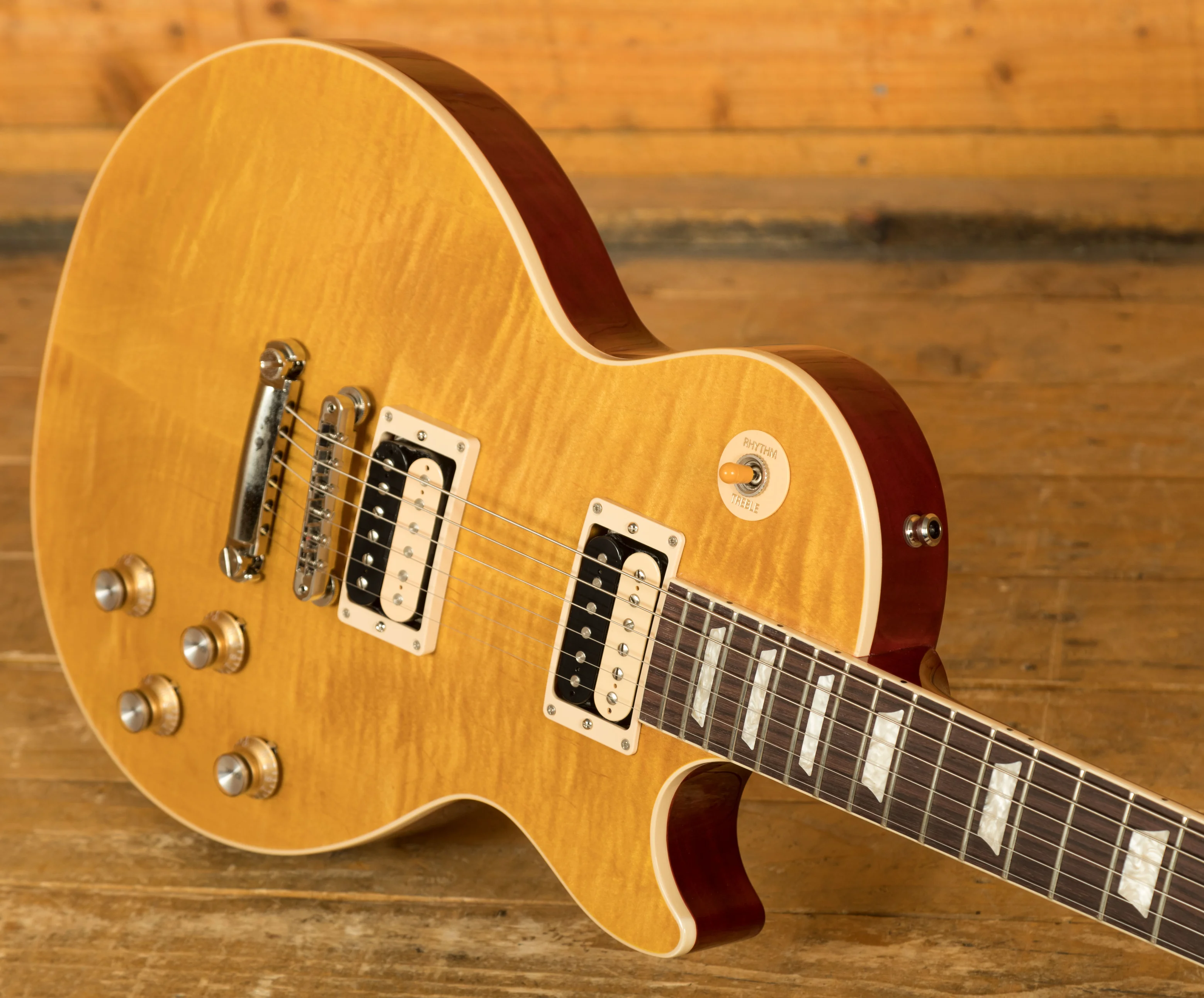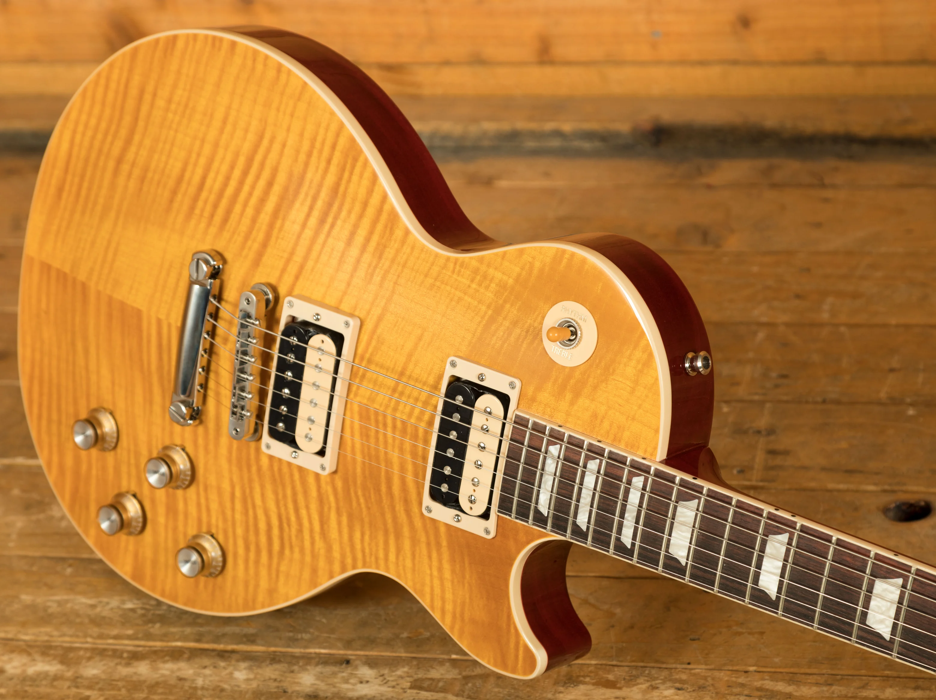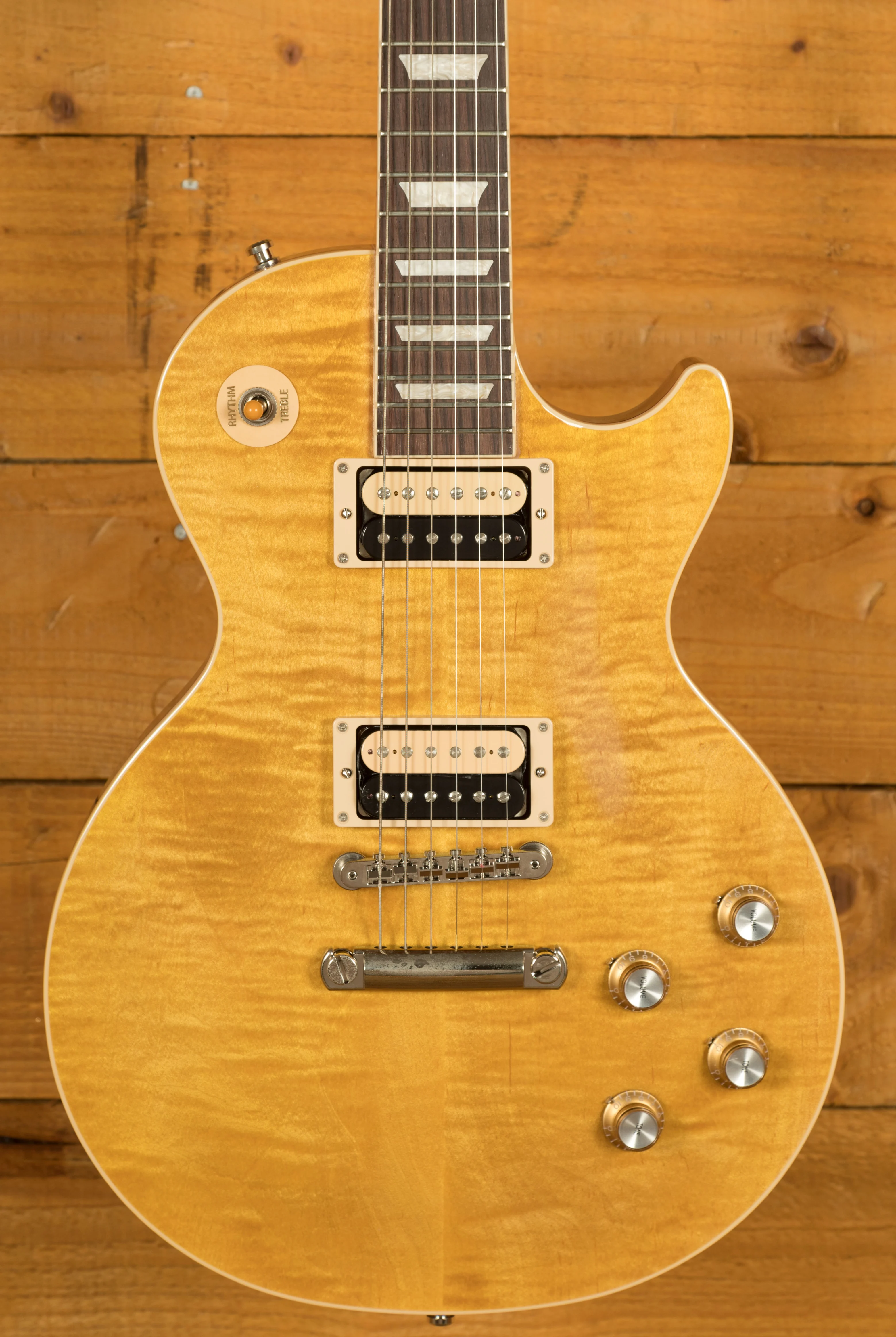 With a Solid Mahogany body it rocks a AAA Flame Maple top for that all time ultimate tonewood combination. The prominent Appetite Burst finish is bold, vivid and the perfect look for a standout player like Slash.