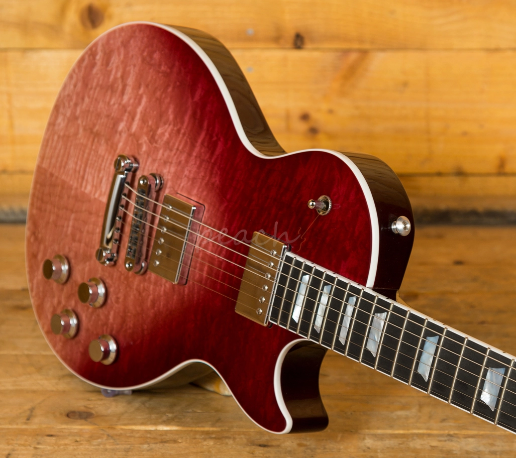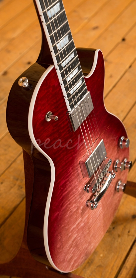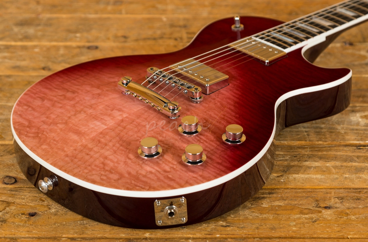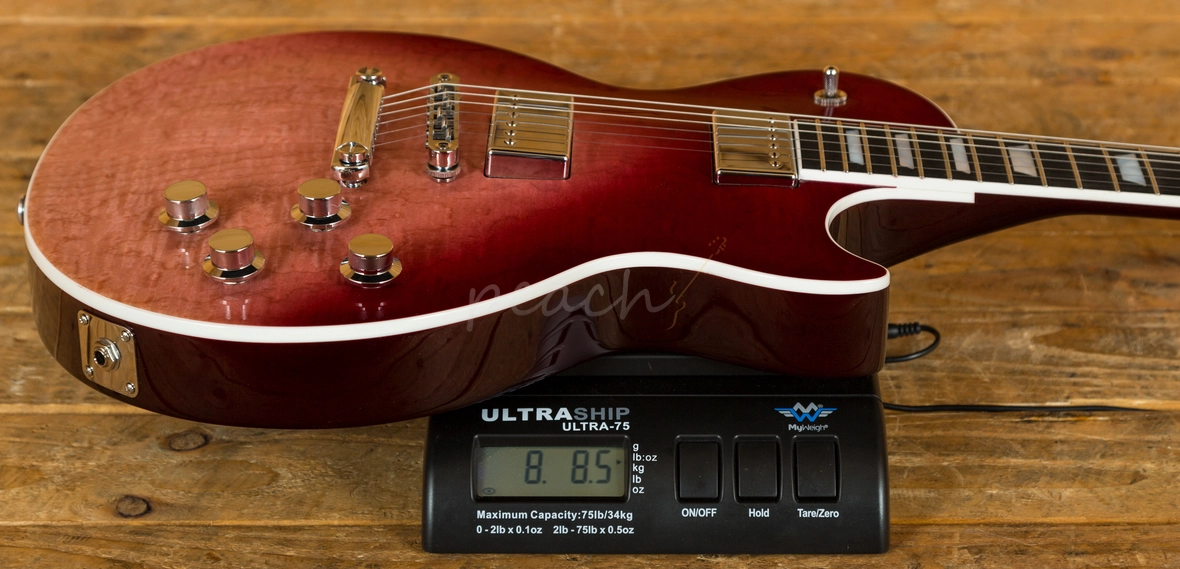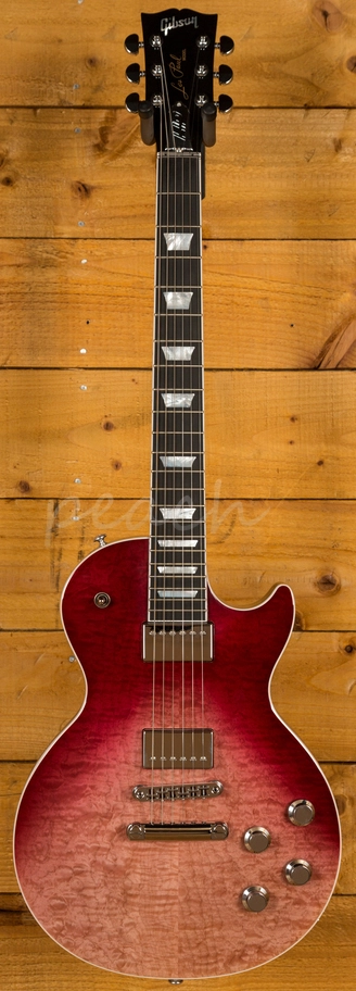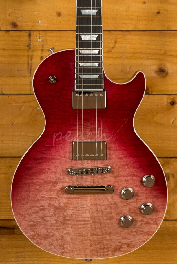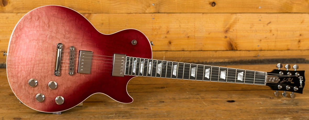 A stunning Grade-AAA figured maple top, finished in the amazing Hot Pink Fade, offers a modern take on the classic 50's Bursts, and with Gibson's Ultra-Modern weight relief, this Les Paul benefits from enhanced resonance and sustain without the back breaking weight.