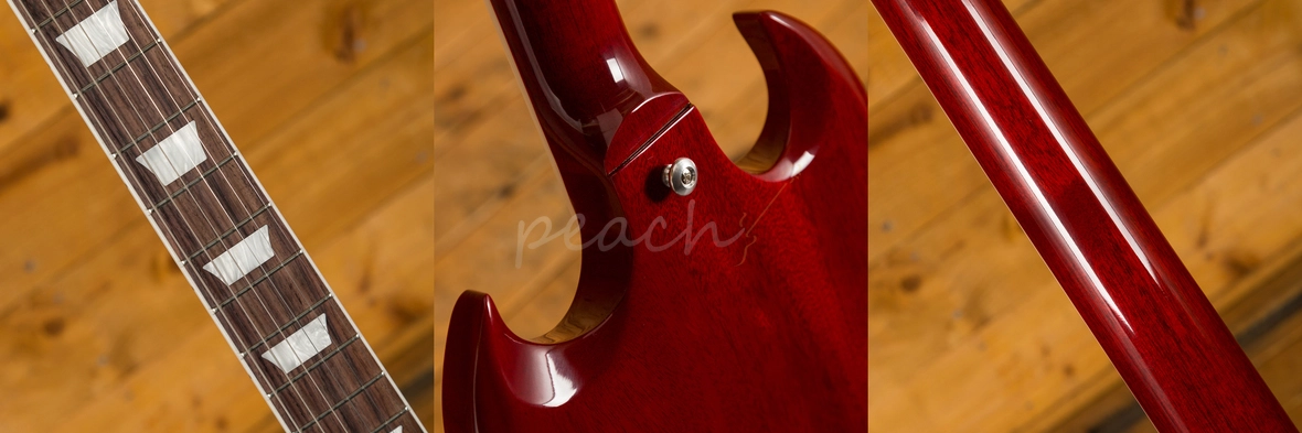 A classic all Mahogany body finished in a gorgeous Heritage Cherry gives this guitar that beautiful vintage Gibson look while a Mahogany neck and Rosewood fingerboard, with its fast and comfortable slim taper neck profile, enhance the rich tone.