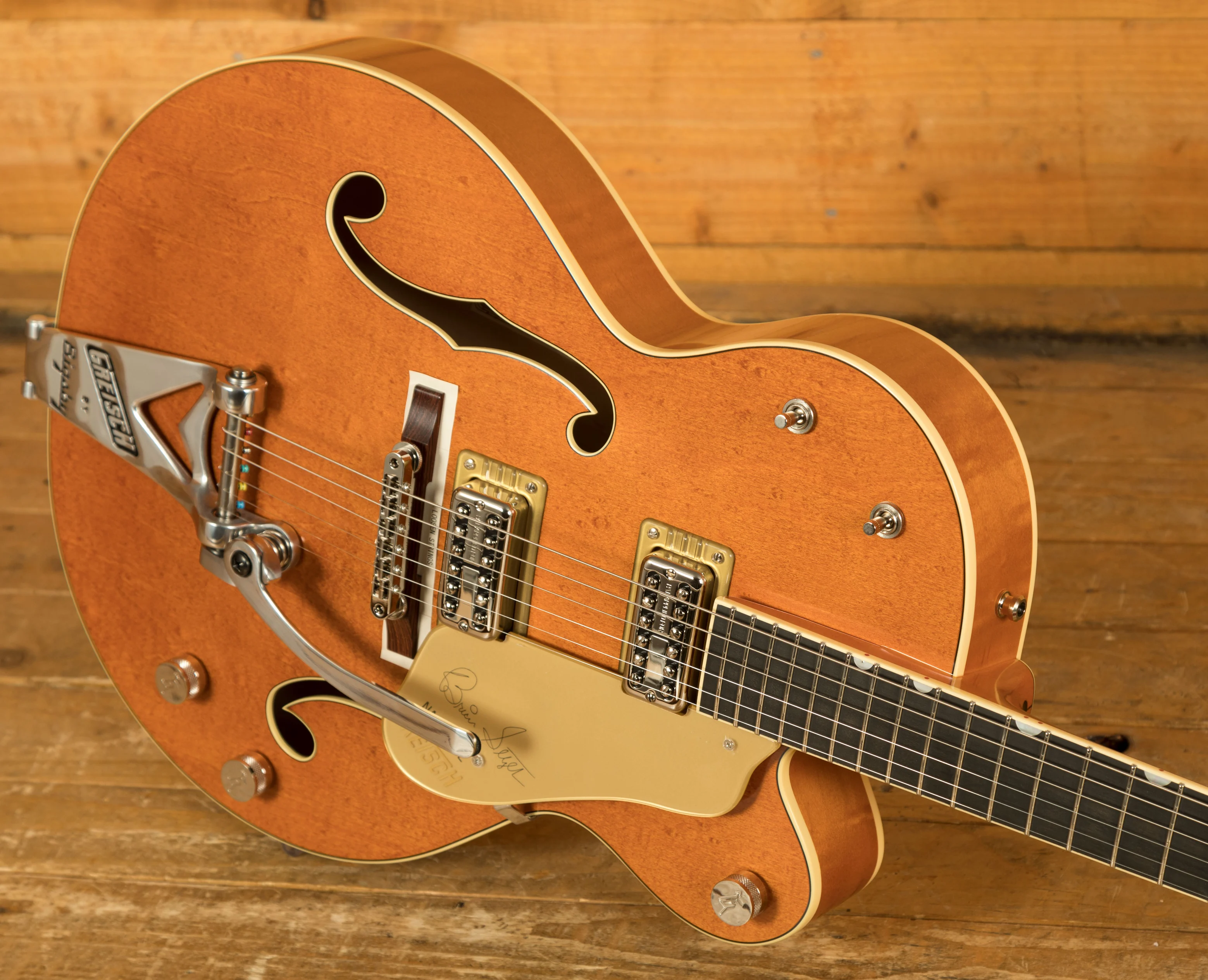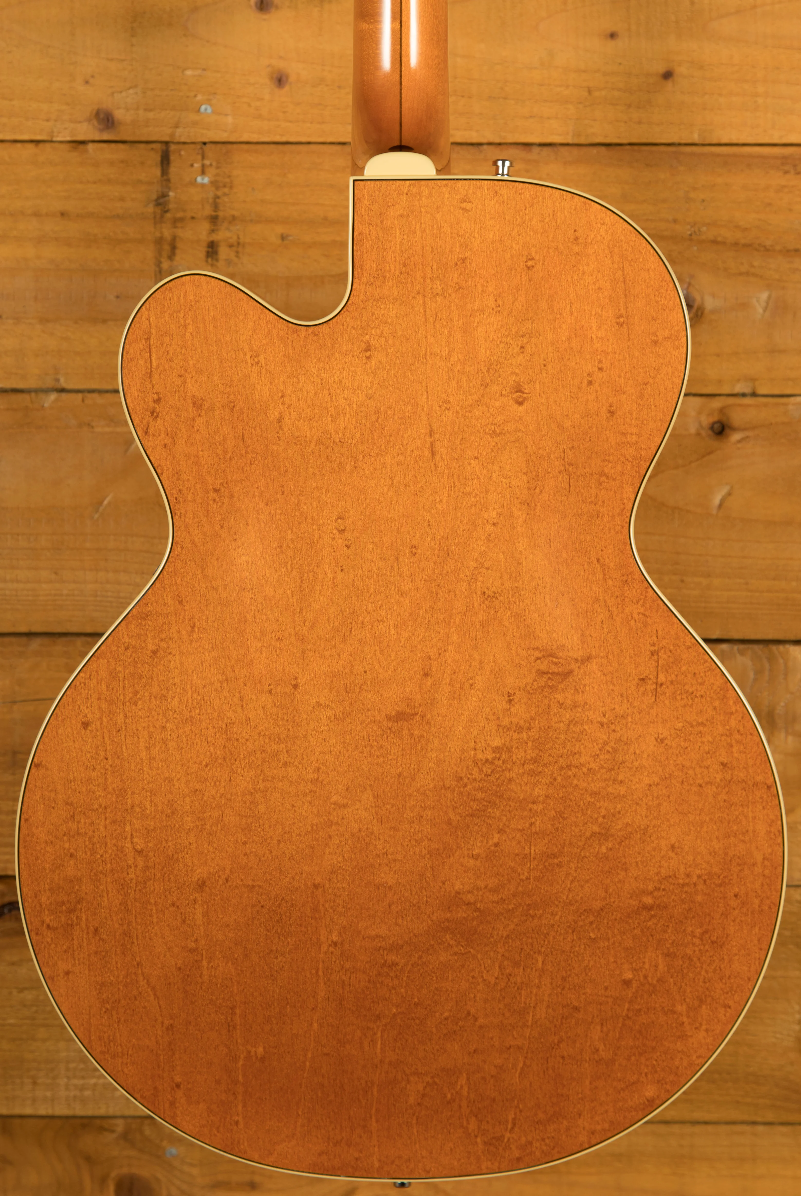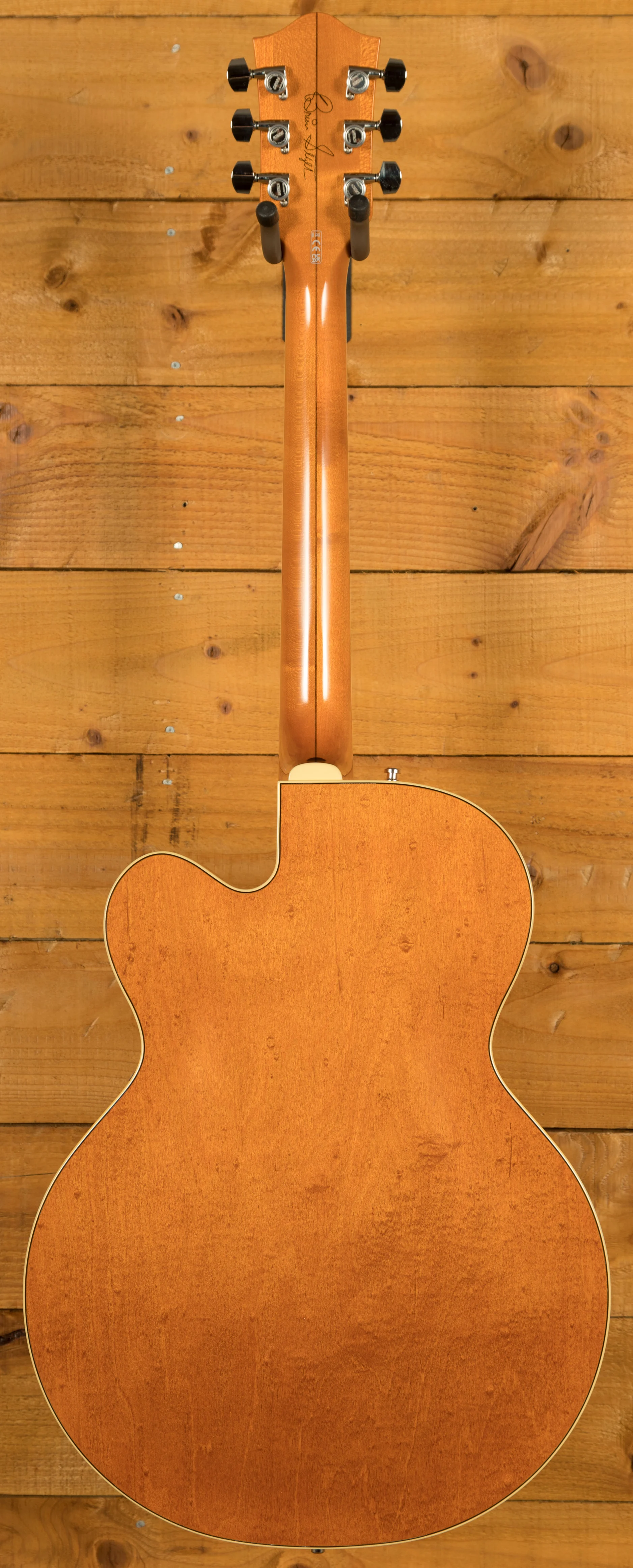 The "Smoke" features a 2.5" single-cutaway hollow body constructed with an arched laminated maple top and 1959 trestle bracing. These features, combined with oversized F-holes, contribute to improved sonic projection, making the guitar acoustically resonant and suitable for stage use. The semi-gloss "Smoke Orange" lacquer finish, along with rolled fingerboard and body edges, provides a comfortable, broken-in feel reminiscent of vintage G6120s from the 1950s.