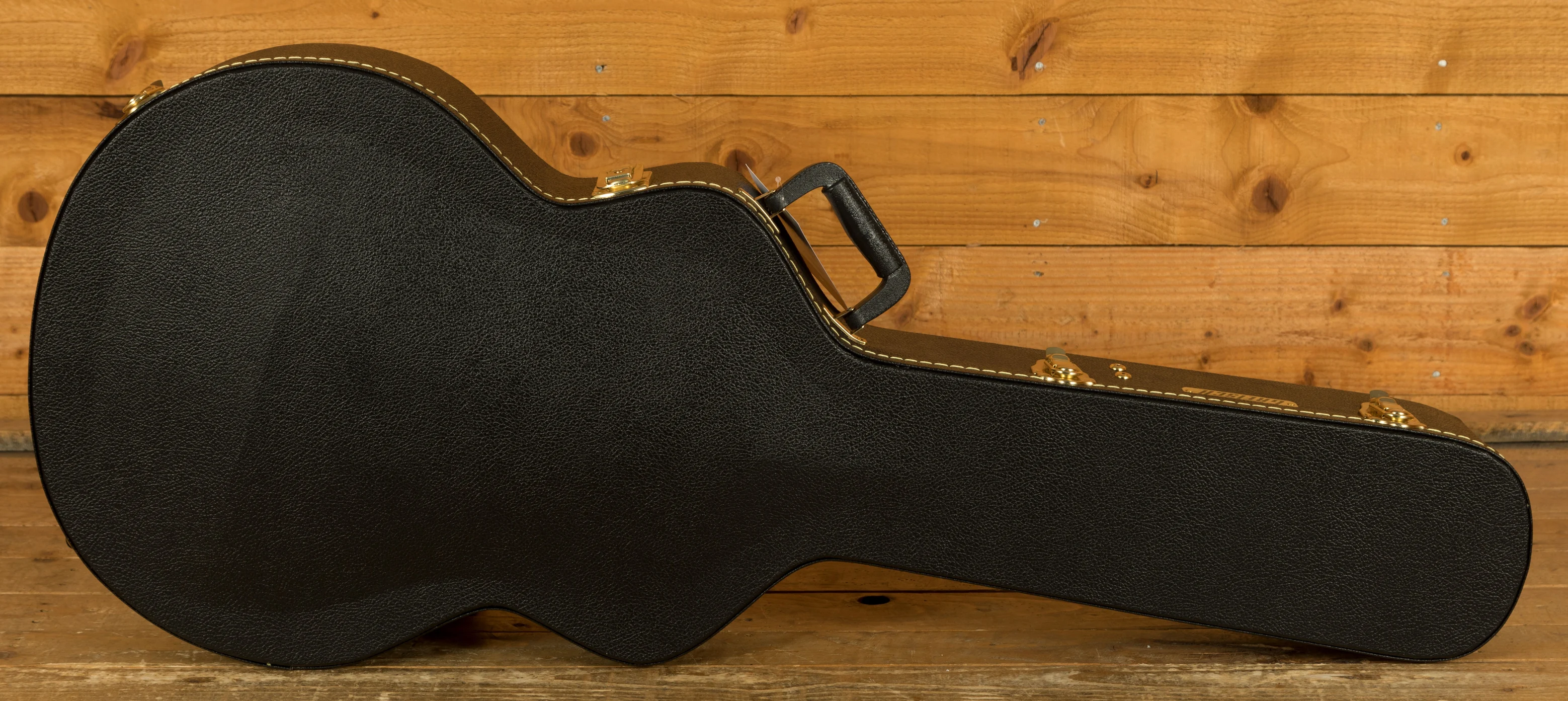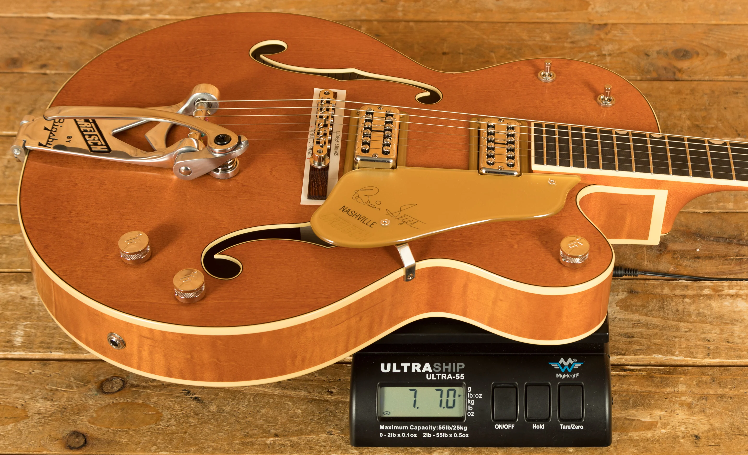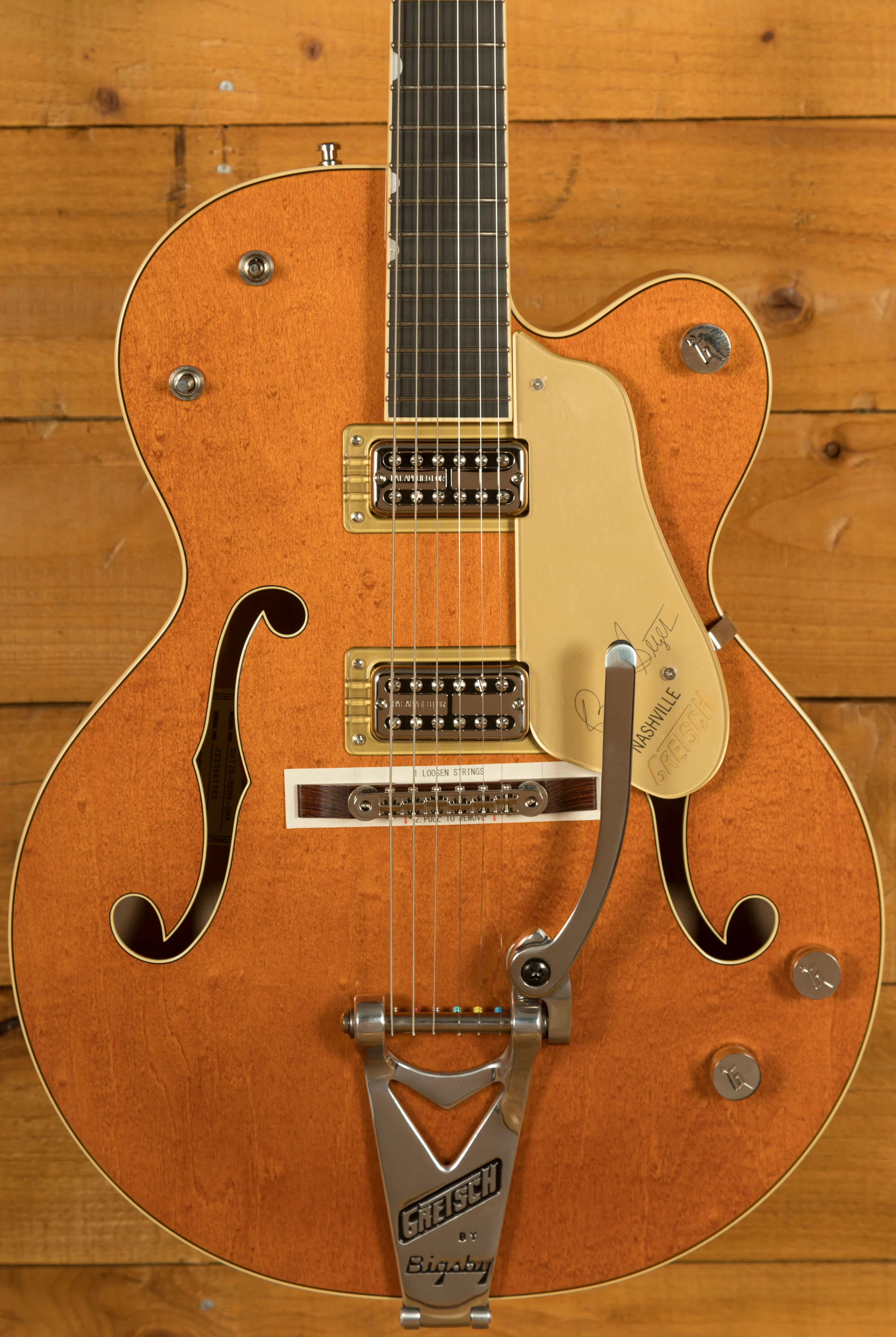 The "Smoke" features a 2.5" single-cutaway hollow body constructed with an arched laminated maple top and 1959 trestle bracing. These features, combined with oversized F-holes, contribute to improved sonic projection, making the guitar acoustically resonant and suitable for stage use. The semi-gloss "Smoke Orange" lacquer finish, along with rolled fingerboard and body edges, provides a comfortable, broken-in feel reminiscent of vintage G6120s from the 1950s.