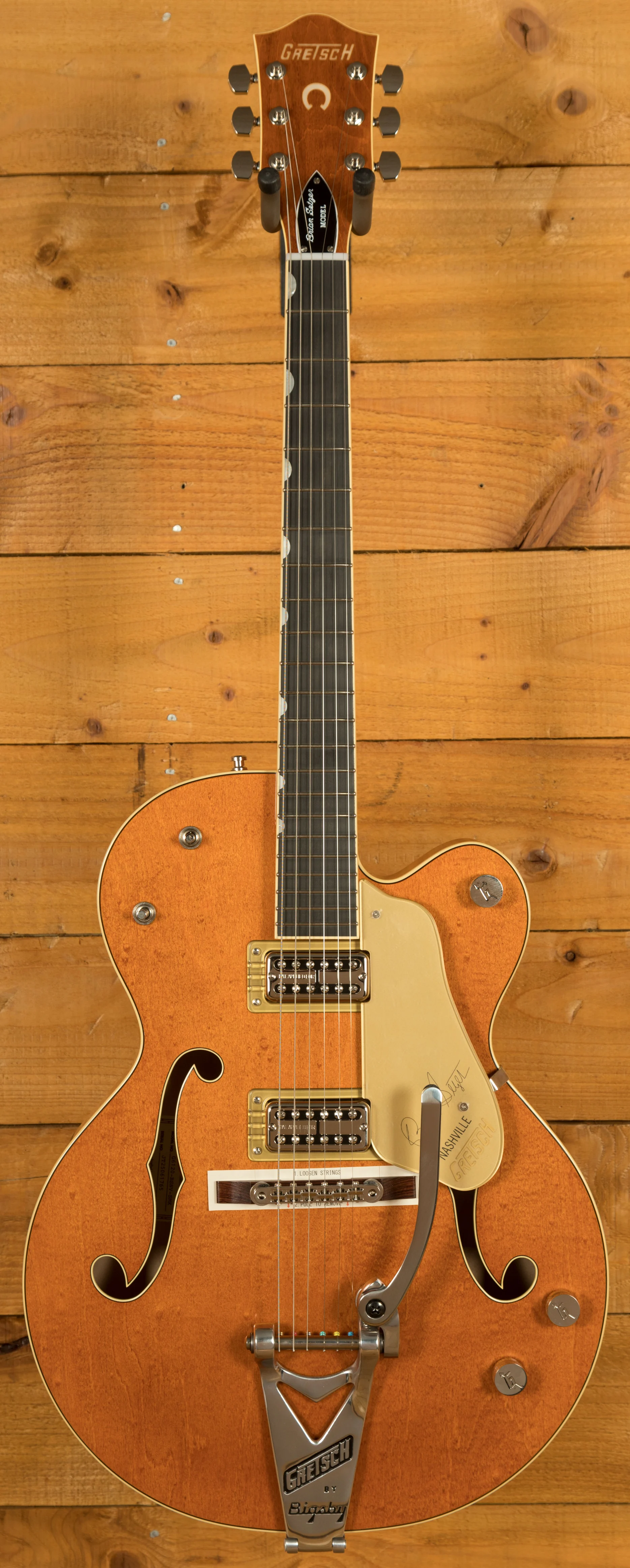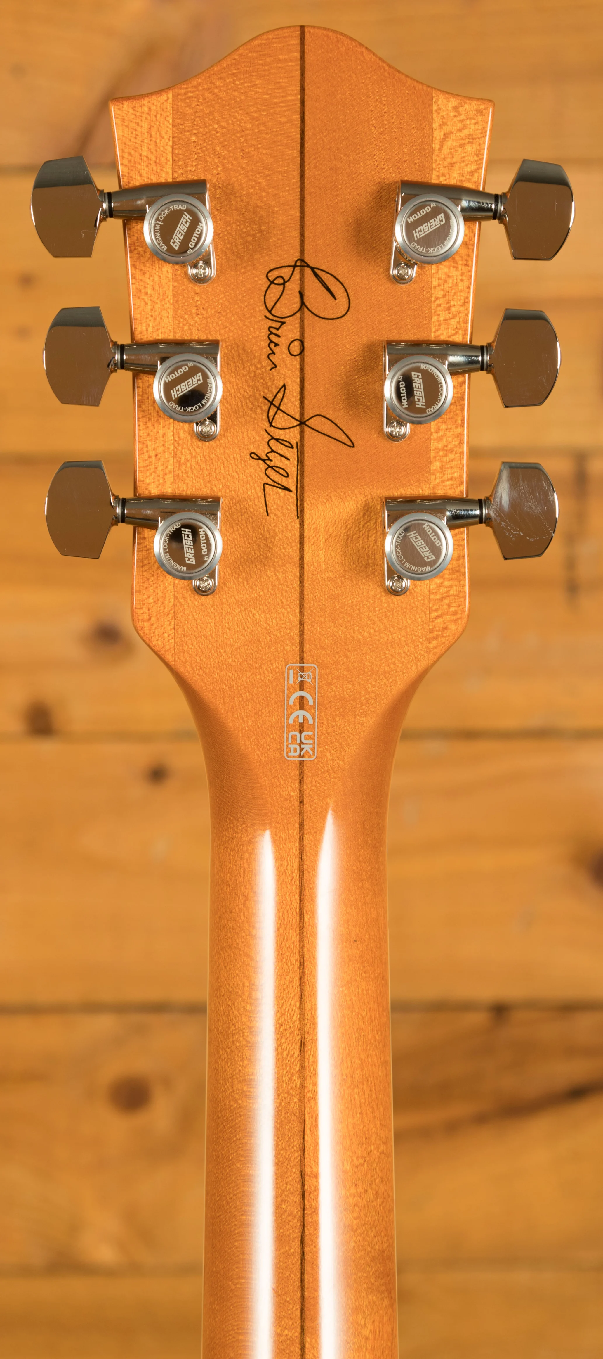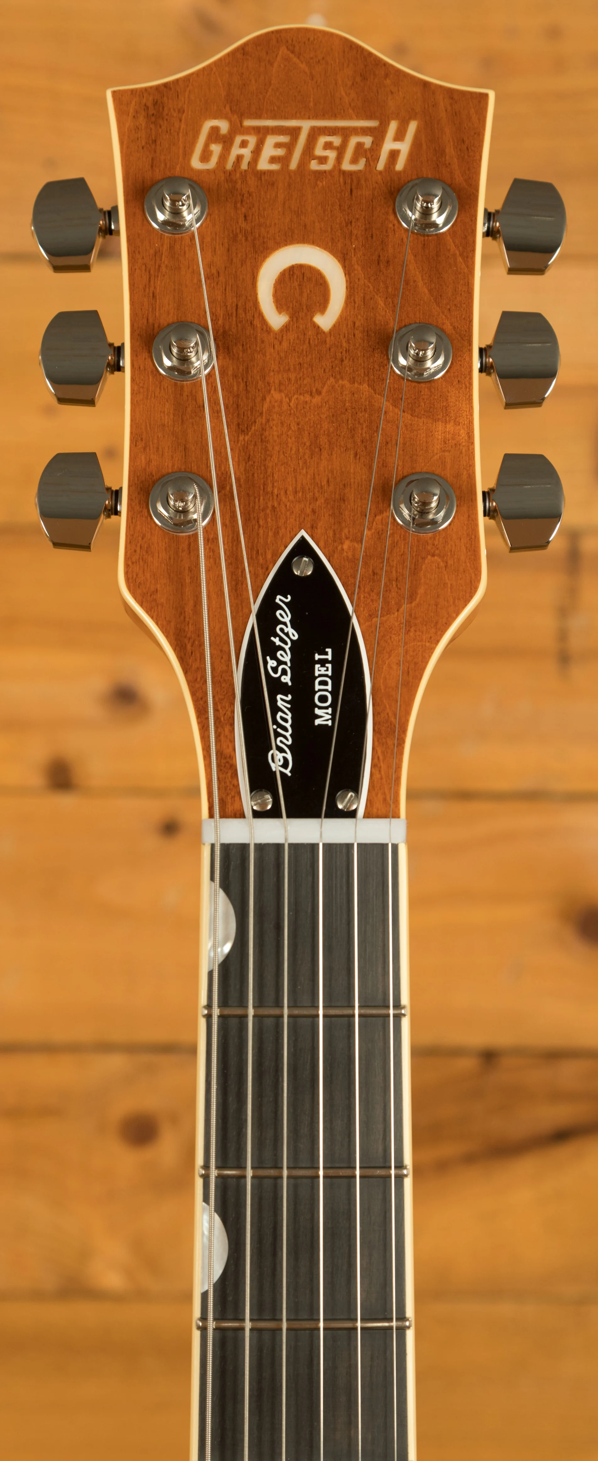 The Gretsch G6120T-BSSMK Brian Setzer Signature Nashville Hollow Body '59 "Smoke" with Bigsby, Ebony Fingerboard, and Smoke Orange finish, is a meticulously crafted instrument designed to replicate Brian Setzer's main stage guitar. This guitar pays homage to a pivotal figure in rockabilly and swing music, Brian Setzer, whose career spans from the Stray Cats to the Brian Setzer Orchestra. This signature model embodies both the vintage aesthetics and the performance enhancements that Setzer has incorporated into his instruments over the years.