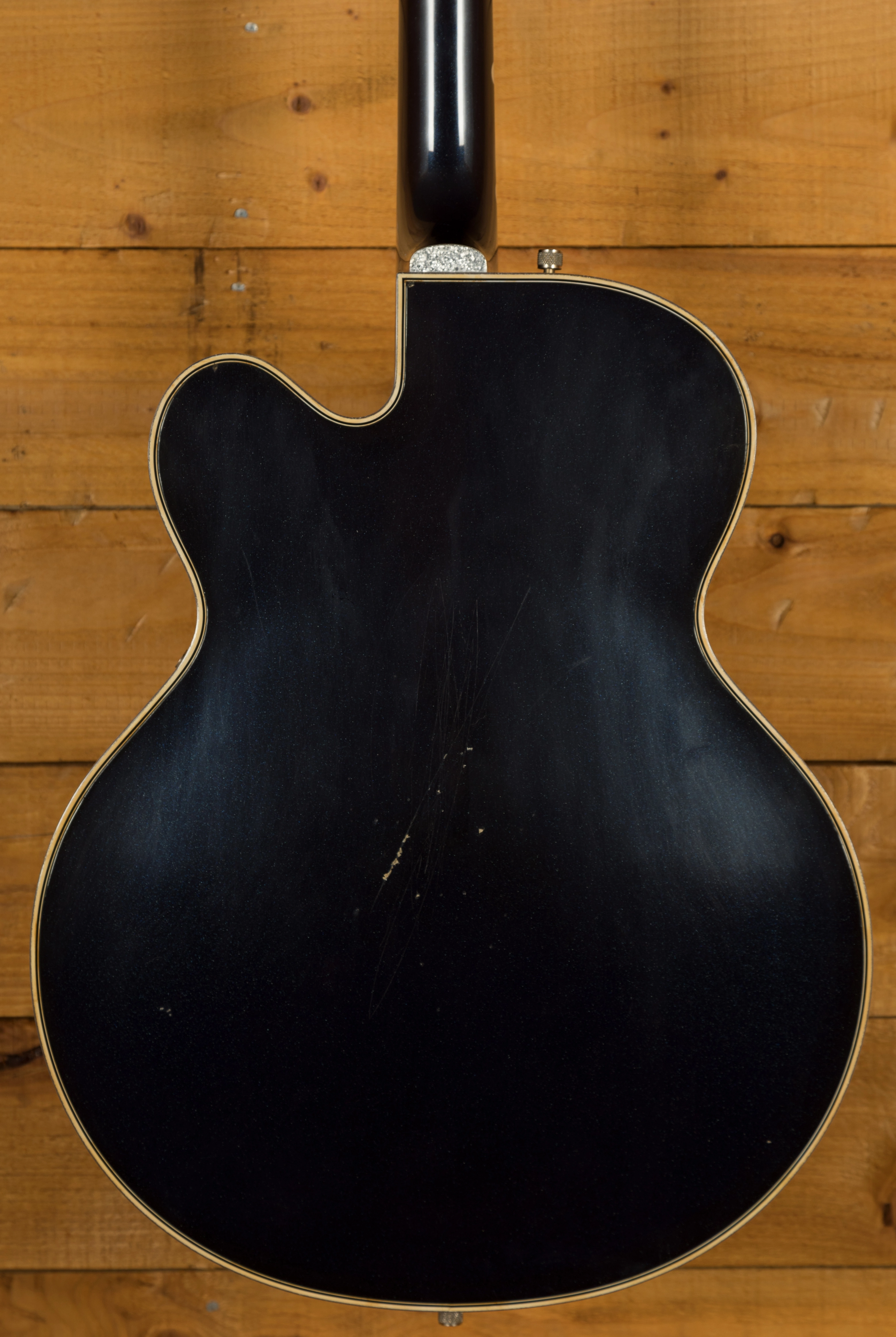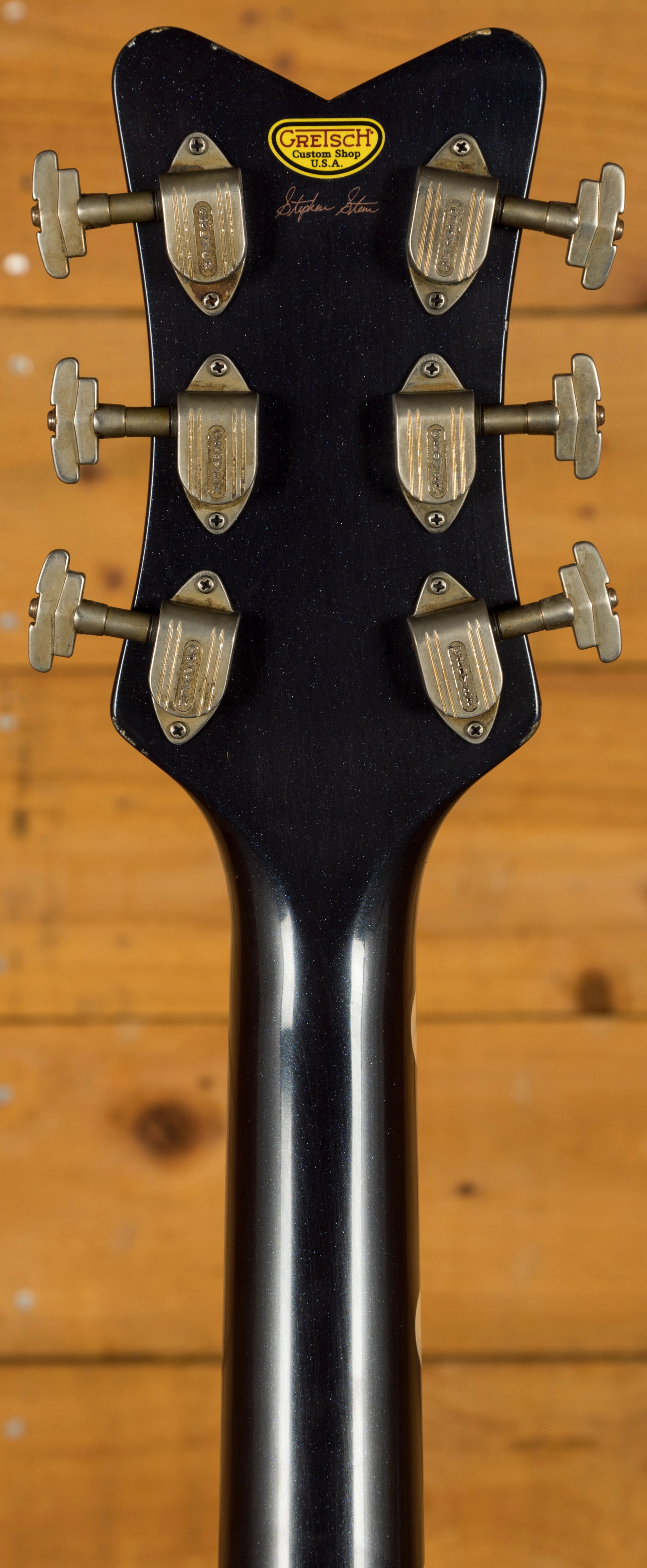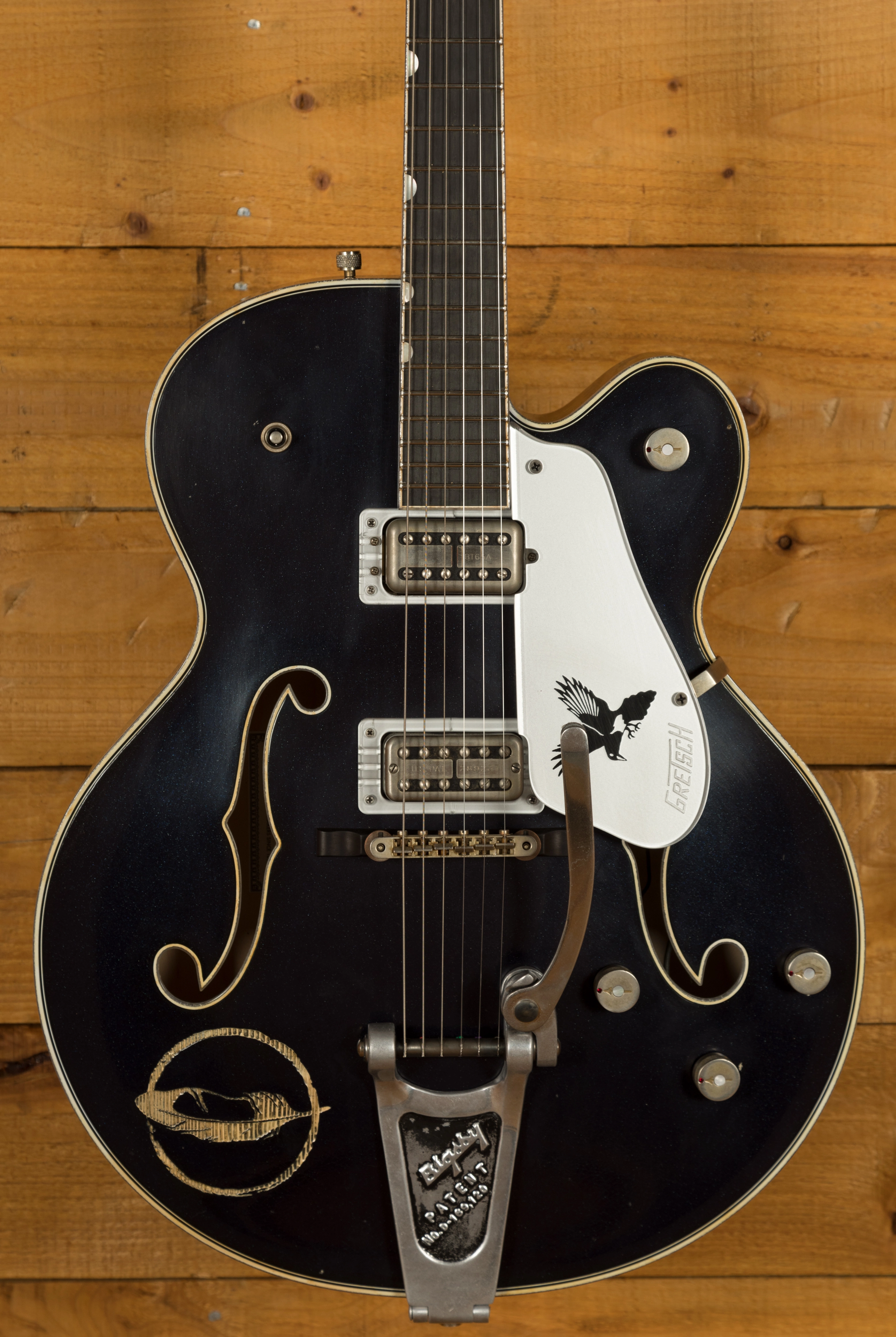 The Laminate Maple body with a solid Spruce top is finished in authentic Raven's Breast Blue Relic, and with the delicious chrome hardware, it looks every bit the classic Gretsch. The silver pickguard is complemented by the Magpie logo and Rich's Feather and Circle symbol which is carved into the top. It's a unique look that really makes this guitar stand out.