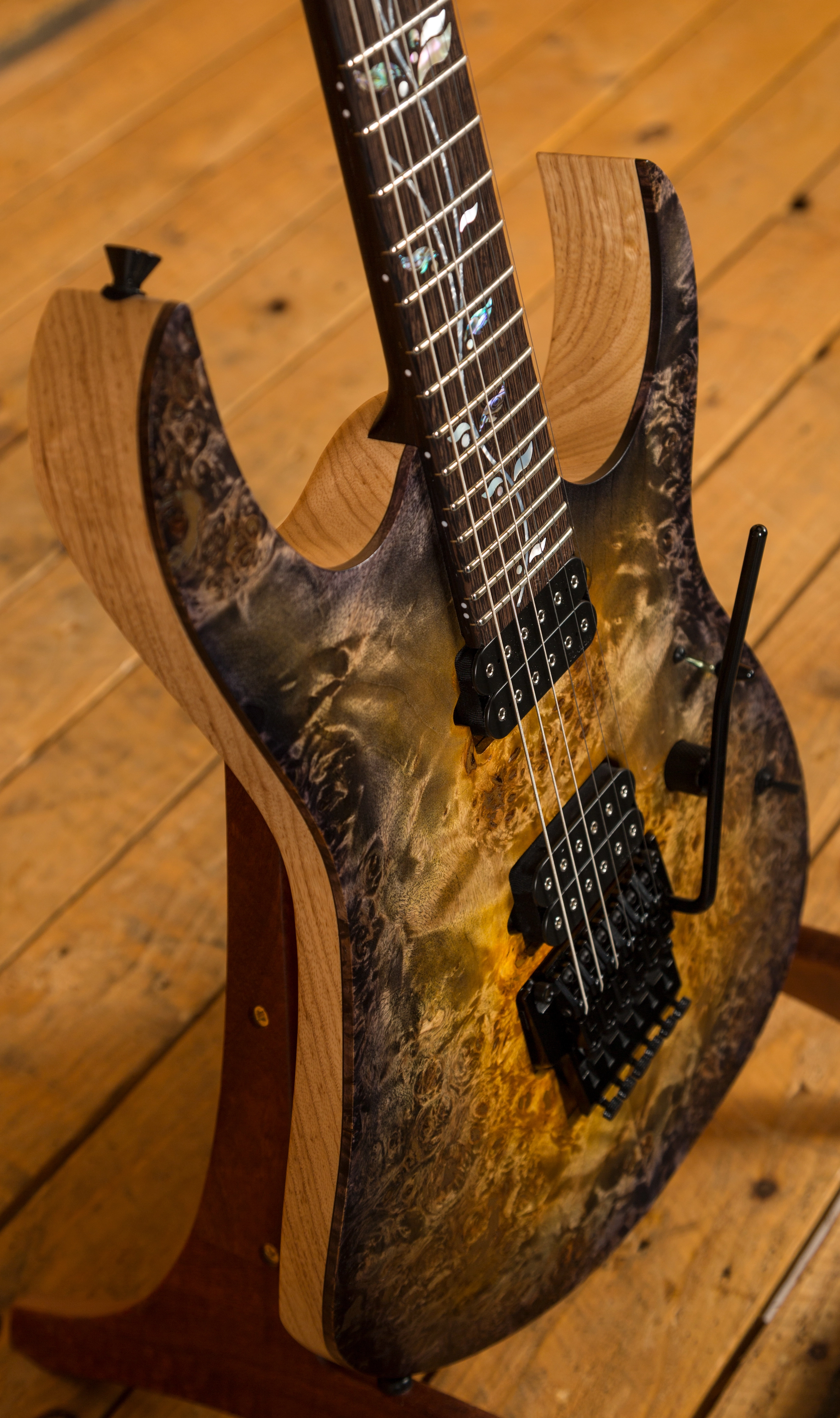 A 3 piece J Custom Maple/Wenge/Purpleheart Asymmetric Super Wizard neck is adorned with a Wenge fingerboard featuring the Tree of Life inlay. It's designed for speed and precision, perfect for today's players. A Lo-Pro Edge tremolo bridge complements the design and allows you to dive bomb and flutter without compromising on tuning stability and intonation.