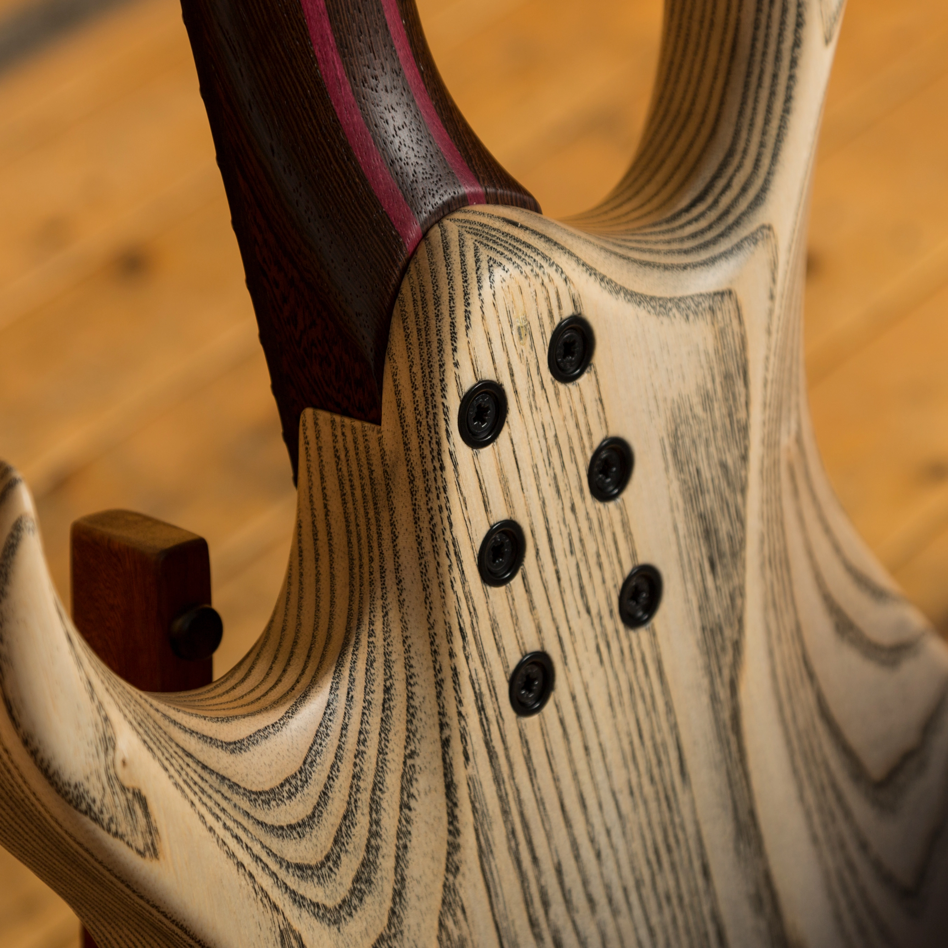 The Wenge/Purpleheart neck boasts a slick Ebony fingerboard, with 24 stainless steel frets and a 25.4" scale length, its comfortable and fast. The 16" radius feels great under hand and offers a platform perfect for both low end riffing and treble side lead work.