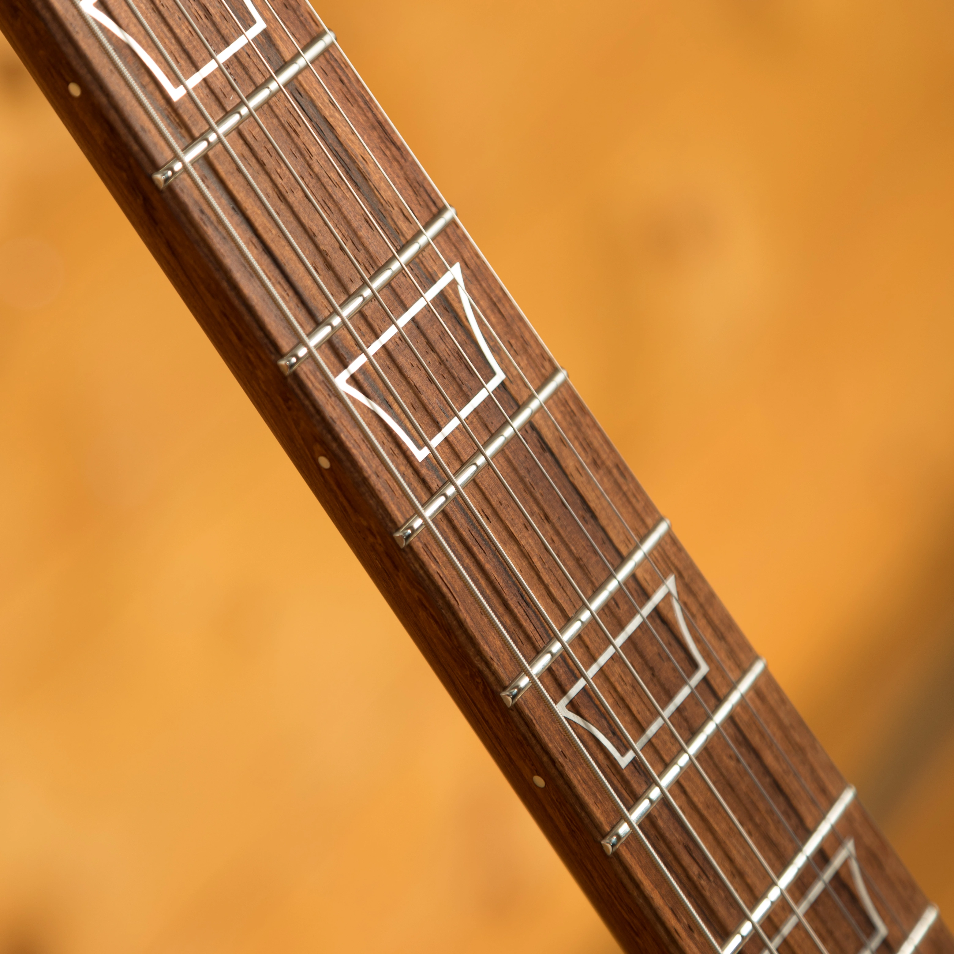 The Madagascan Rosewood neck and fingerboard feels great underhand, with a 25.5" scale length, 22 medium jumbo frets and a 10"-14" compound radius, it's a modern design with a real vintage heart. The Silver Sterling Crown Rings inlays are stunning, every element of this guitar has been considered to the highest level.