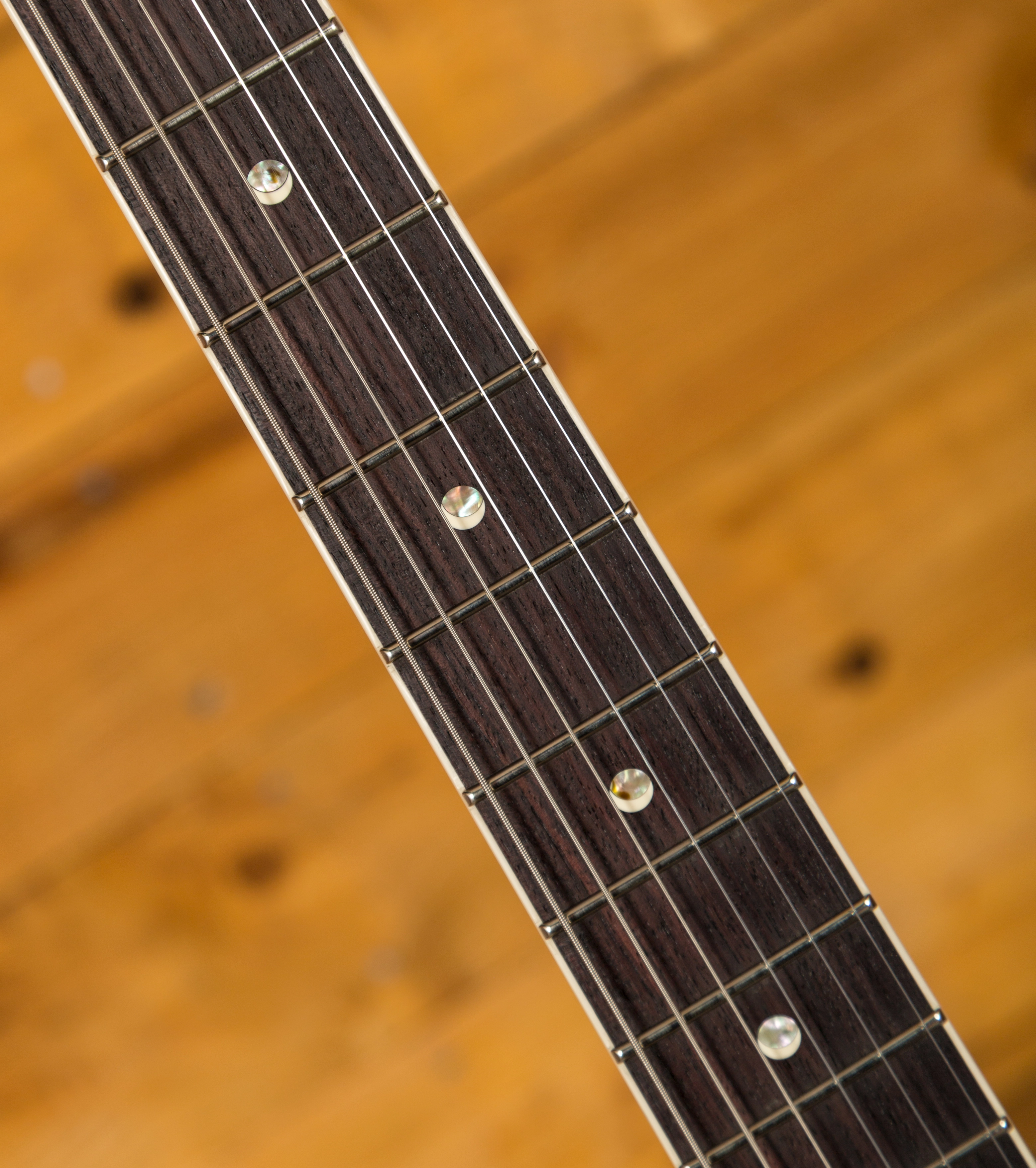 With a stunning carved figured maple top and mahogany back, it looks every bit as good as it sounds. Finished in a stunning Faded Whale Blue, the DGT is a real tone machine! A 22 fret Rosewood fingerboard proudly bears the classic moon inlays and with its 25" scale length Mahogany neck it feels supremely comfortable.