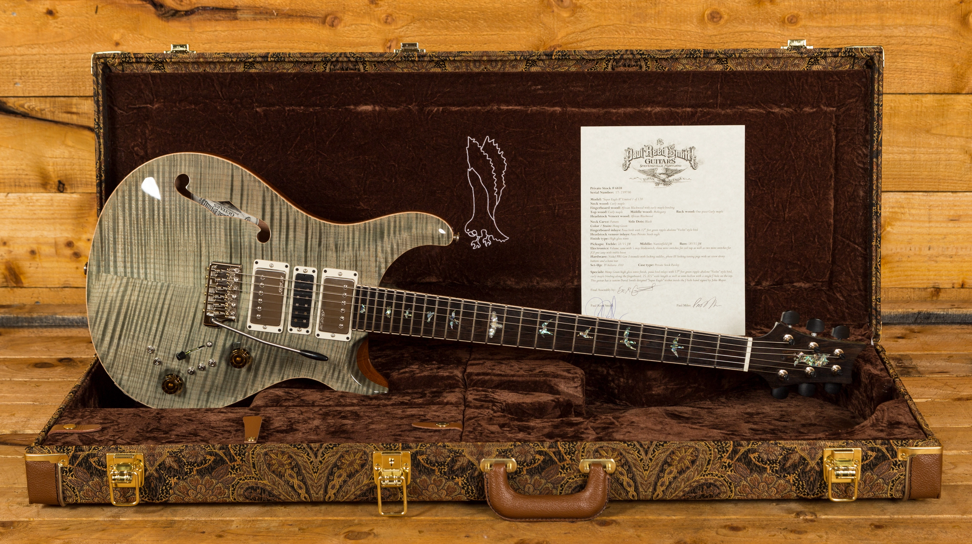 The Private Stock Super Eagle II is a highly-sophisticated instrument, one that pushes the boundaries of construction, design, and craftsmanship. The end result is an instrument that boldly promotes the PRS Private Stock culture of meticulous workmanship.