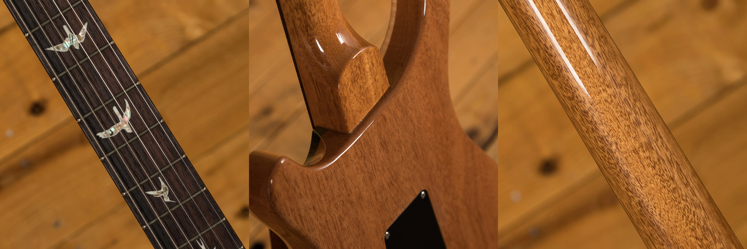 The 22 fret Mahogany neck features a Rosewood fingerboard and pattern profile, offering a warm tone and loads of sustain it feels great underhand. Proudly bearing the classic Mother of Pearl bird inlays, this is every bit the premium guitar.
