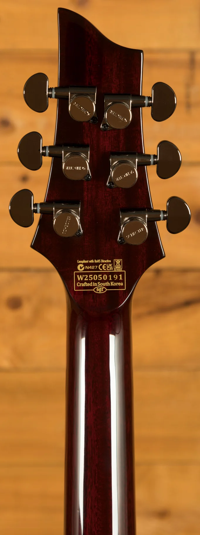 The Mahogany neck features a 2-way adjustable truss rod for a secure playing experience. The Rosewood fingerboard boasts Abalone Gothic Crosses and a Thin C profile, 24 X-Jumbo frets and a 14" radius, its fast and comfortable.