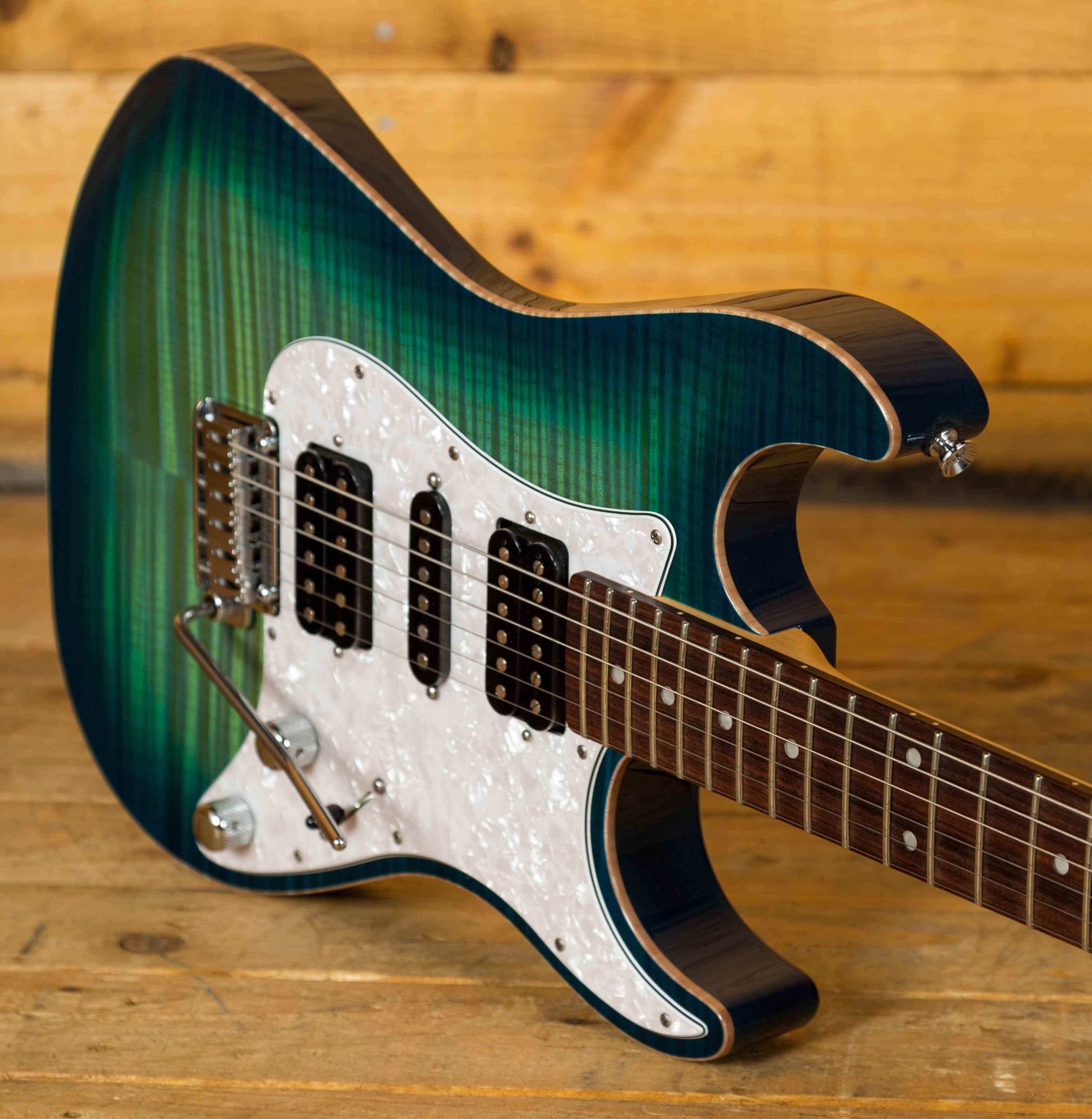This stunning Schecter Sunset Custom Model is finished in Carribean Burst and is loaded with the popular "Pasadena/VS1/Pasadena" pickup combination. Which gives you hot rodded PAF tones and glassy single coil cleans.