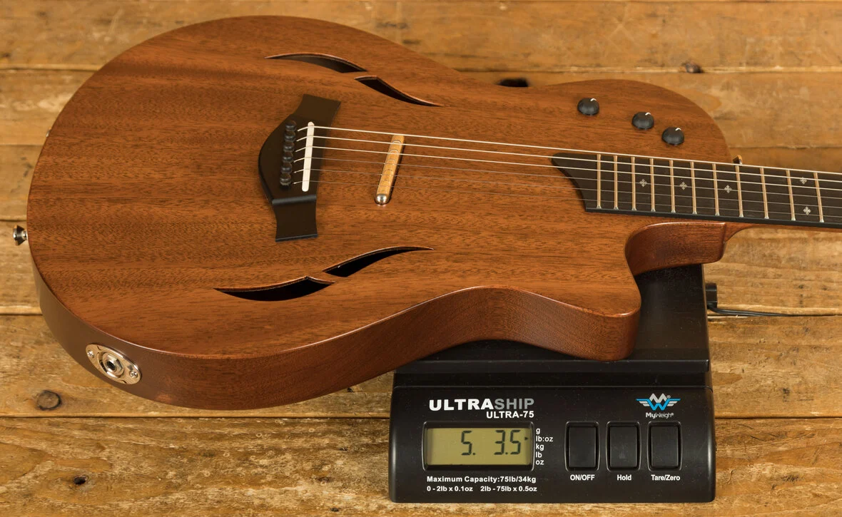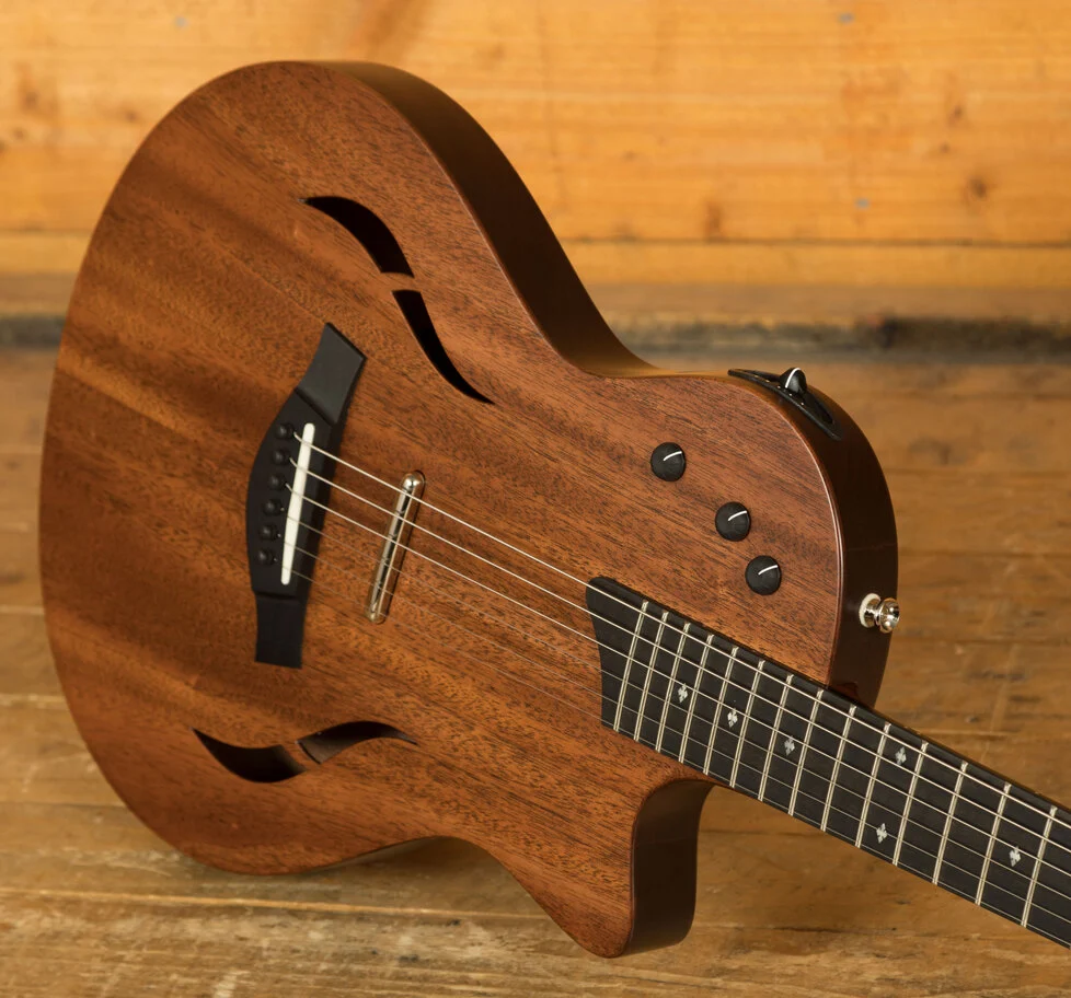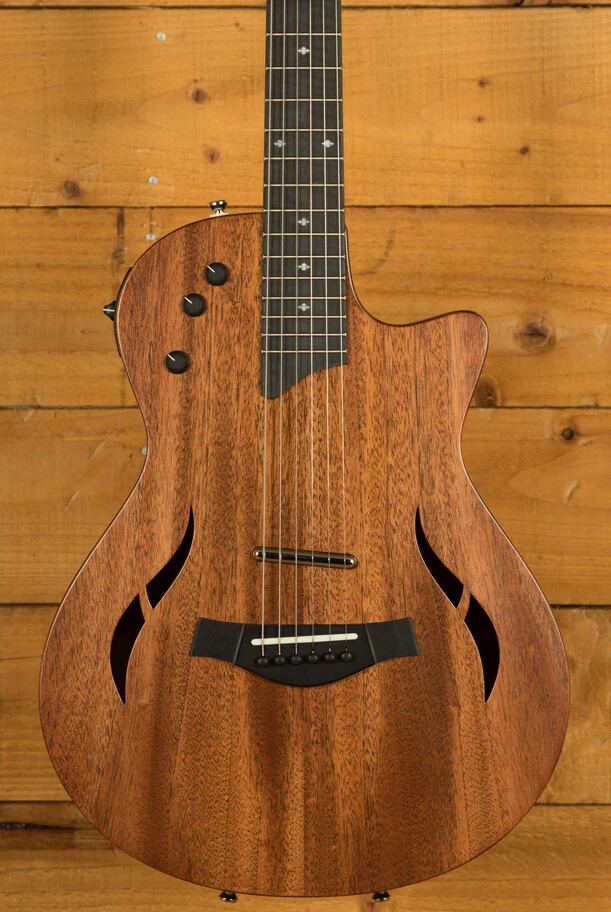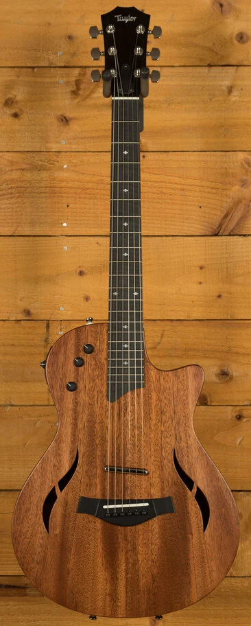 The hybrid hollowbody T5z Classic sits at the forefront of Taylor's innovation in guitar design, blending the fast feel and searing leads of an electric guitar with the warm sounds and natural overtones of an acoustic. Five-way switching controls three pickups for a truly malleable response, allowing you to shift from easy strumming to high-powered solo runs with the flick of a finger. The slender Taylor neck equipped with Jumbo frets makes for breezy bends and a relaxed feel, making this a perfect choice for everything from soloing in the limelight to recording song ideas at home. This model includes a deluxe padded gig bag.