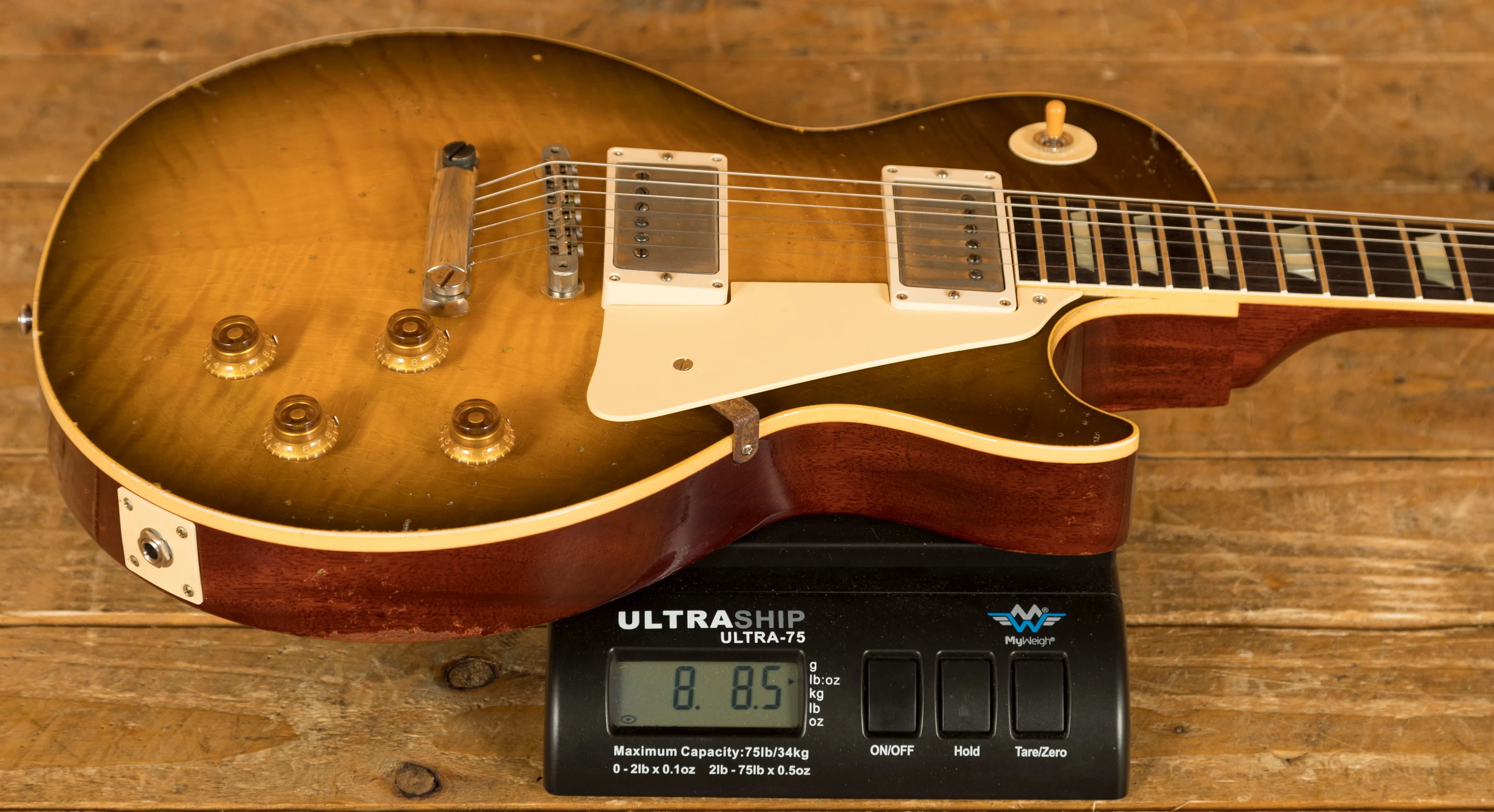 The solid Mahogany neck is topped with a crisp Indian Rosewood fingerboard with classic Gibson Trapezoid inlays, this guitar looks every bit the real deal. With a 24.75" scale length, 12" radius, 1.687" nut width and medium jumbo frets, it retains that classic Les Paul feel. The ABR-1 bridge and light weight stopbar offer an authentic vintage vibe.