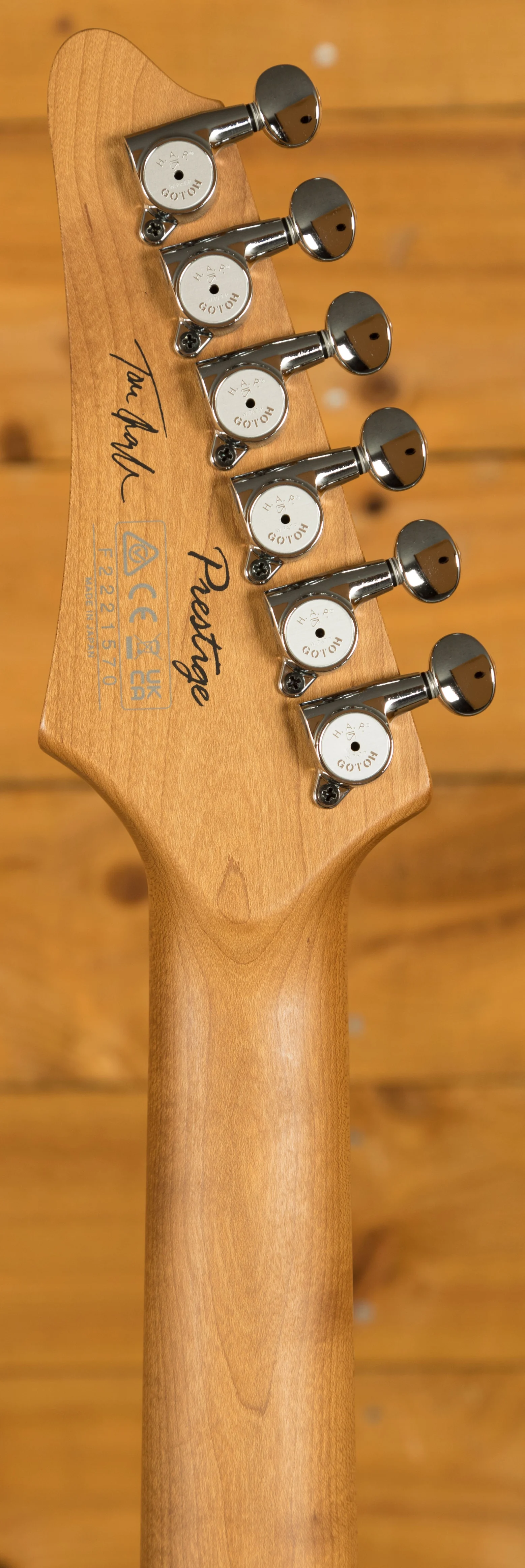 The TQMS1 features a maple top on an alder body bolted to an S-Tech roasted maple oval C shaped neck with a rosewood fingerboard with 22 stainless steel frets, mother of pearl dot position markers and luminescent side dots. Components include Seymour Duncan pickups with a Magic Touch mini-humbucker at the bridge and a Alnico Pro II Custom single-coil mounted in a traditional steel plate at the neck, a non-recessed T1802 two-point synchronised tremolo bridge with titanium saddles made by Gotoh, an oil-impregnated bone nut, an angled output jack and Gotoh locking tuning machines with height-adjustable posts.