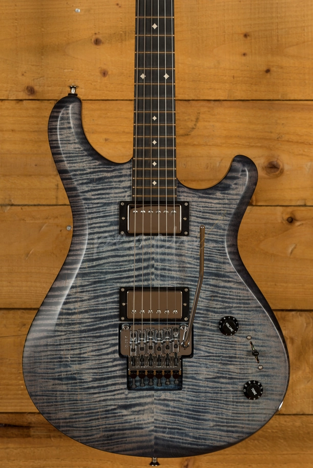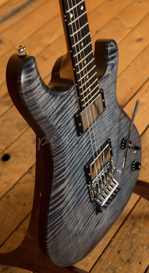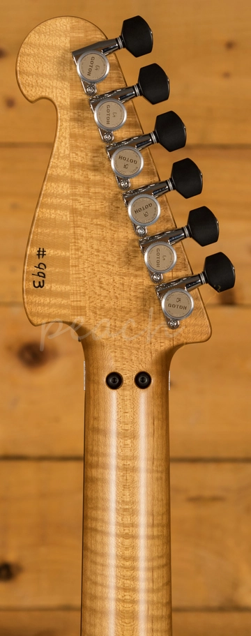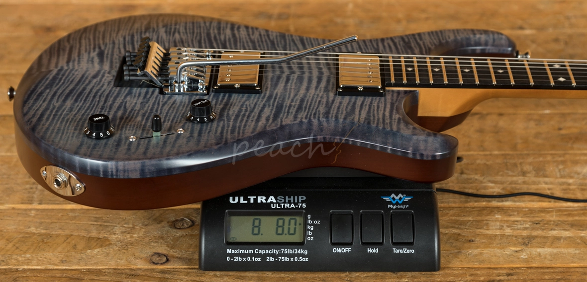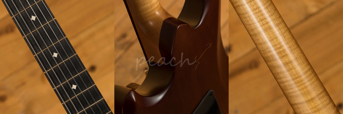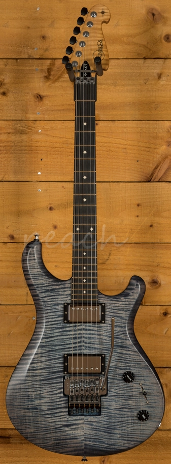 The Maple neck features a Macassar Ebony fingerboard with diamond inlays and boasts an old school 6 in a line headstock. Its smooth, beautifully finished and poised, with great access right up the neck this guitar is at home playing a wide range of styles. With Gotoh locking tuners and a Floyd Rose tremolo bridge, this guitar has great tuning stability and offers a playing experience unlike any other.
