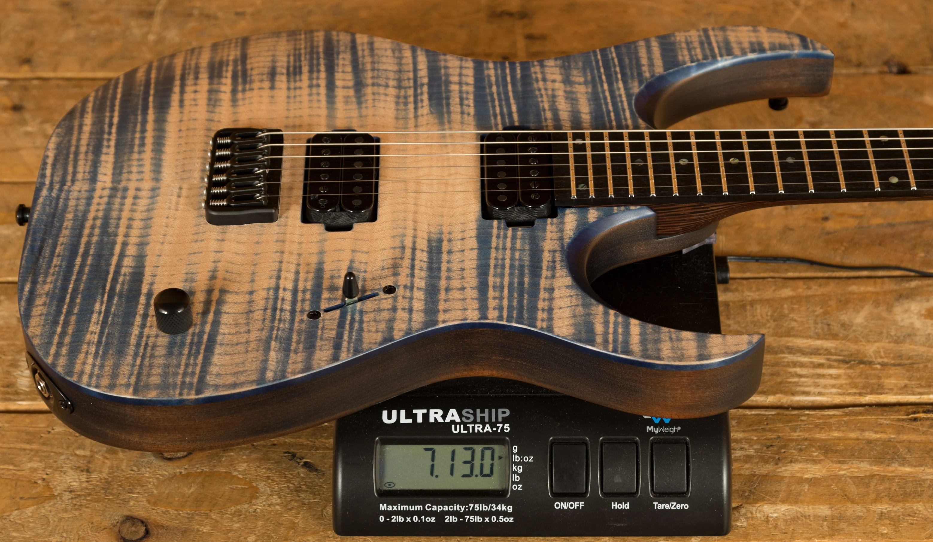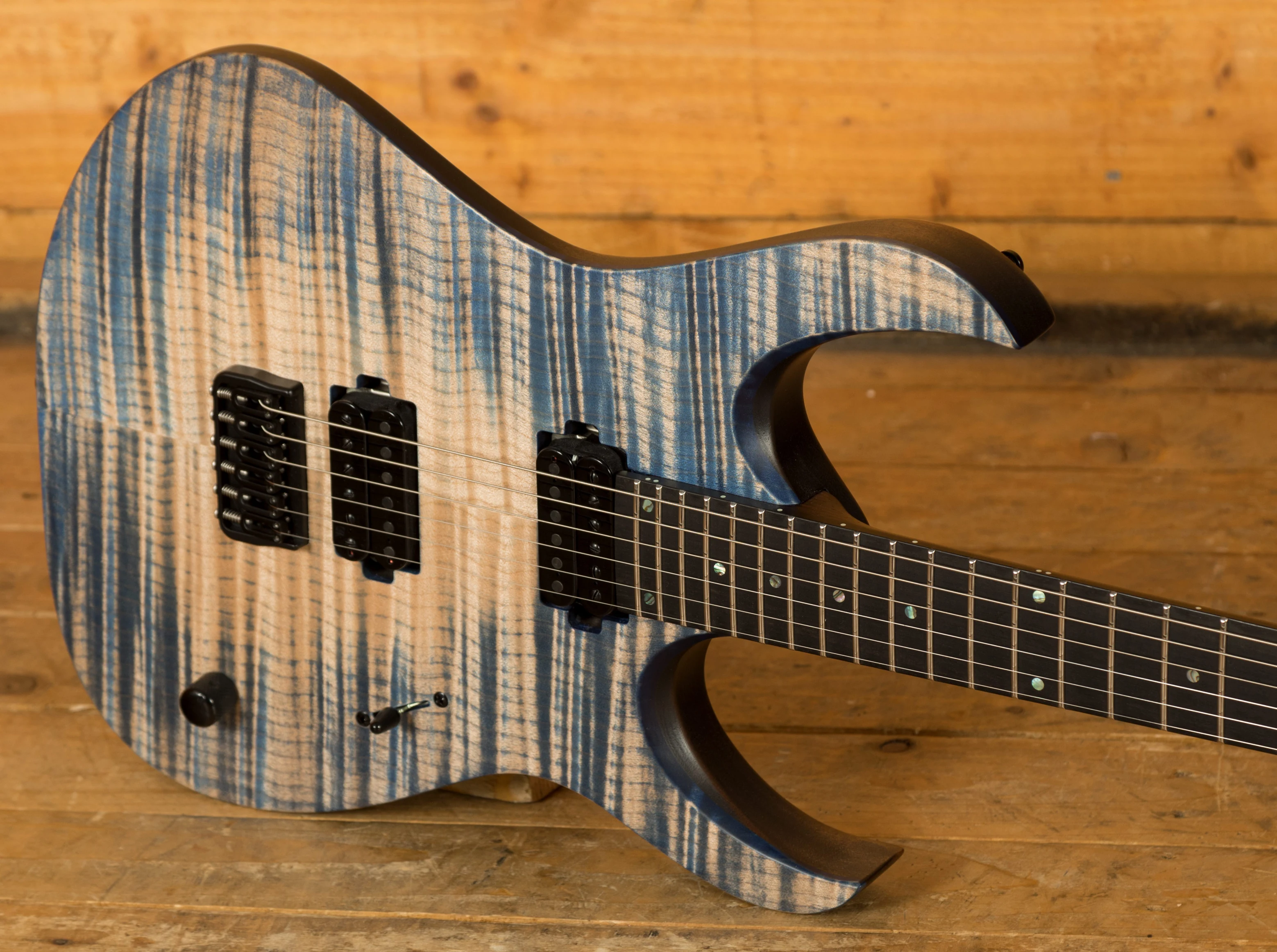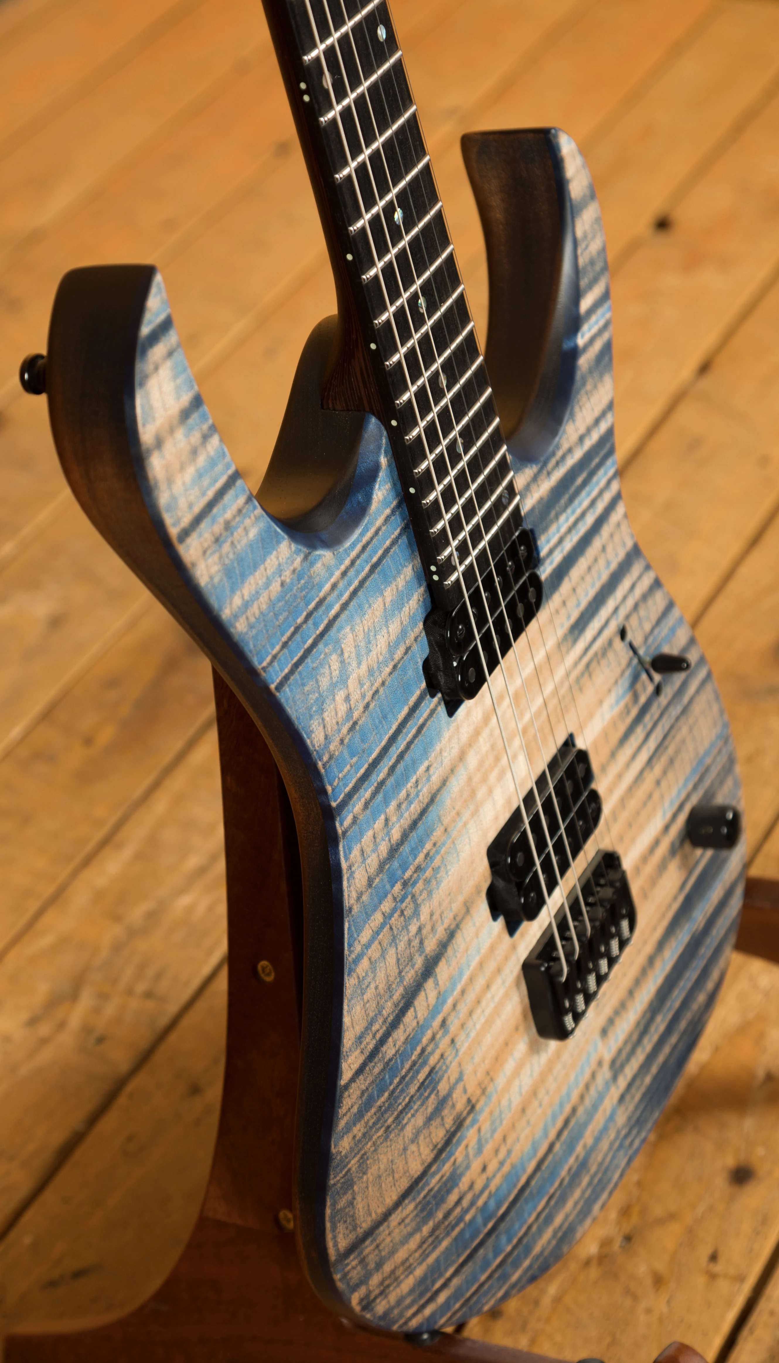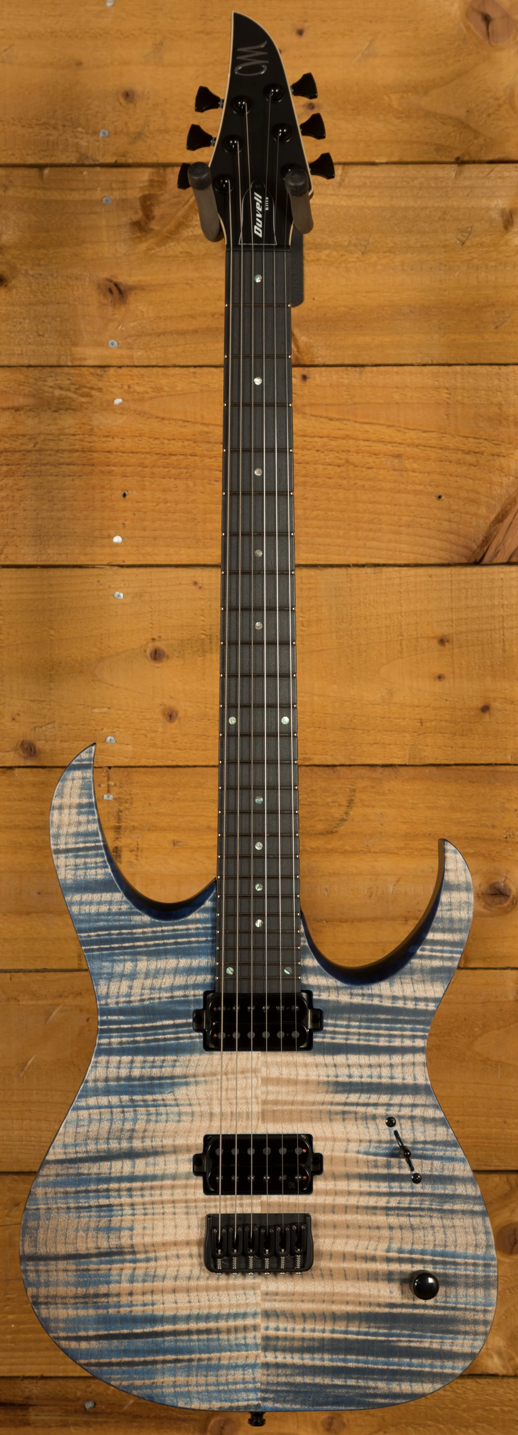 With a Mahogany body and a 4A Flamed Maple top, the Duvell Elite 6 benefits from a beautiful Blue Feather Matt finish which allows you to really appreciate the quality of the top. It's beautifully poised, balanced and allows great access right up the neck.