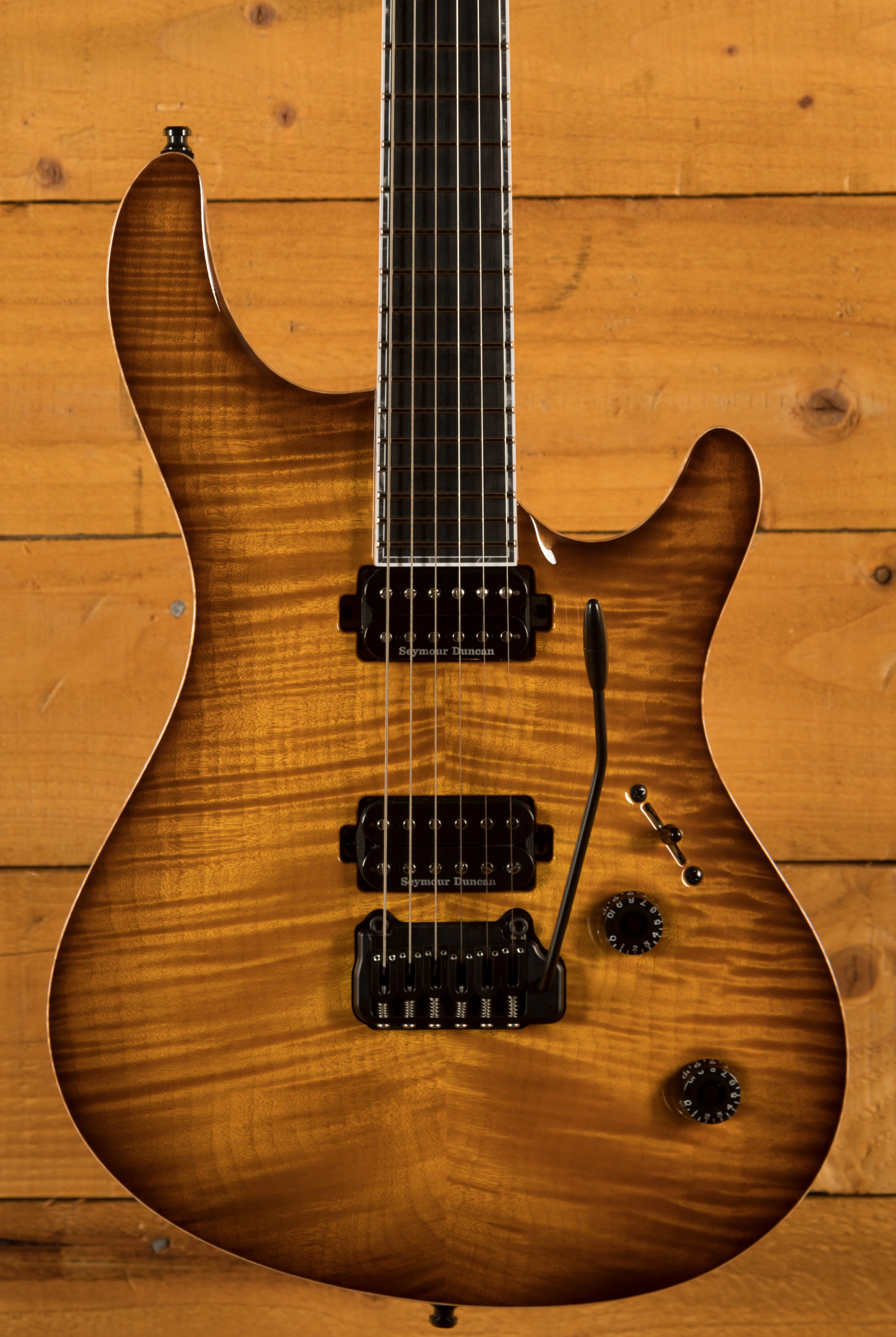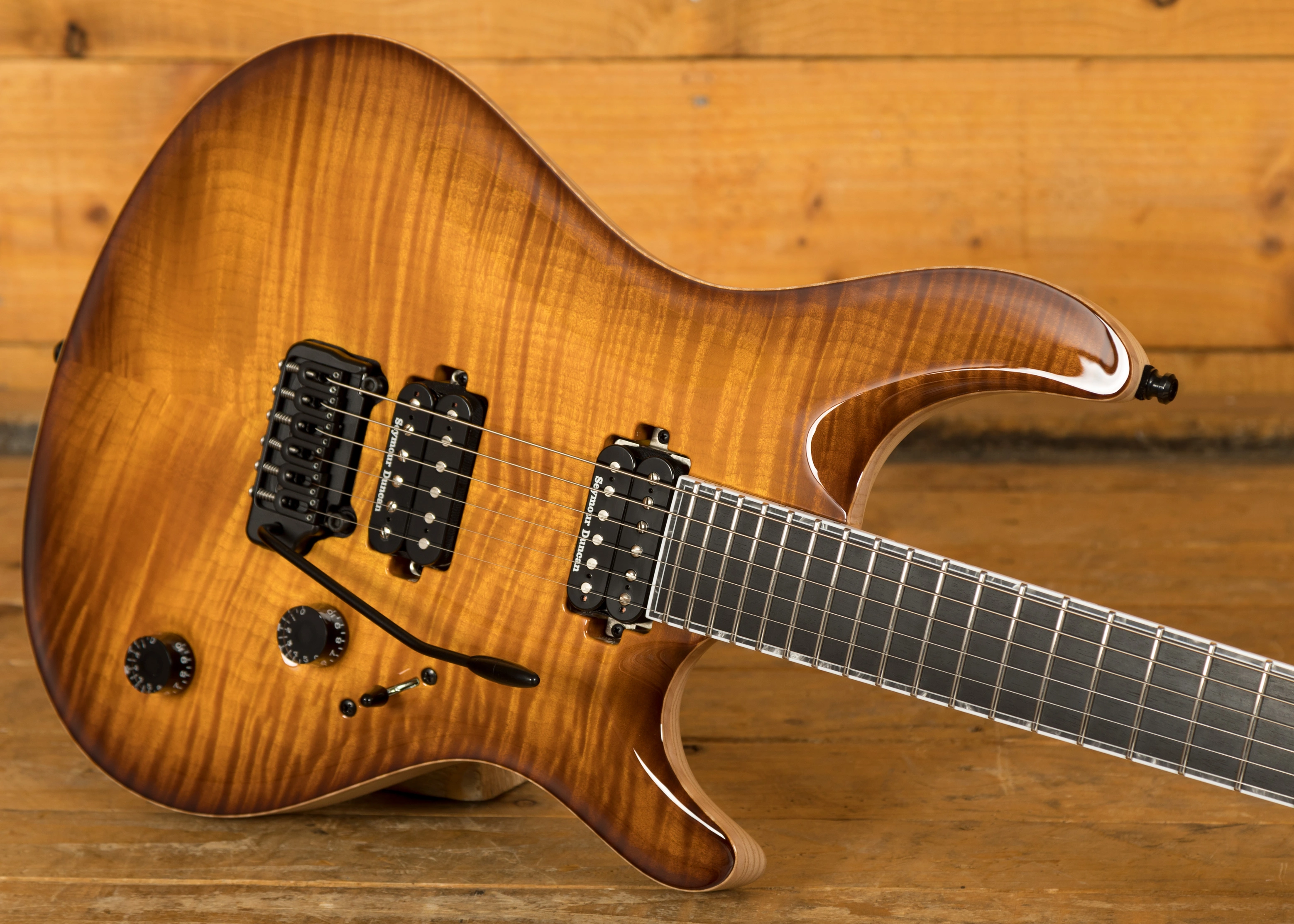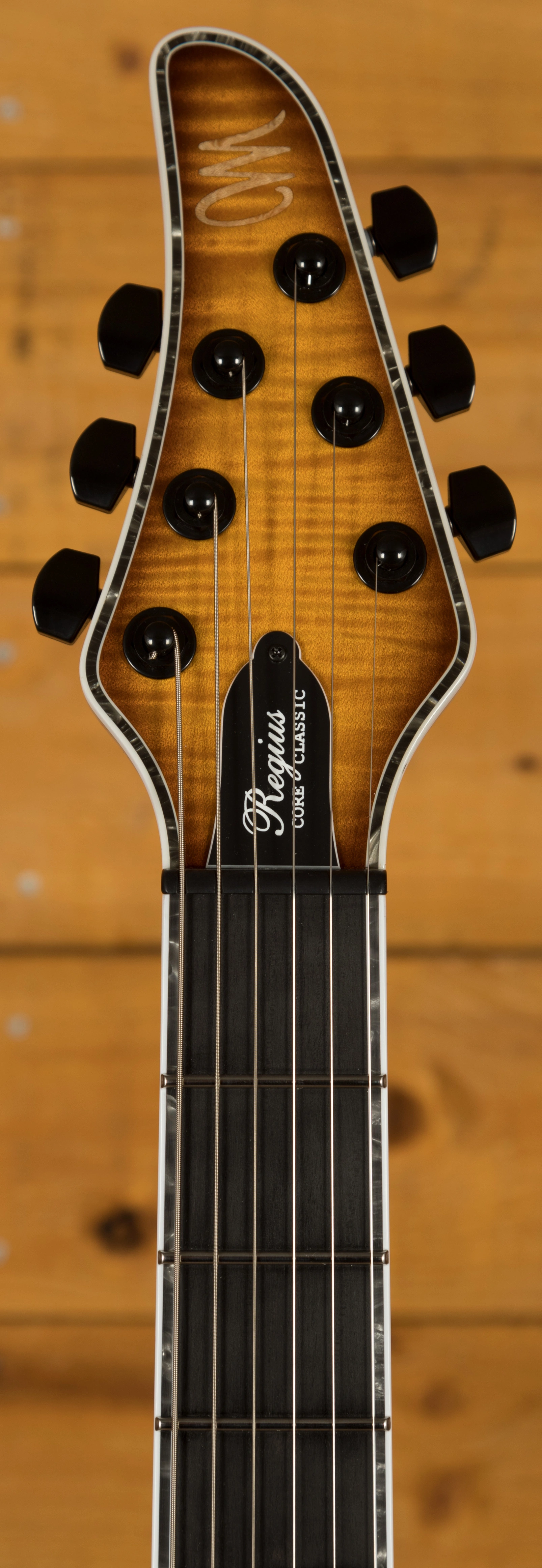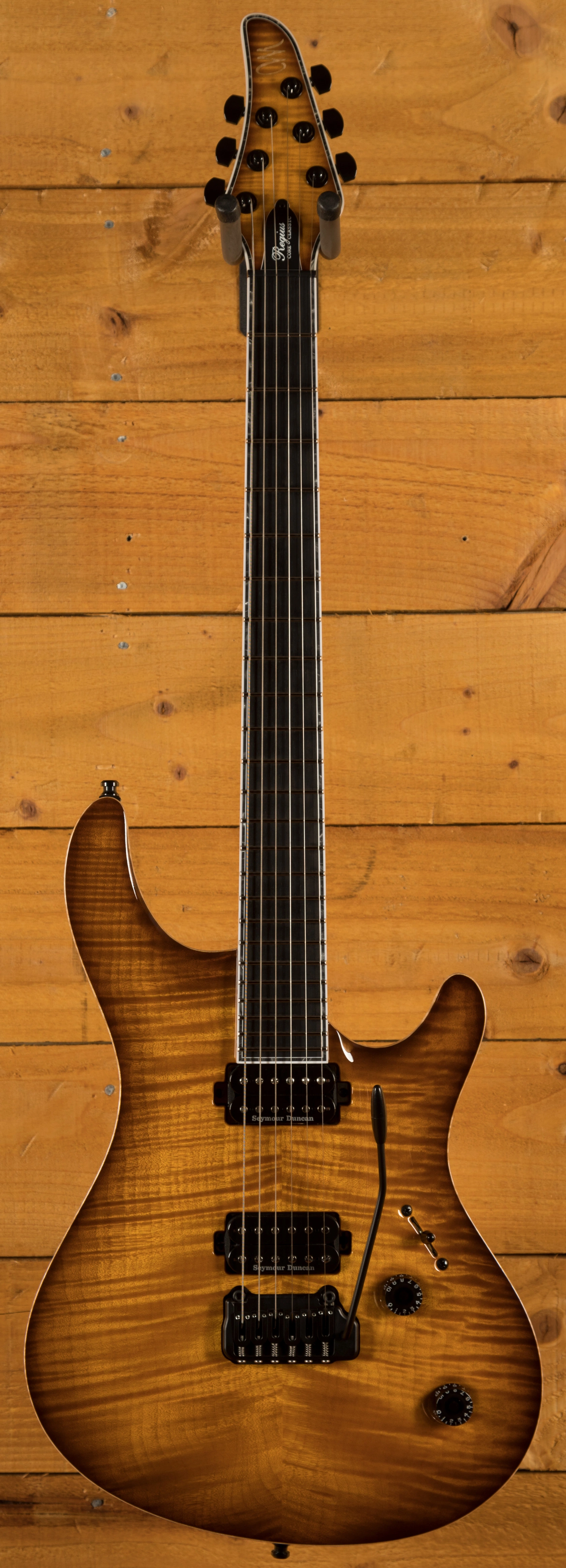 With a profiled Swamp Ash body, the Regius CC benefits from a 4A Flame Maple top with an Amber Burst Gloss finish which allows you to really appreciate the quality of the top. It's beautifully poised, balanced and allows great access right up the neck.