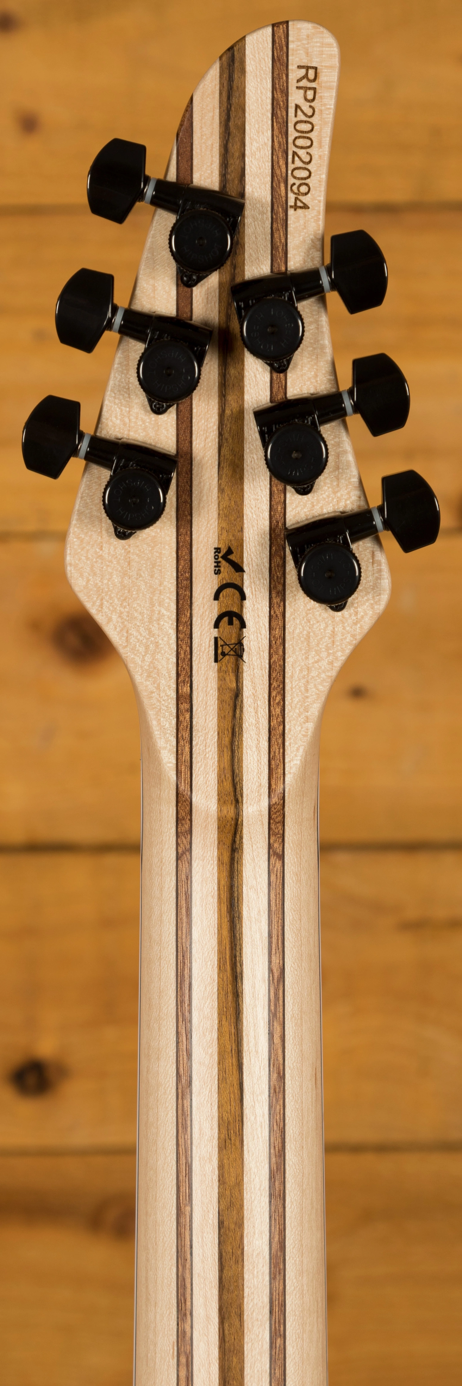 The Maple neck thru body boasts a slick Ebony fingerboard, with 24 stainless steel frets and a 25.4" scale length, its comfortable and fast. The 16" radius feels great under hand and offers a platform perfect for both low end riffing and treble side lead work.