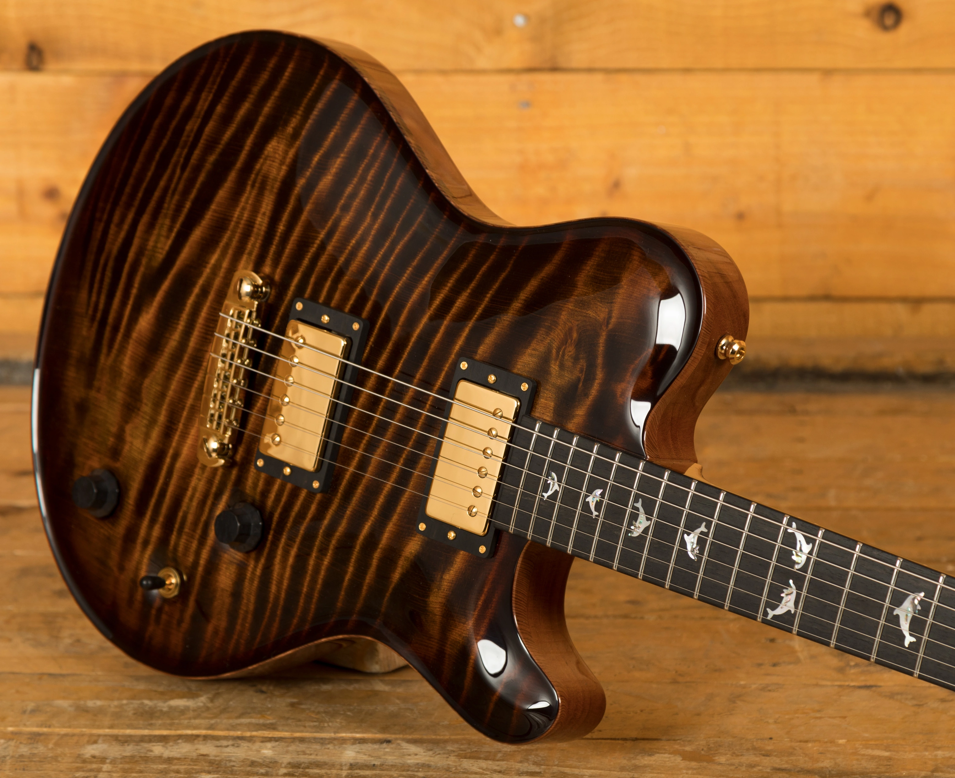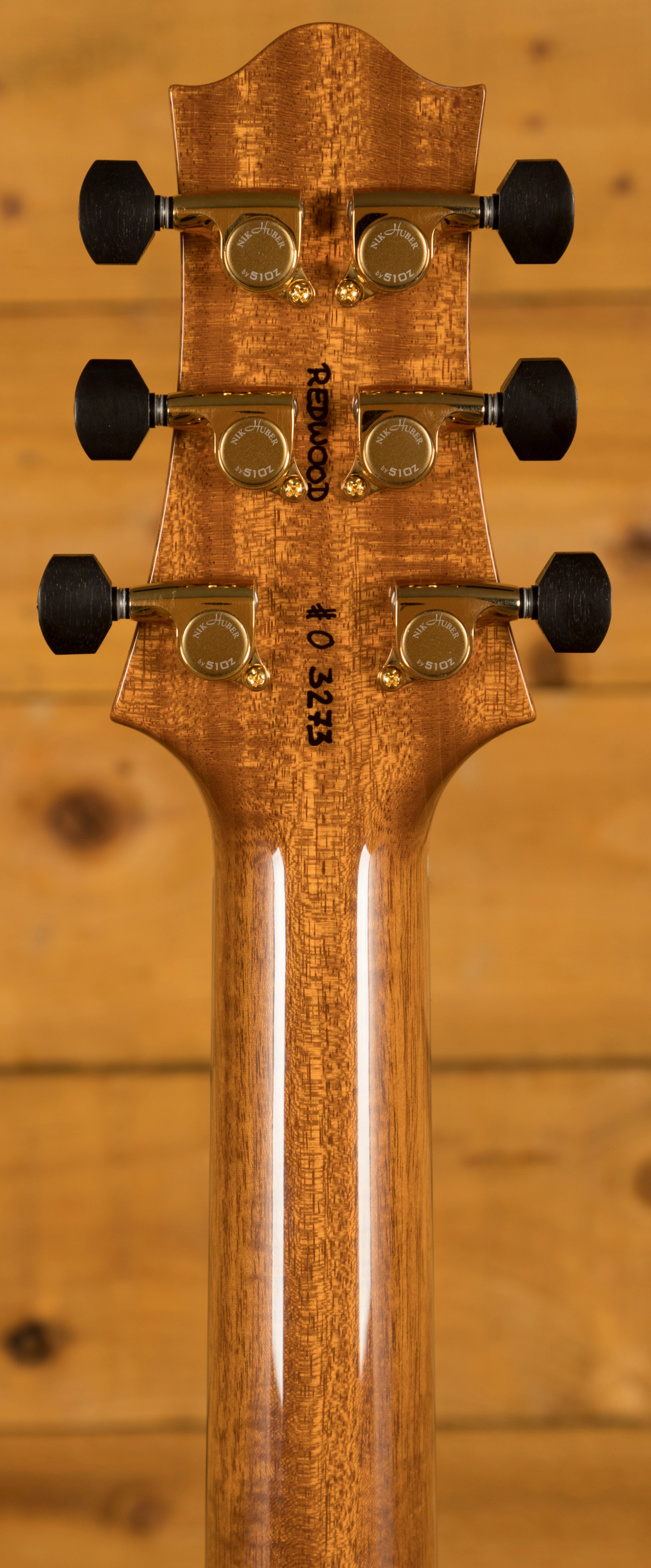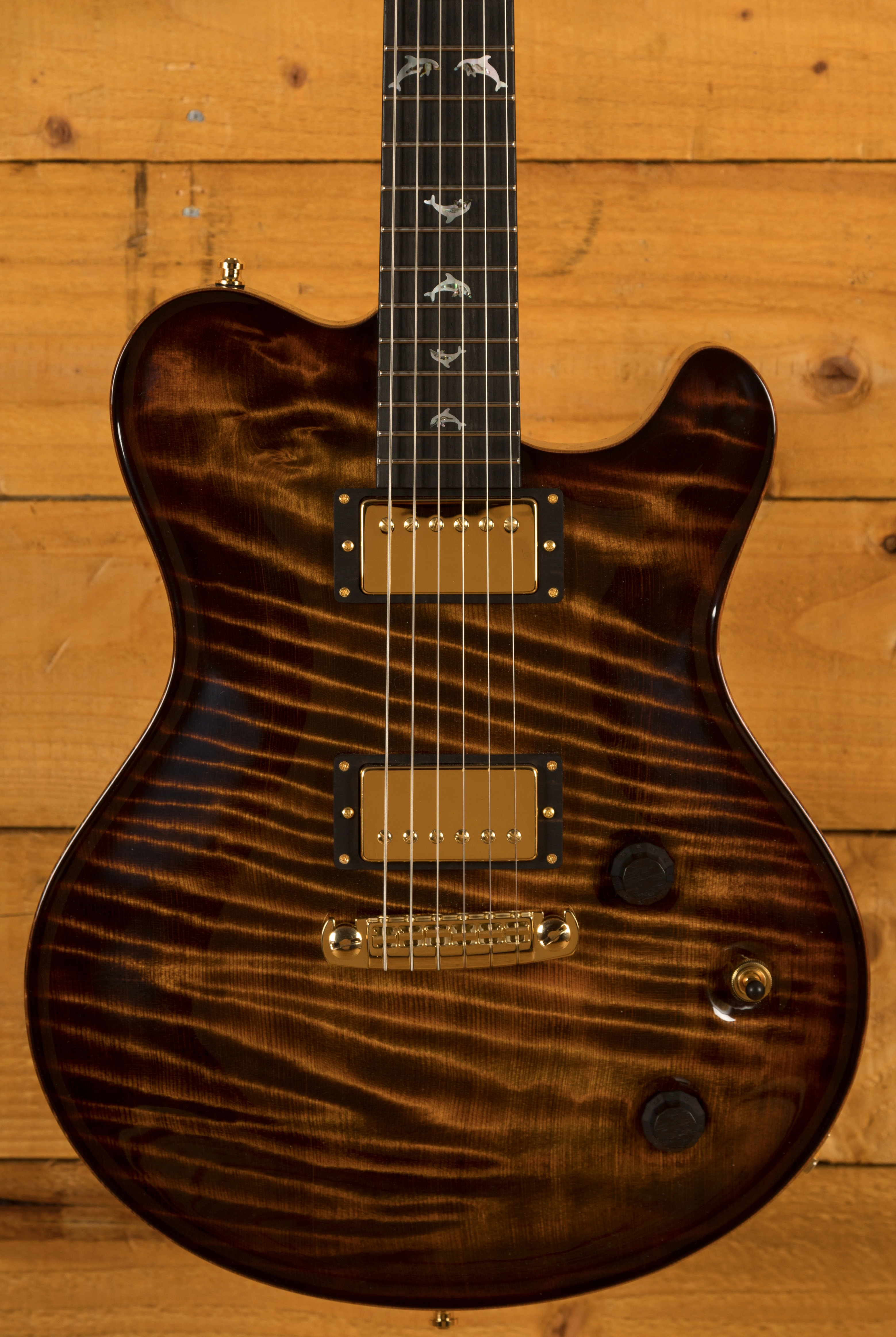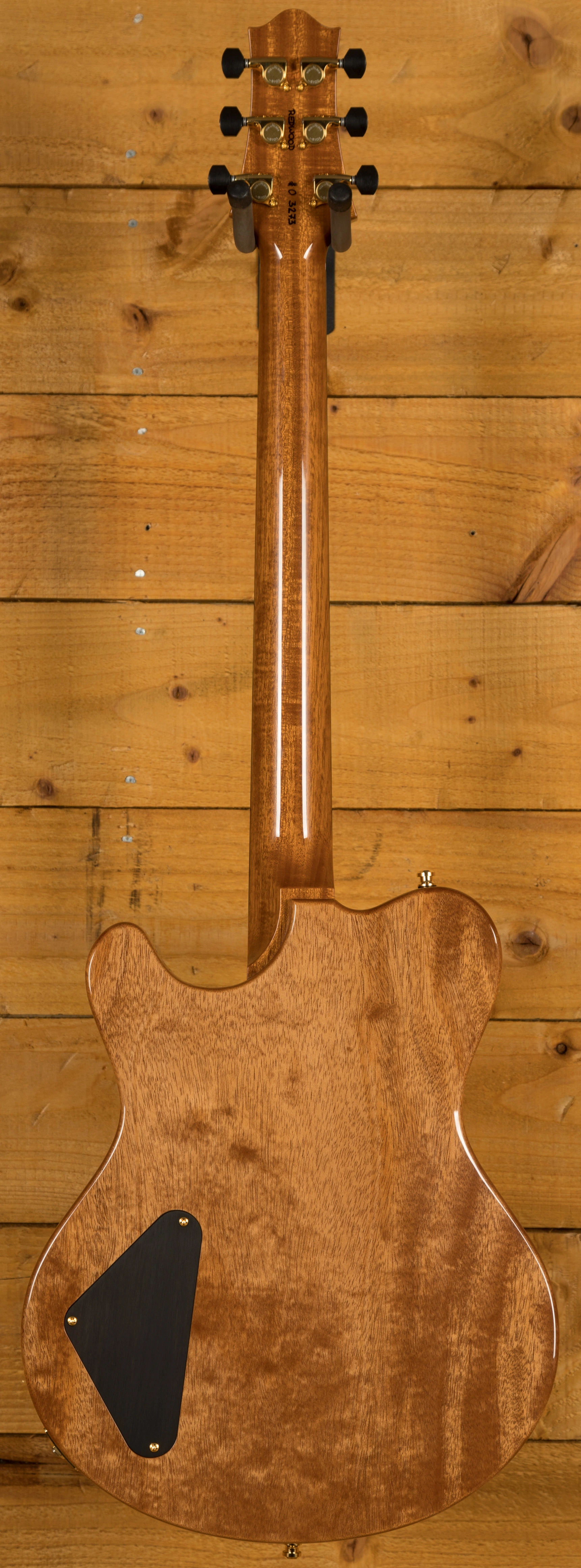 The Redwood is one of the most special models in the Huber arsenal, designed for finesse and style, its beauty is in the intricacy of its design. This super delicious version features a semi hollow Mahogany body with an Exceptional Curly Redwood top, it is beautifully balanced and poised and the Tigereye High Gloss finish is just stunning, the perfect compliment to the Gold hardware.