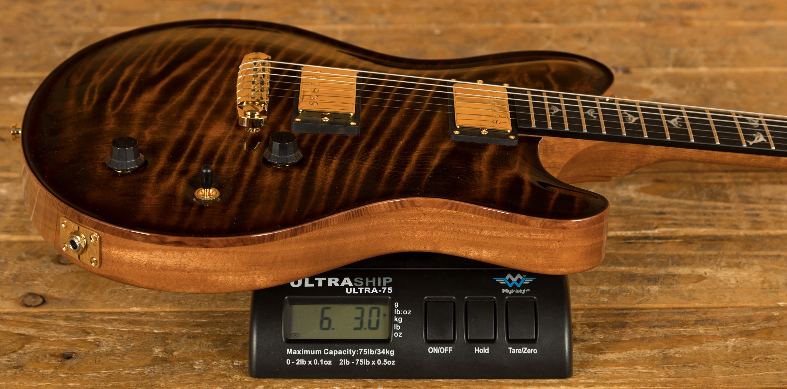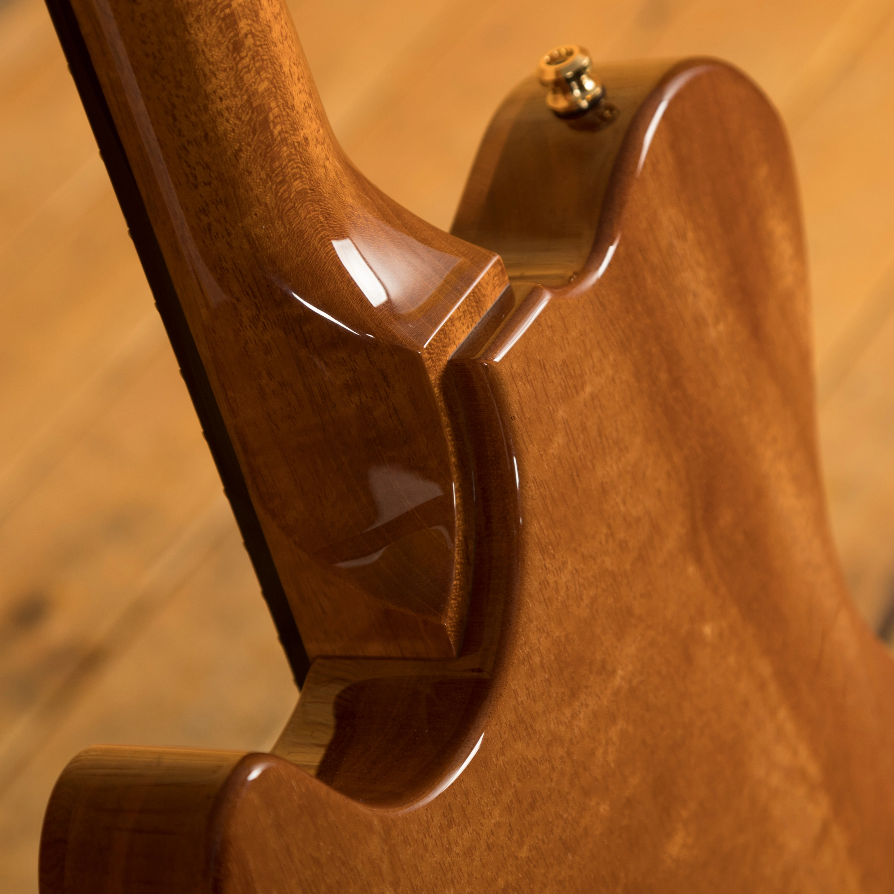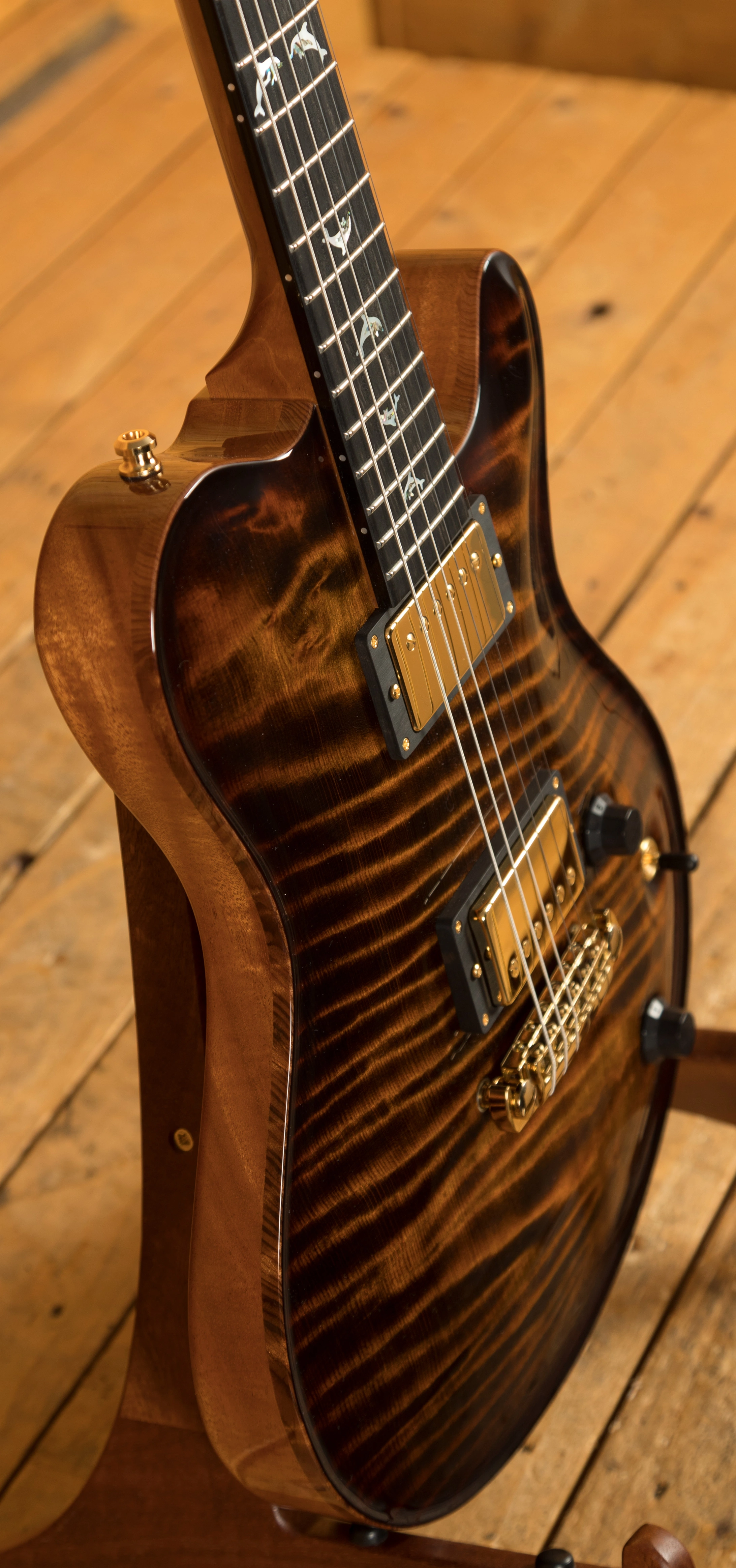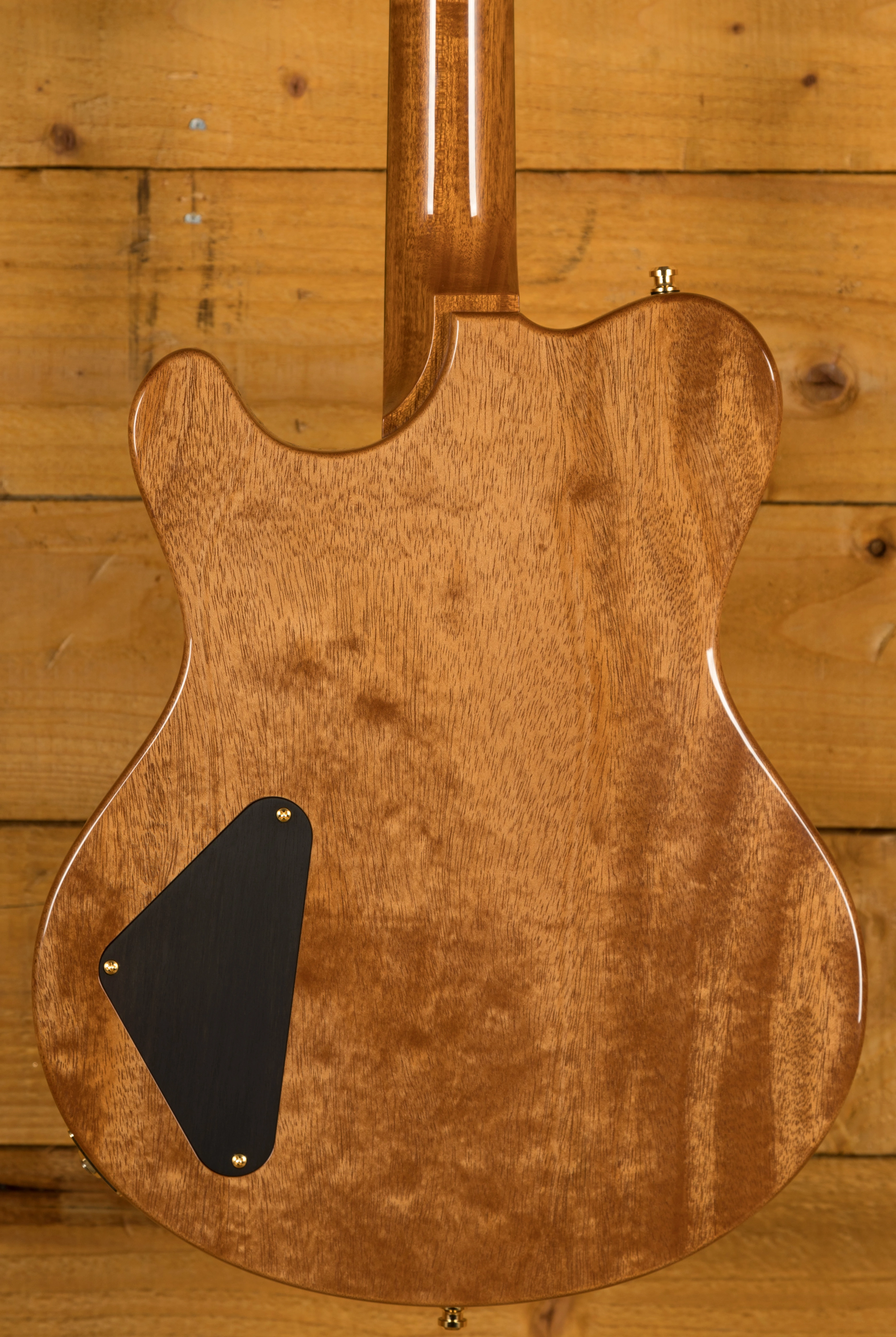 The Redwood is one of the most special models in the Huber arsenal, designed for finesse and style, its beauty is in the intricacy of its design. This super delicious version features a semi hollow Mahogany body with an Exceptional Curly Redwood top, it is beautifully balanced and poised and the Tigereye High Gloss finish is just stunning, the perfect compliment to the Gold hardware.