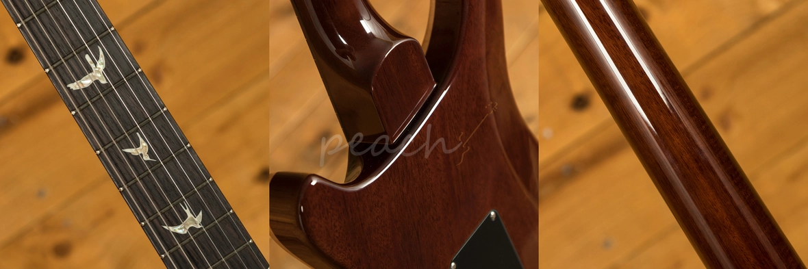 A comfortable 22 fret Rosewood fingerboard proudly bears the signature PRS birds and its 25" scale length Mahogany neck, with a pattern profile, offers a comfortable and stable performance. With the PRS patented Gen III tremolo and Phase III locking tuners, you get flawless tuning stability and great intonation, the trem is super responsive and allows you to add some lush texture to your sound.