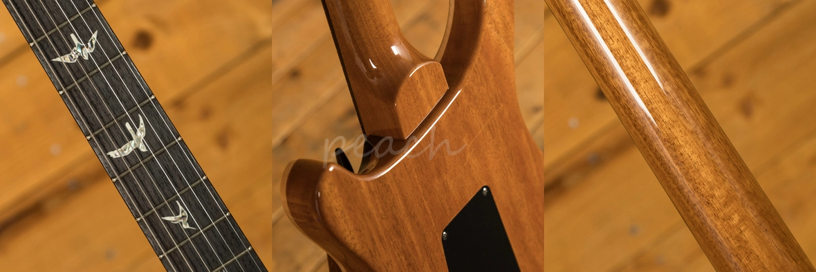 A comfortable 24 fret Rosewood fingerboard proudly bears the signature PRS birds and its 25" scale length Mahogany neck, with a pattern regular profile, offers a comfortable and stable performance. With the PRS patented Gen III tremolo and Phase III locking tuners, you get flawless tuning stability and great intonation, the trem is super responsive and allows you to add some lush texture to your sound.