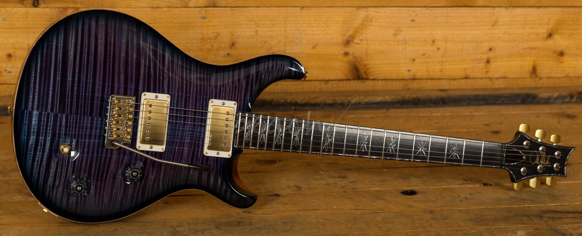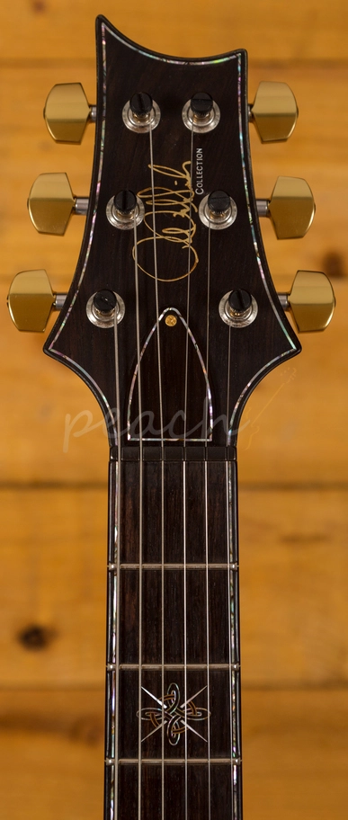 The Curly Maple neck features the PRS Pattern neck-carve. The African Blackwood fingerboard is immaculate and of course no PRS neck would be complete without some stunning inlays, 14 Karat Gold and Mother of Pearl hollow Celtic knots offer the most premium touch. Sitting proudly atop the headstock is a hand written PRS signature and Collection inlay with green select abalone purfling.