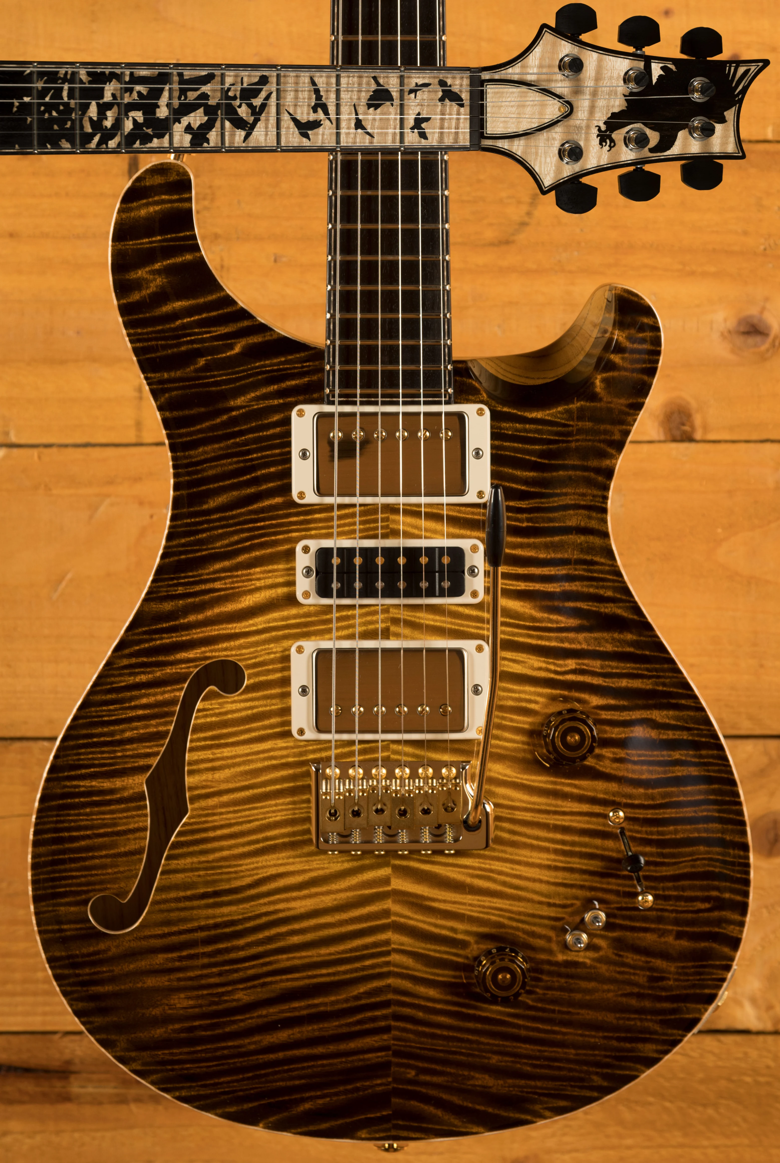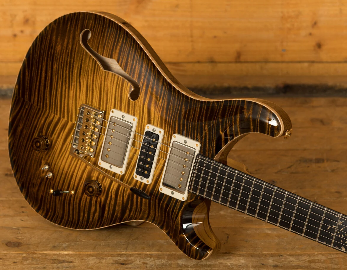 Sporting a pristine Curly Maple top picked from the PRS Private Stock Vault, which is finished in the incredible Tiger Eye Glow high gloss nitro, this Special Semi-Hollow benefits from a lightweight Swamp Ash body for a tonewood match made in heaven. Rich, resonant and tonally versatile, this is the epitome of high end performance.