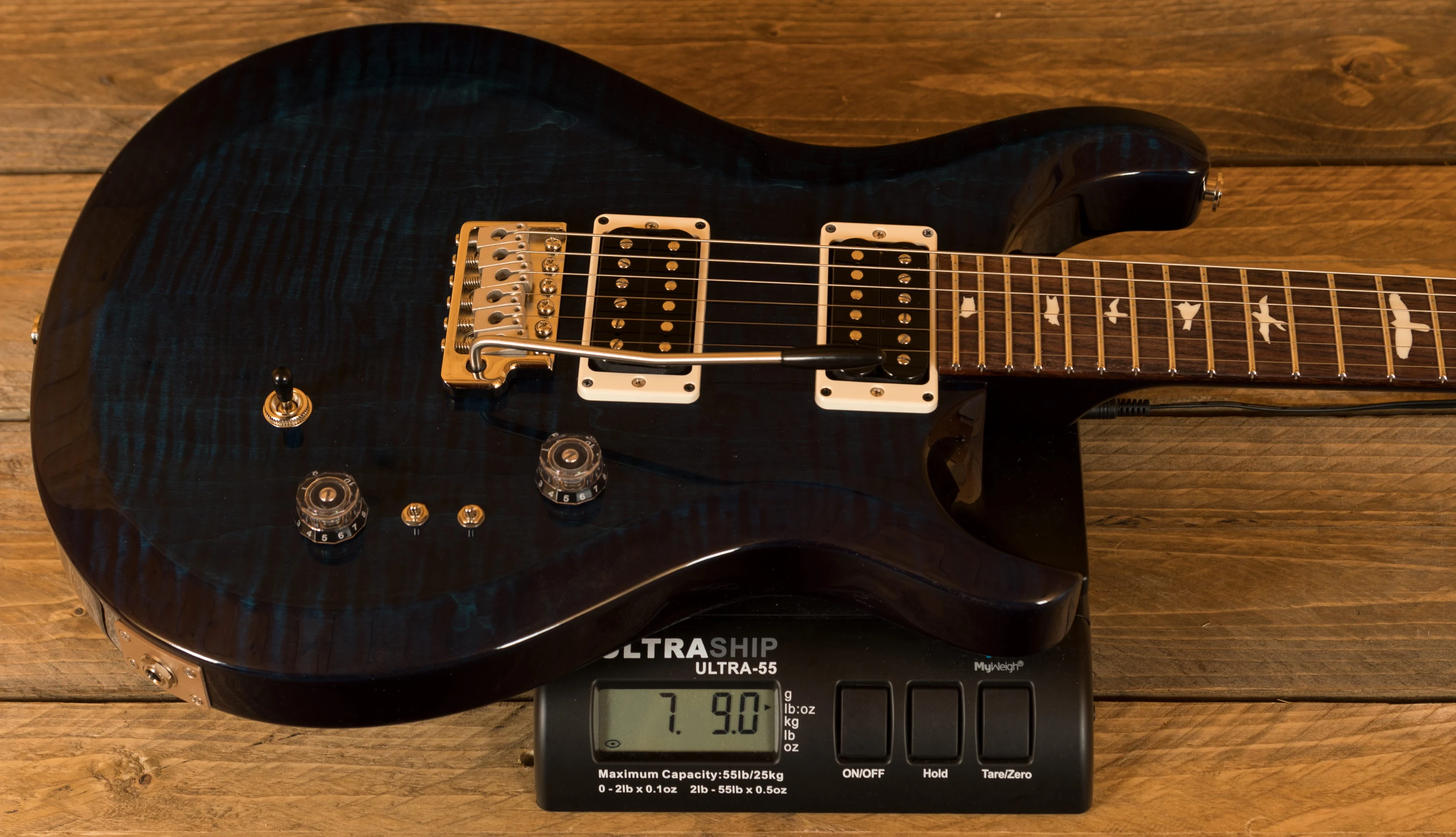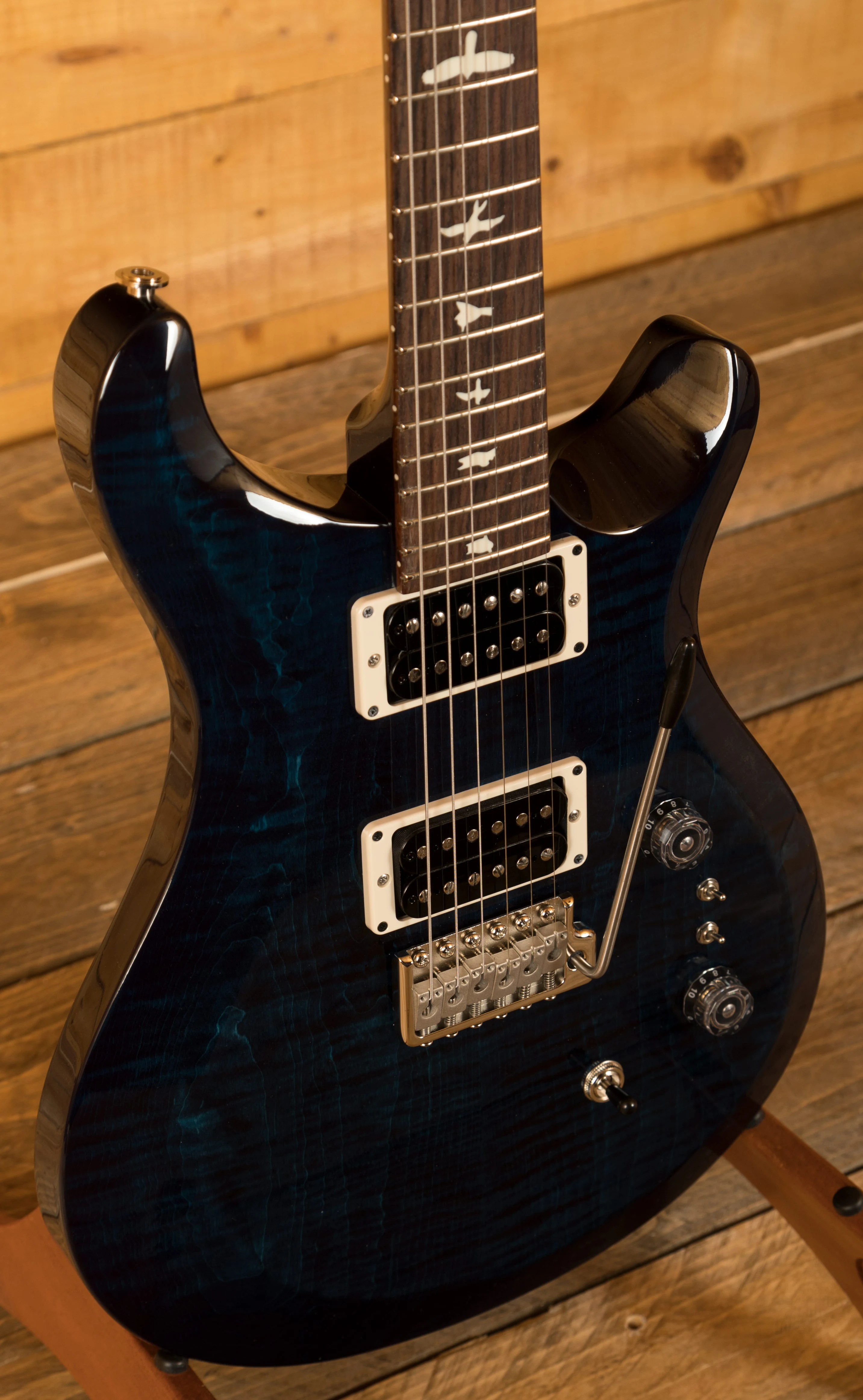 The Mahogany body with Maple top offers a rich warmth and depth that complements the beautiful Whale Blue finish. With a Pattern Regular profile, 25" scale length and of course, 24 frets, the Mahogany neck feels really comfortable and familiar. The iconic PRS birds sit proudly atop the Rosewood fingerboard for the definitive PRS experience.