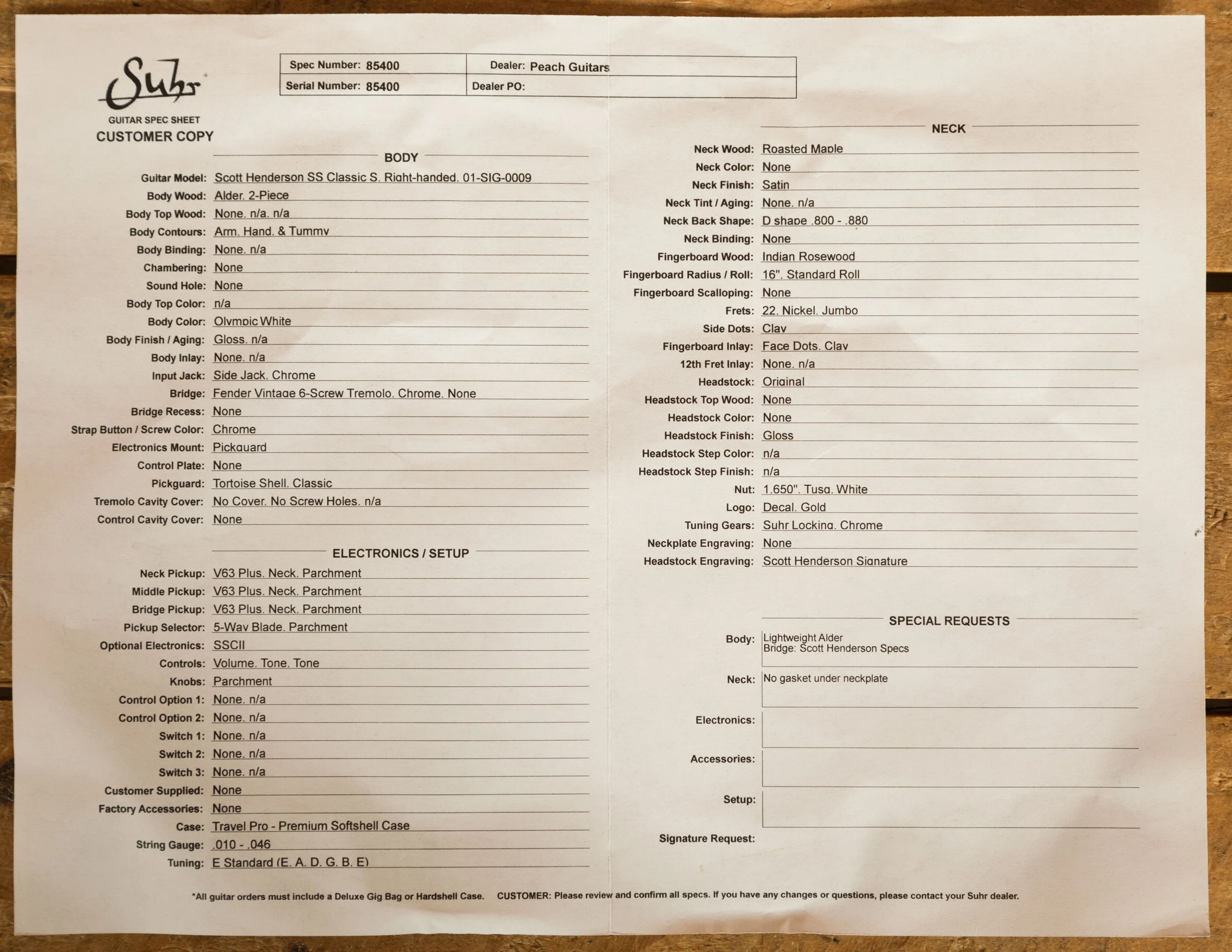 With Suhr locking tuners, a 1.650" Tusq nut, and a modified Fender Six Screw bridge with custom made steel block and shortened steel trem arm, this really is one of the finest strat-style guitars around.